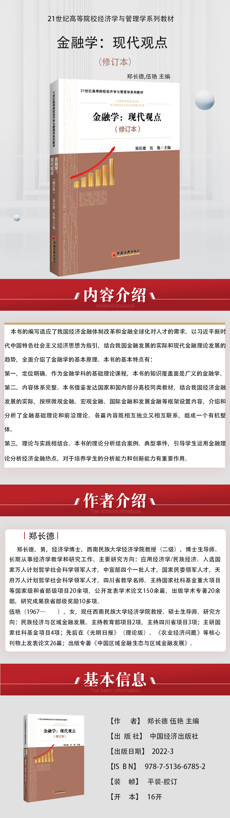 *,内容体系完整。本书借鉴发达国家和国内部分高校同类教材,结合我国经济金融发展的实际,按照微观金融、宏观金融、国际金融和发展金融等框架设置内容,介绍和分析了金融基础理论和前沿理论。各篇内容既相互独立又相互联系,组成一个有机整体。