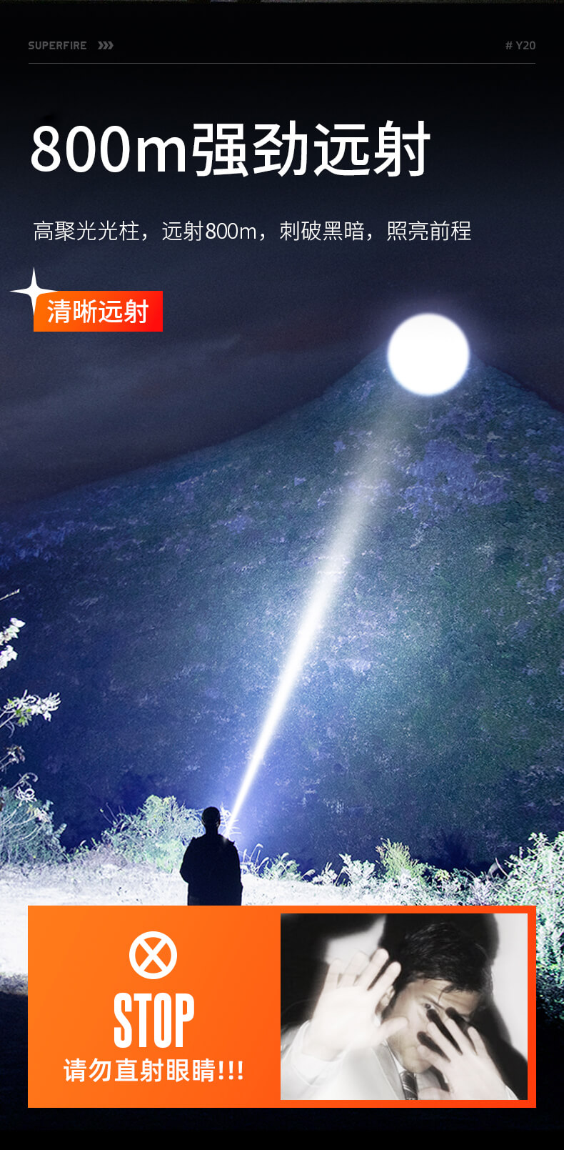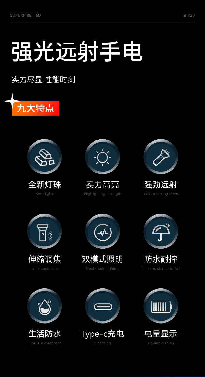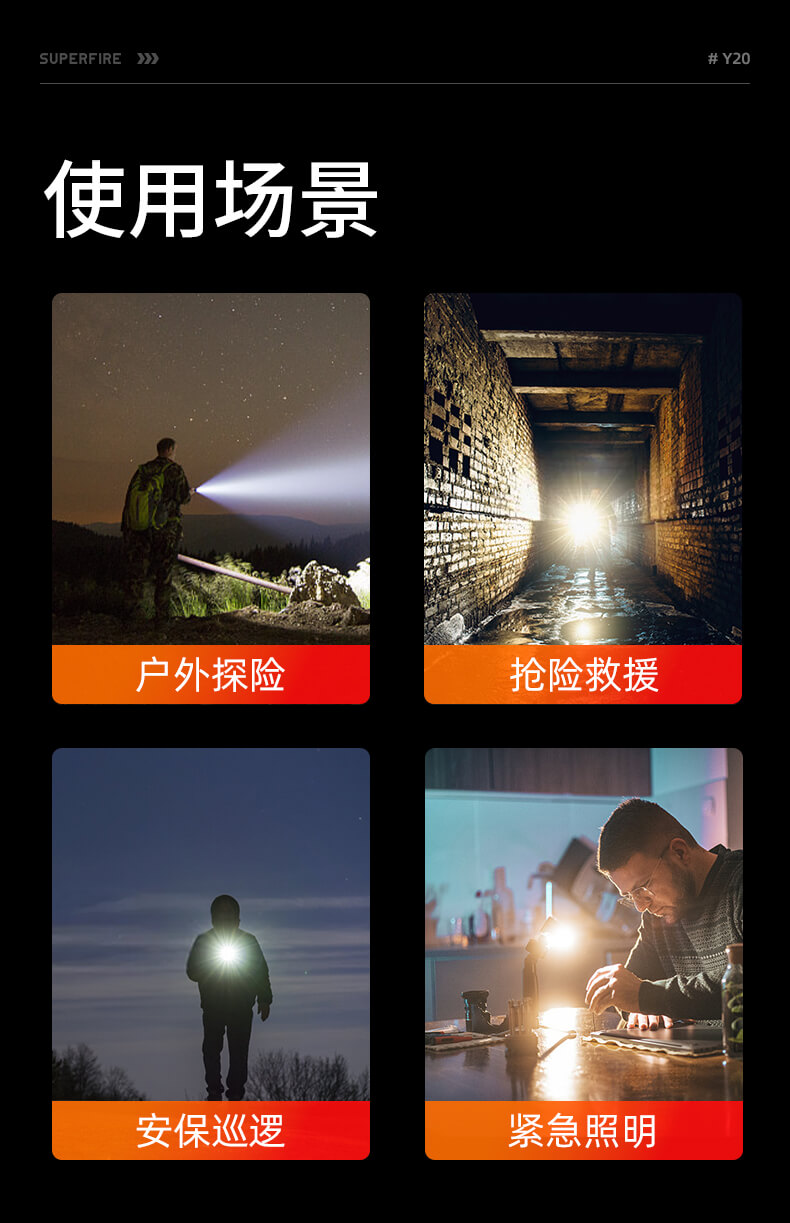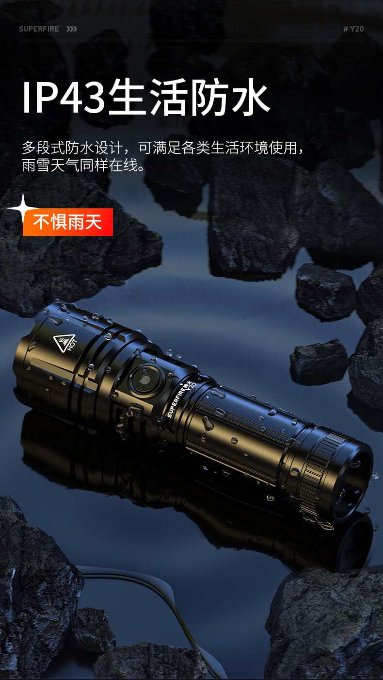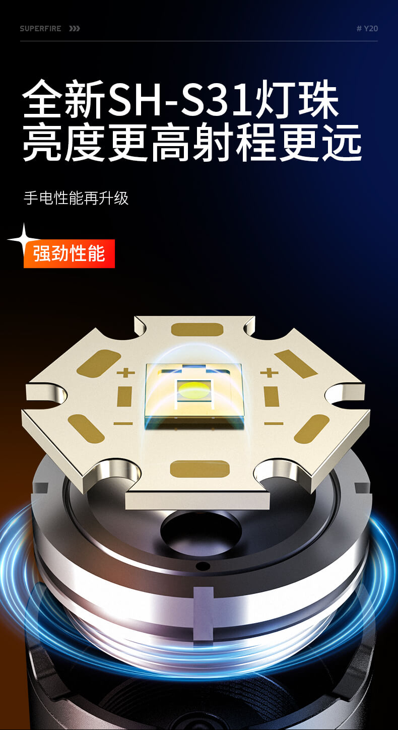 SUPERFIRE神火Y20手电筒变焦强光超亮远射可充电led户外家用应急手电
