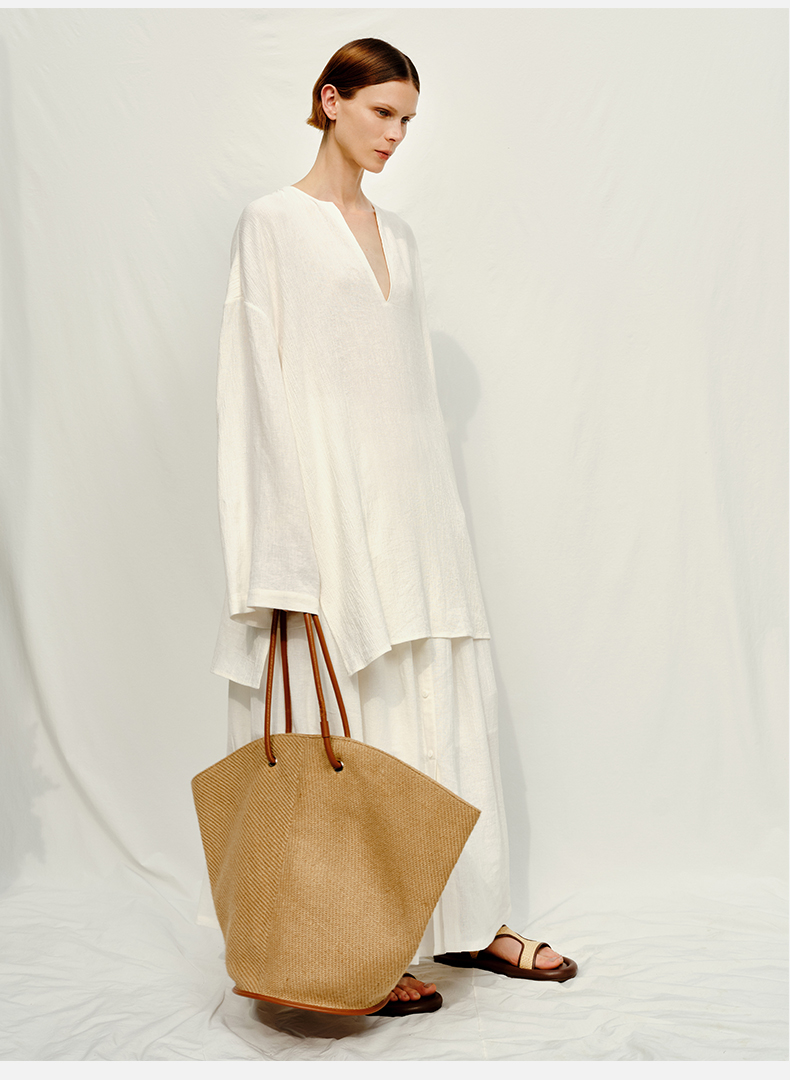 HIDEMI 懒人必备/奶昔白肌理感亚麻套装 圆领衬衫/垂直感侧开衩长裤