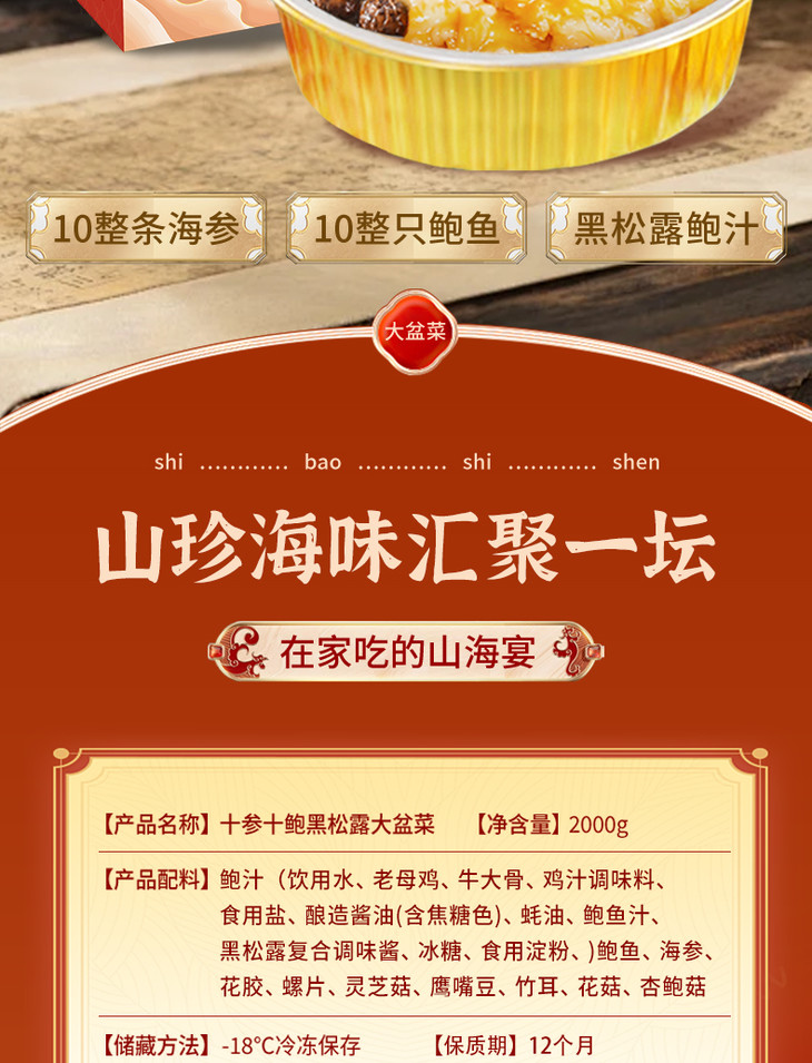 【十参十鲍❗️黑松露鲍汁大盆菜】净含量2000g甄选品质原料,鲍鱼/海参/花胶/海螺片/林芝菇/鹰嘴豆/竹耳丝/花菇/杏鲍菇等 ,冷链配送到家,中秋节日春节过年团圆家宴送礼佳品L