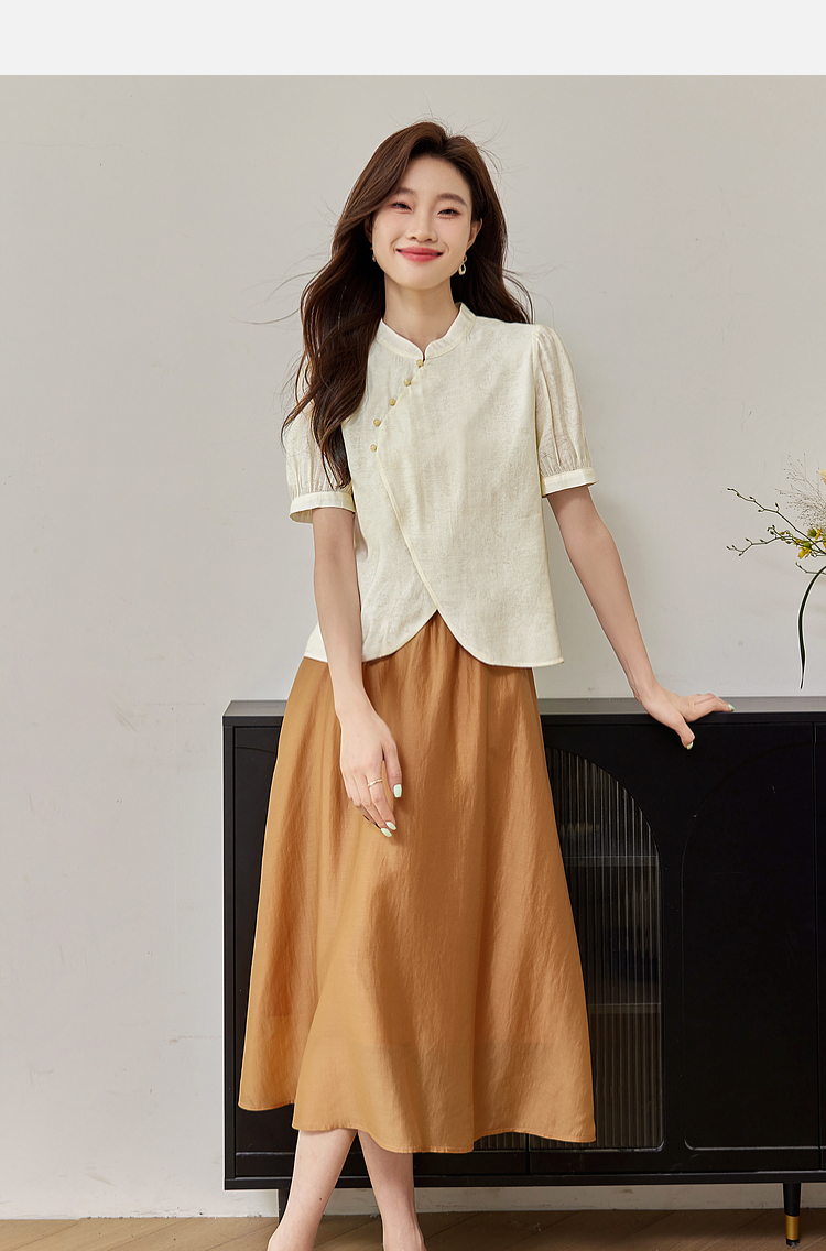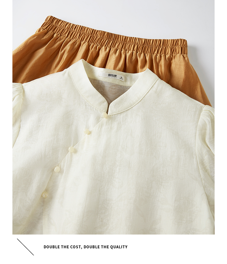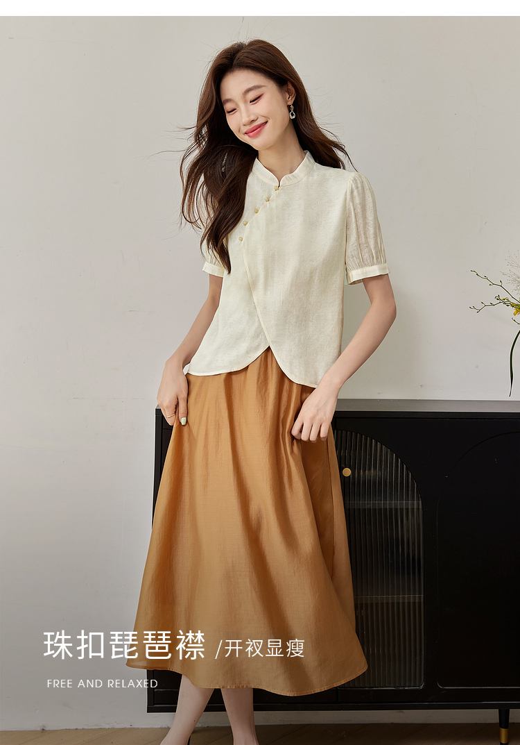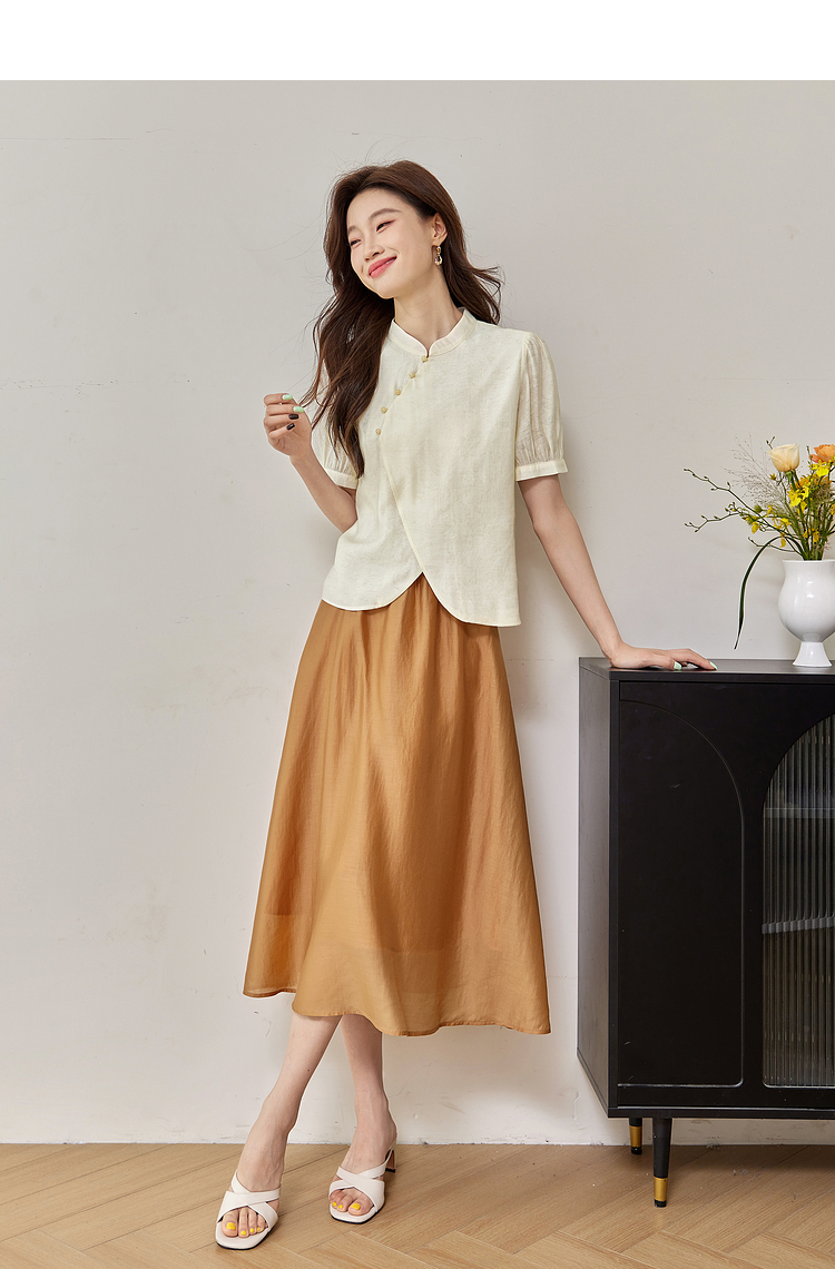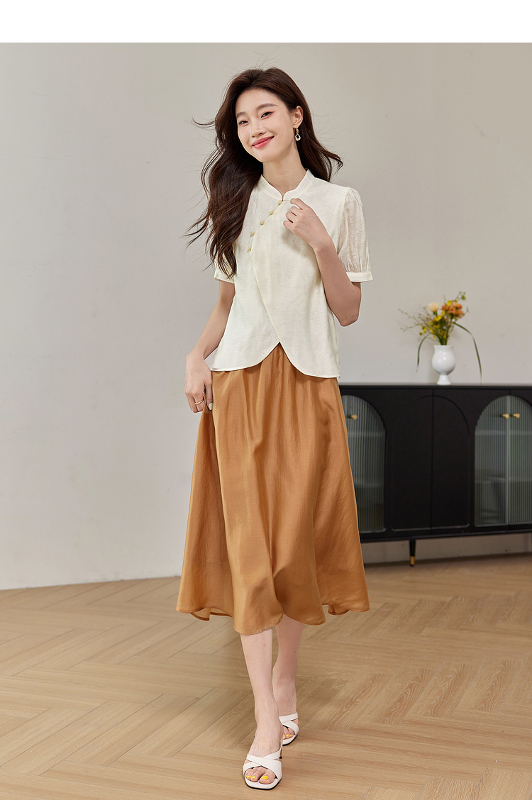 【专属特价】熙世界夏季女装新中式国风禅意立领斜襟衬衫天丝半身裙两件套装