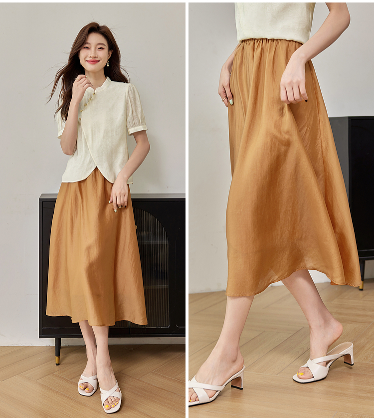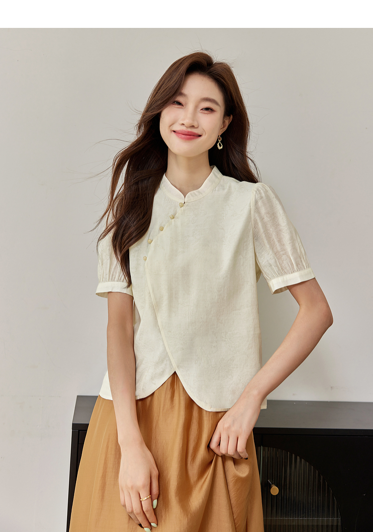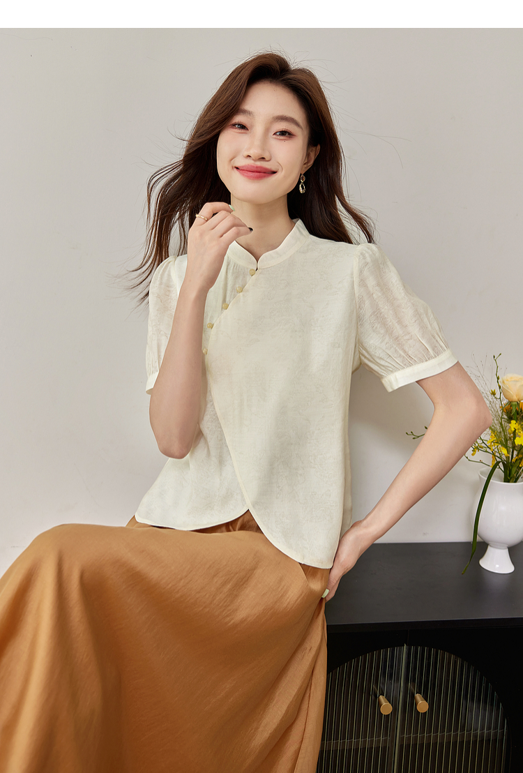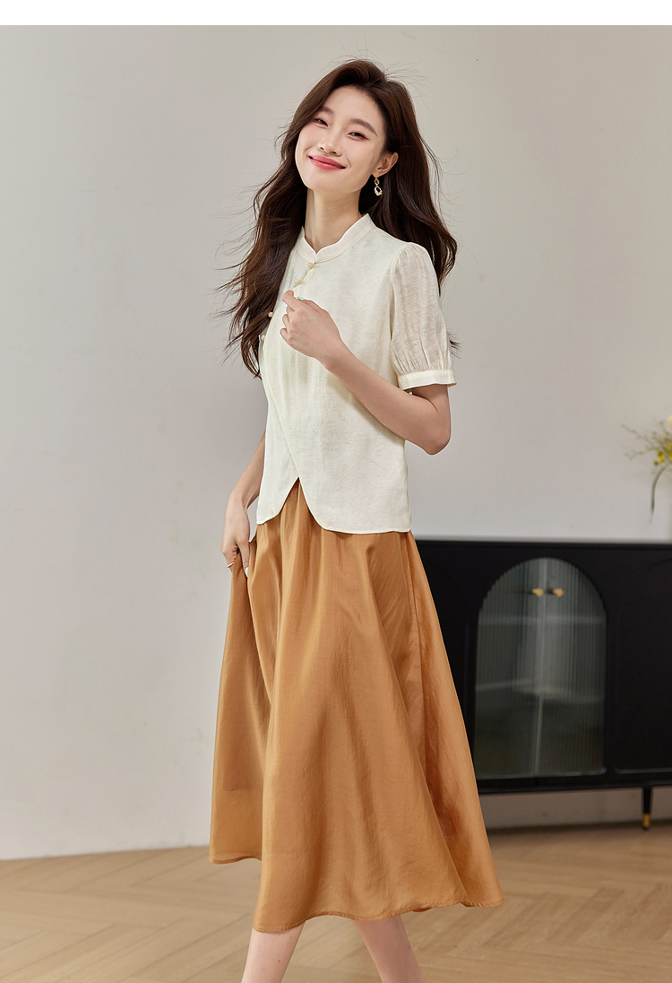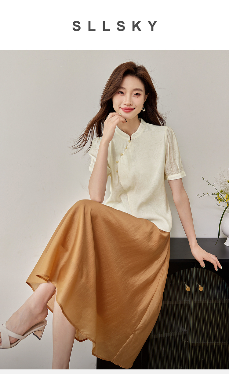 【专属特价】熙世界夏季女装新中式国风禅意立领斜襟衬衫天丝半身裙两件套装