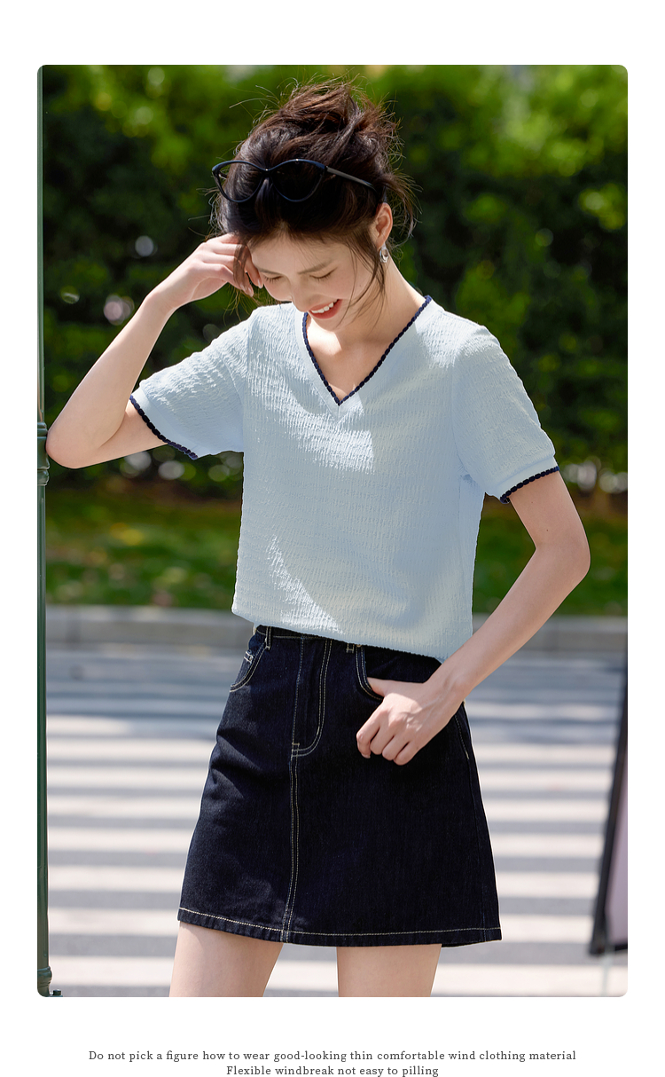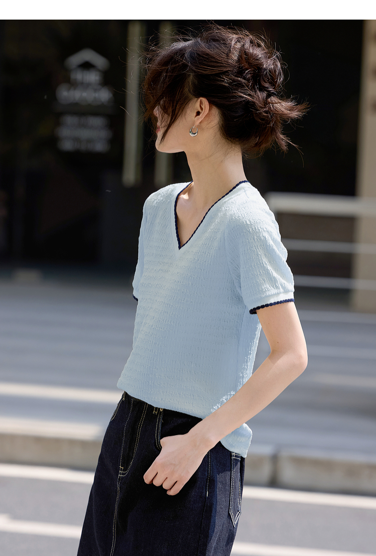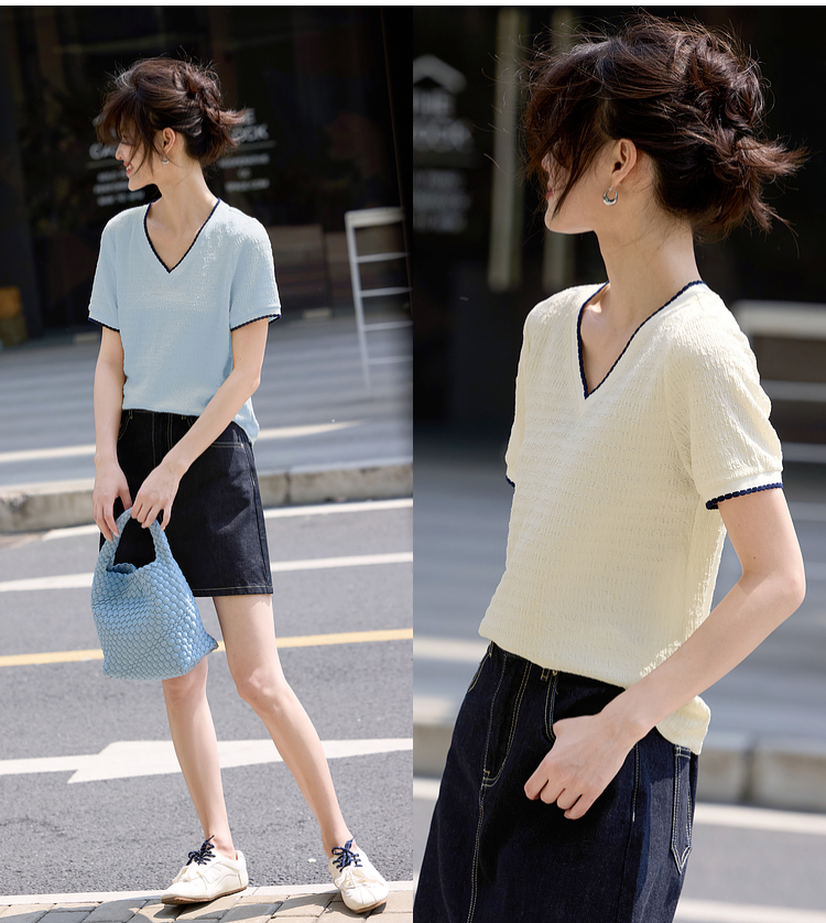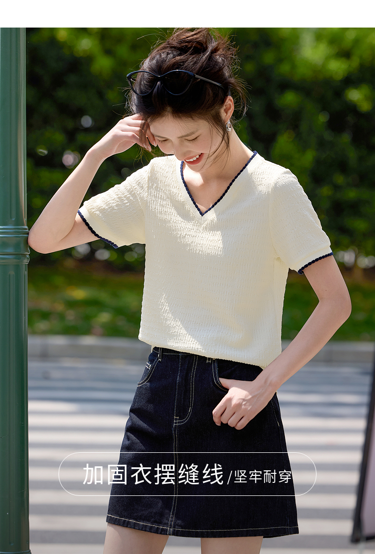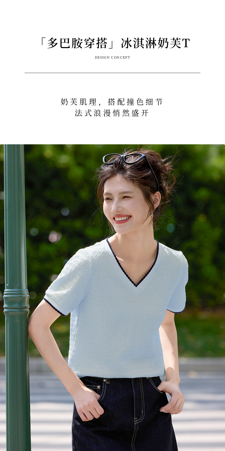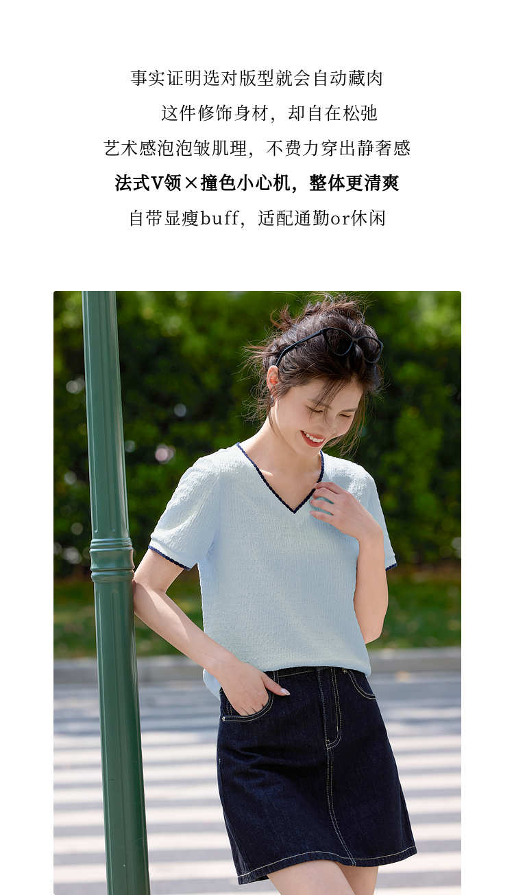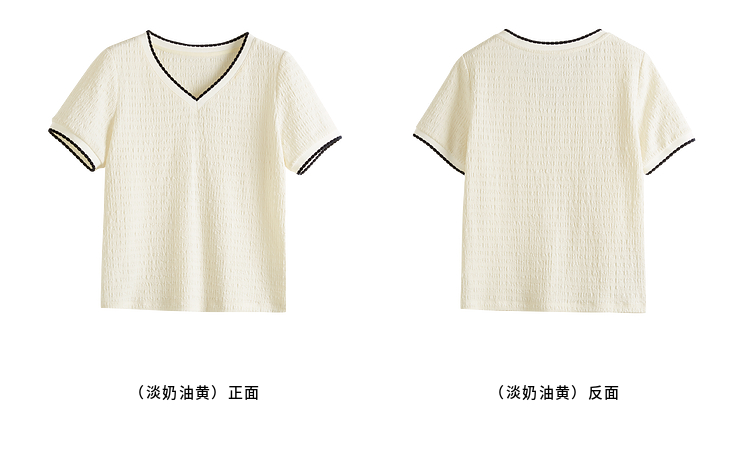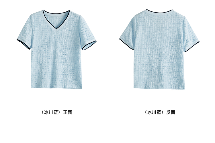 【专属特价】熙世界肌理感撞色V领T恤女士夏日新款法式设计感宽松显瘦短袖上衣