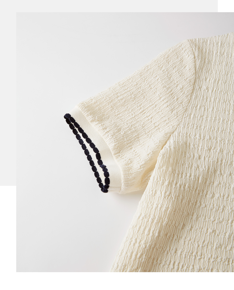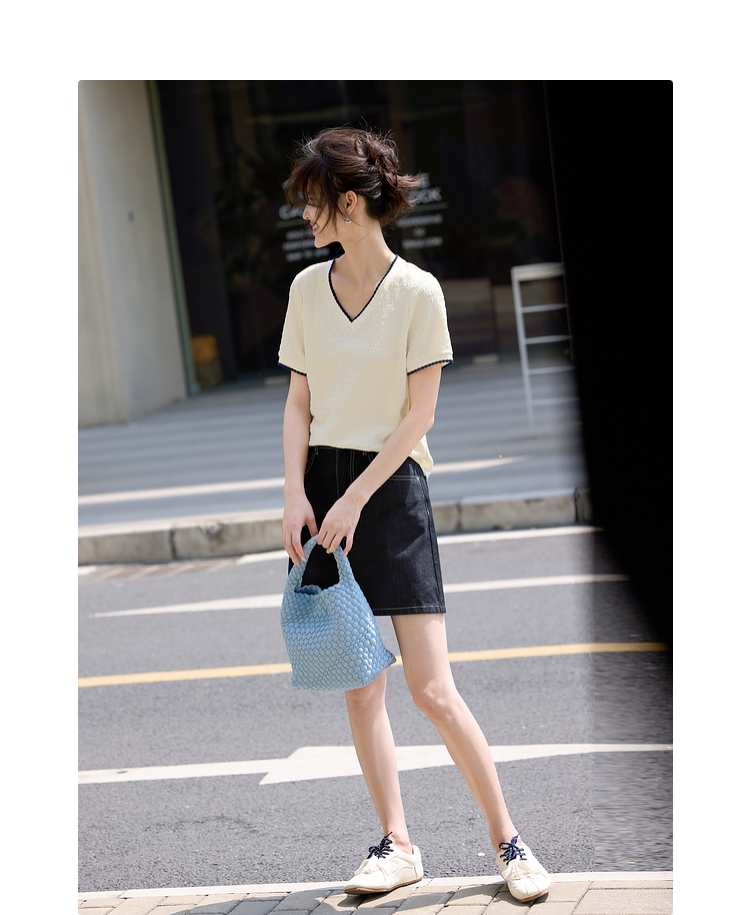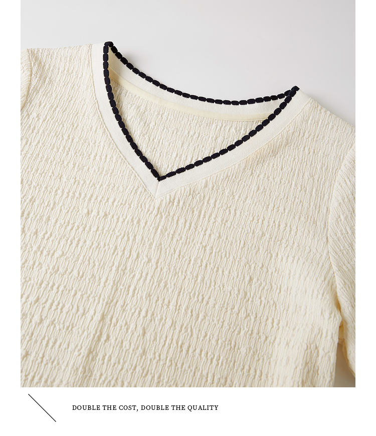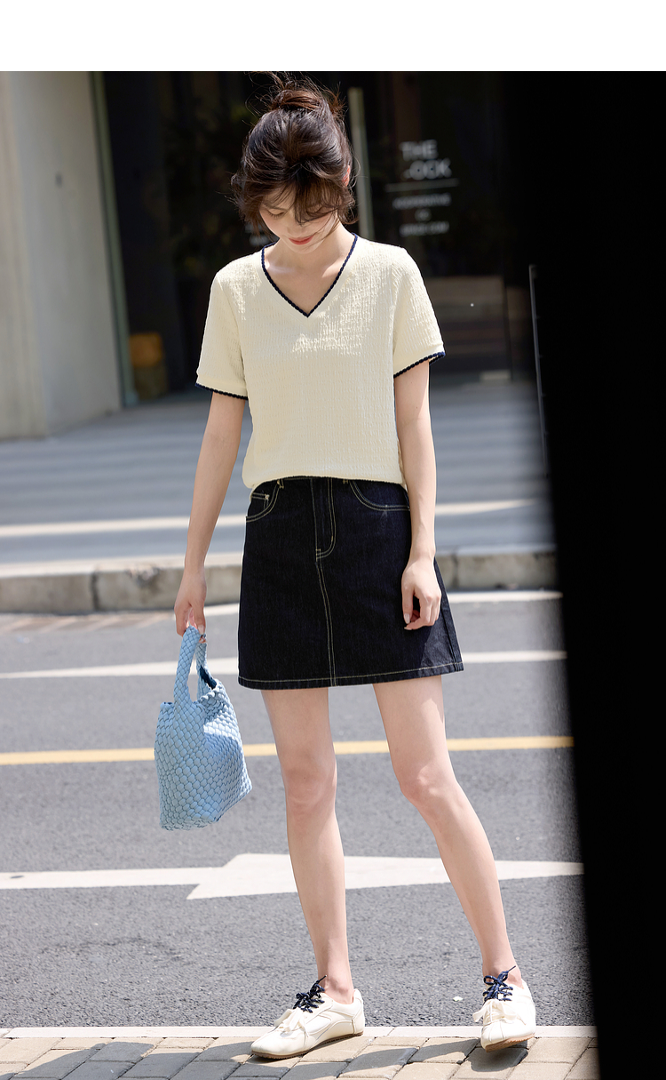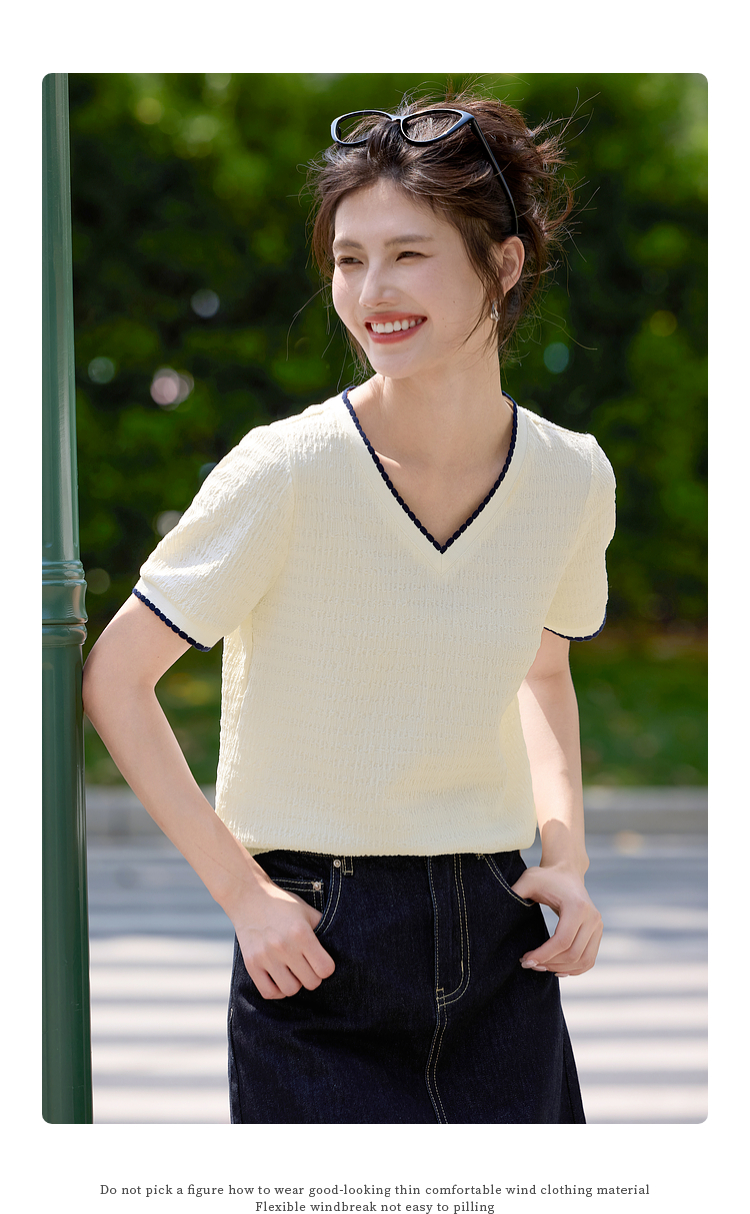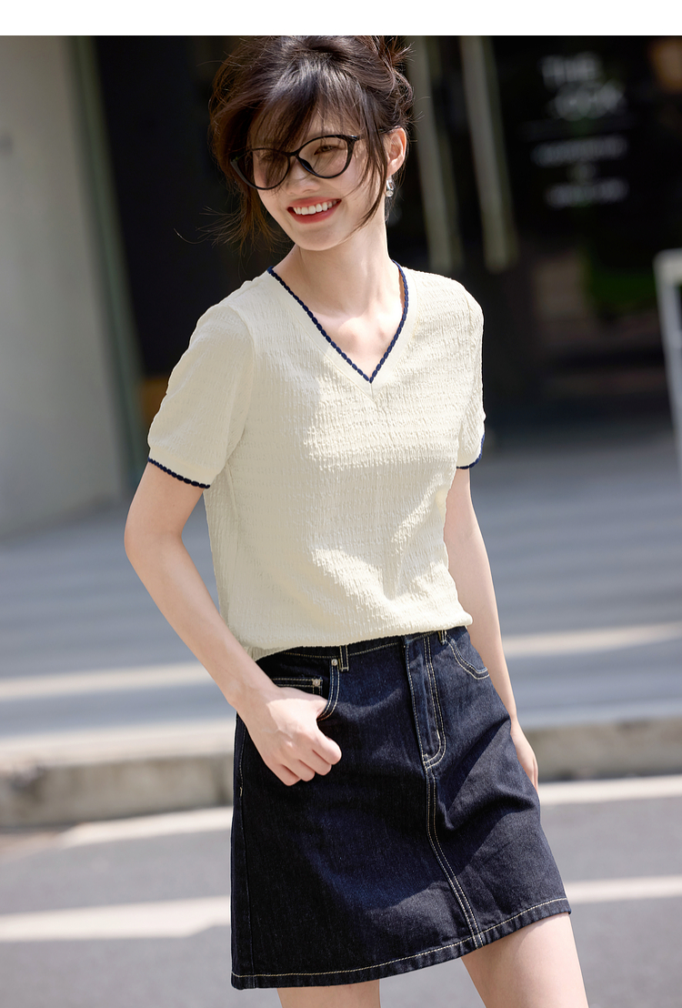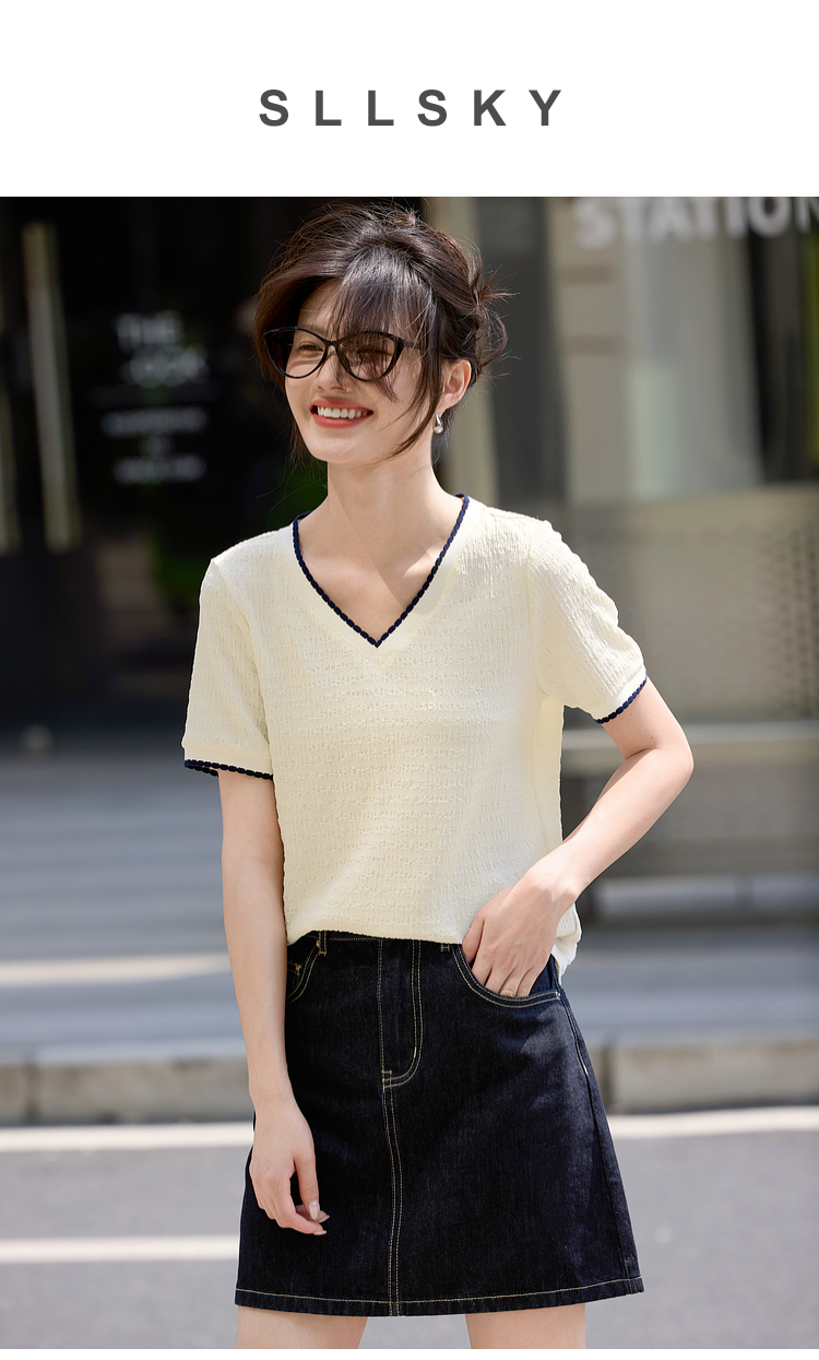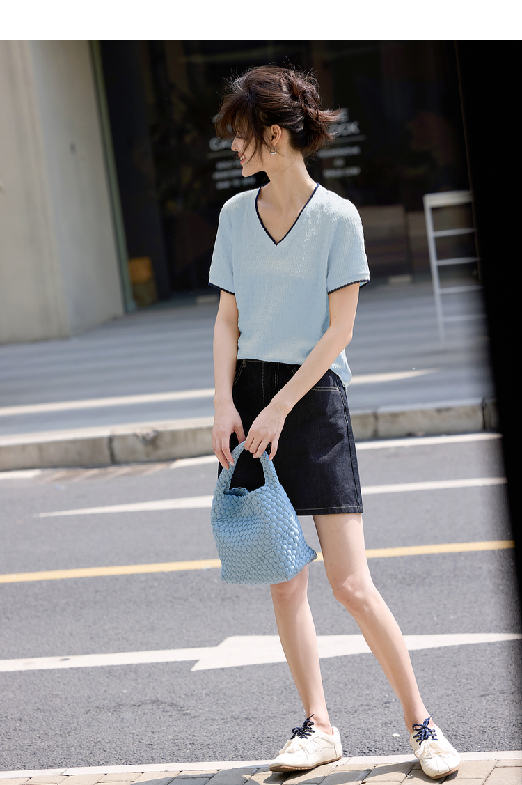 【专属特价】熙世界肌理感撞色V领T恤女士夏日新款法式设计感宽松显瘦短袖上衣