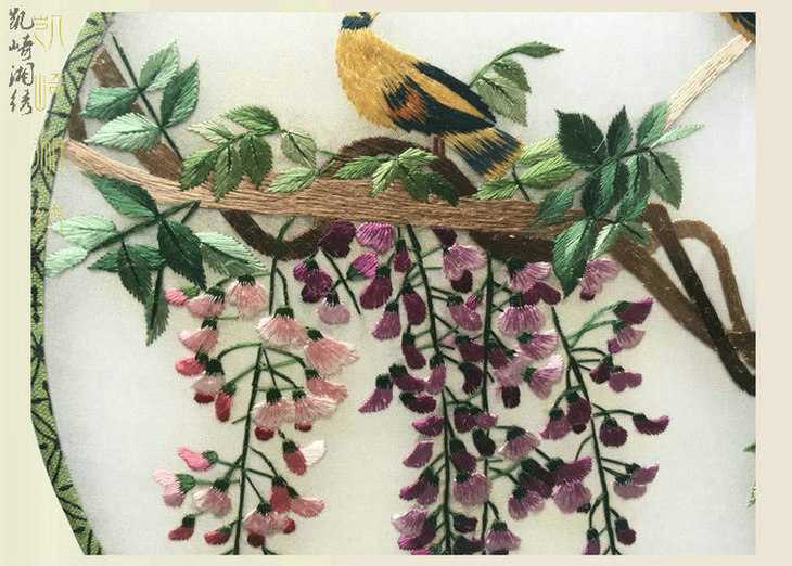 宫扇工艺扇故宫刺绣扇 汉服扇中国风扇 圆扇长柄团扇 熊猫图案真丝扇子 湘绣礼物 白色鹊之蓝错针绣