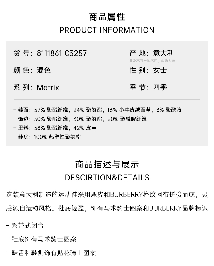BURBERRY 巴宝莉 女士马术骑士徽标格纹 Matrix 活力休闲运动鞋 混色 8111861 C3257