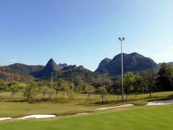 桂林漓江高尔夫俱乐部球场位于风景优美的磨盘山下。由美国高尔夫设计家协会(ASGCA)杰出设计师LEE CHANG的整体规划及球道设计,香港陈远荣建筑师主导的会馆设计,以及日本大成建设的技术监督。整个球场项目占地400公顷,球道总长7150码,为国际标准18洞72杆球场。