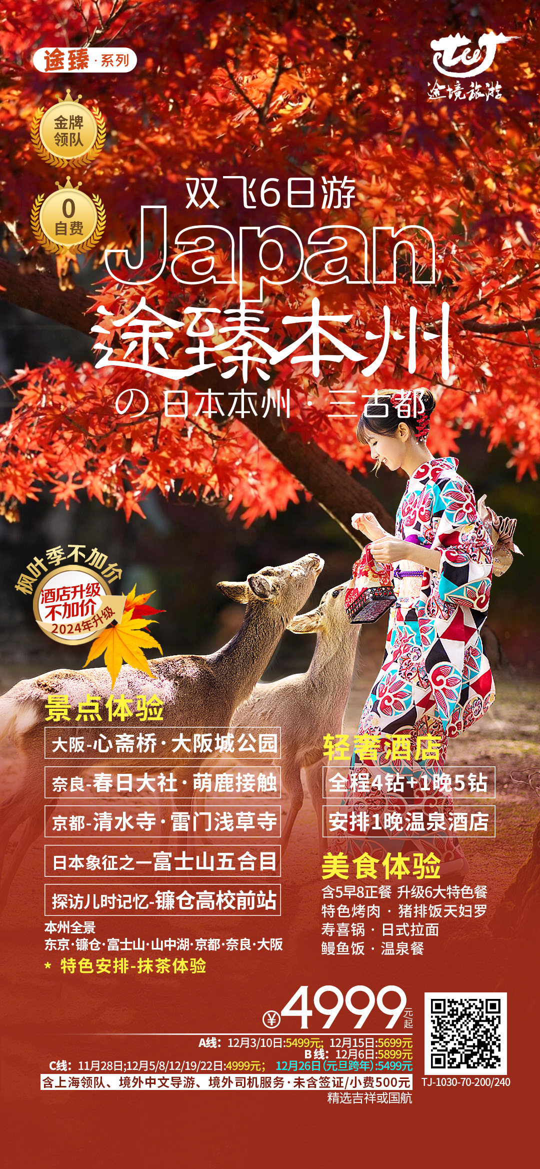 【上海出发】途臻本州双飞6日游轻奢酒店美食体验大阪奈良京都富士山