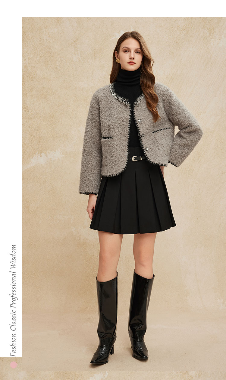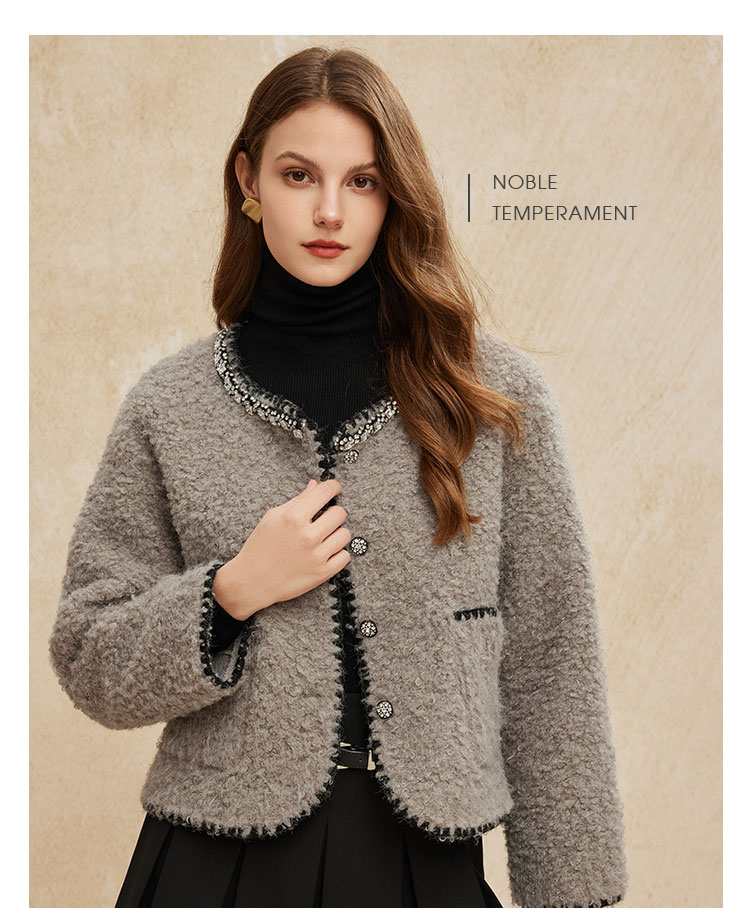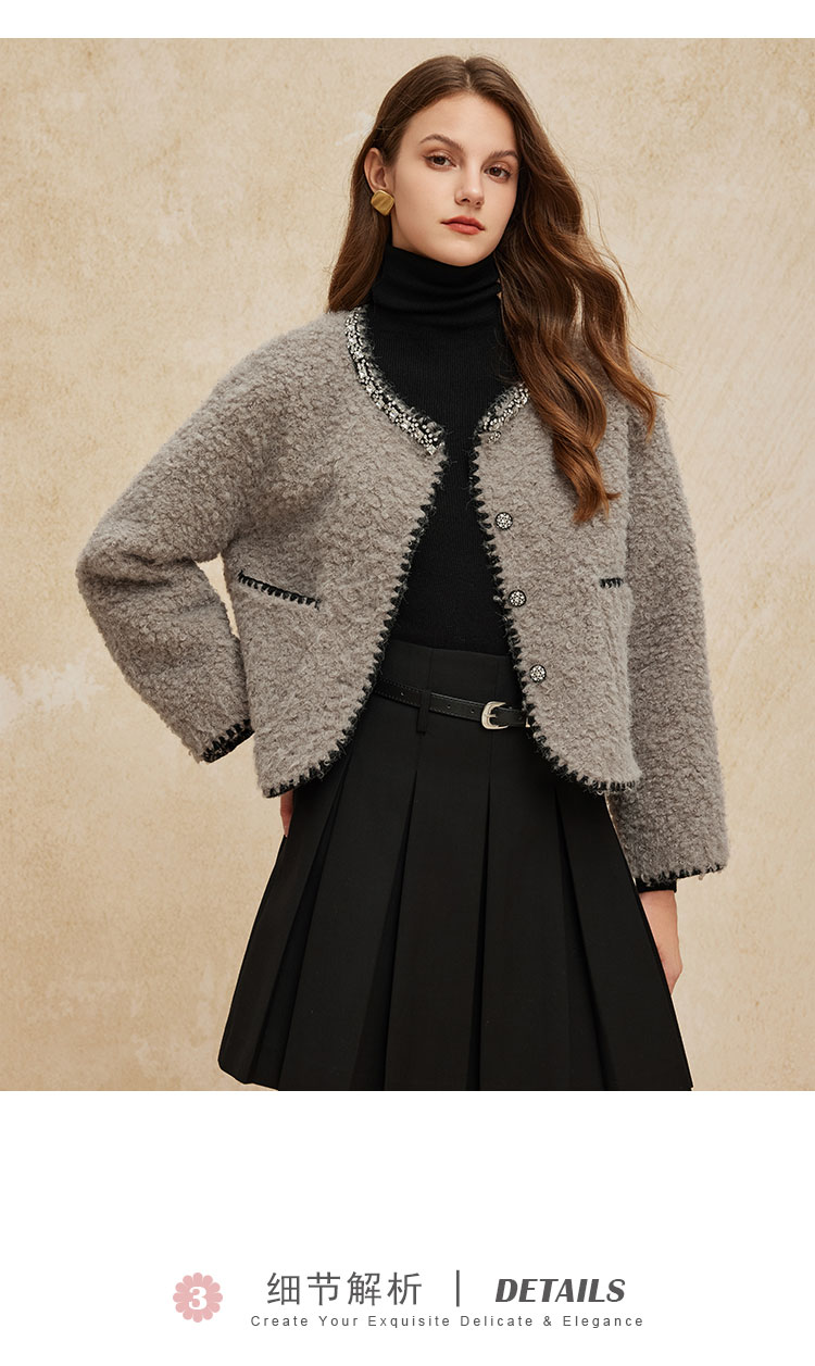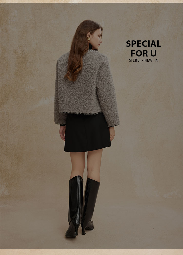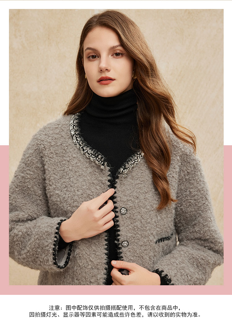 PH107斯尔丽2024冬季新款小香风皮毛一体圆领防风保暖优雅仿绵羊毛外套