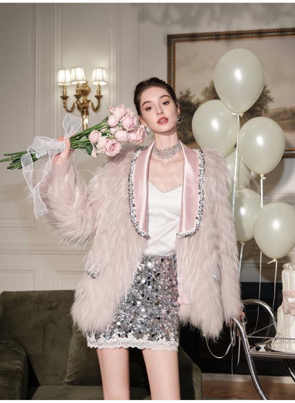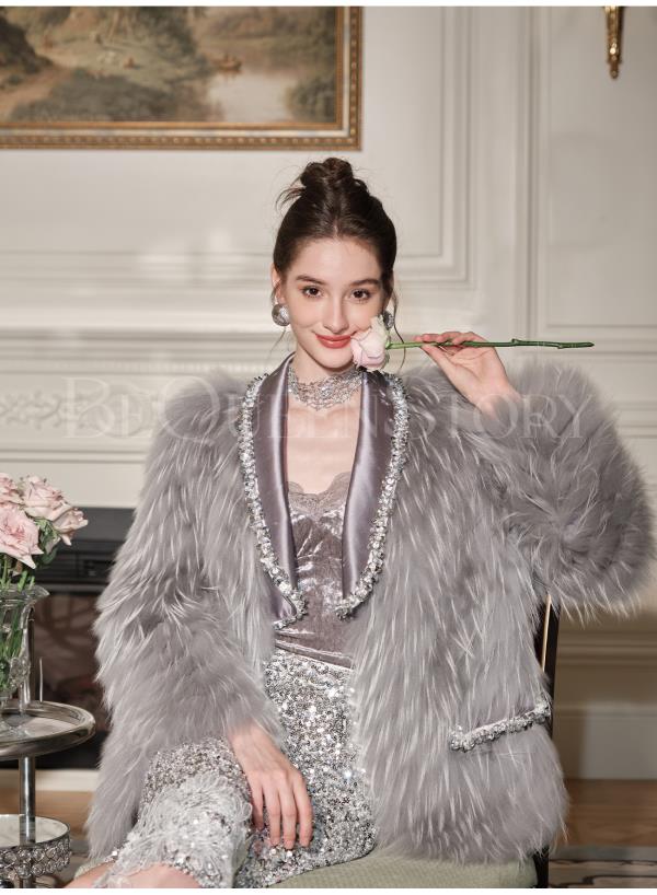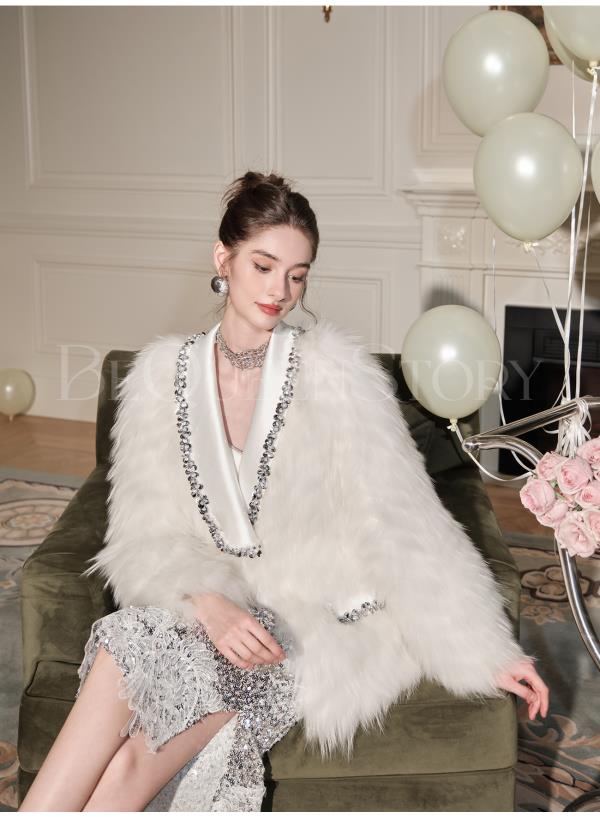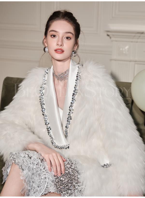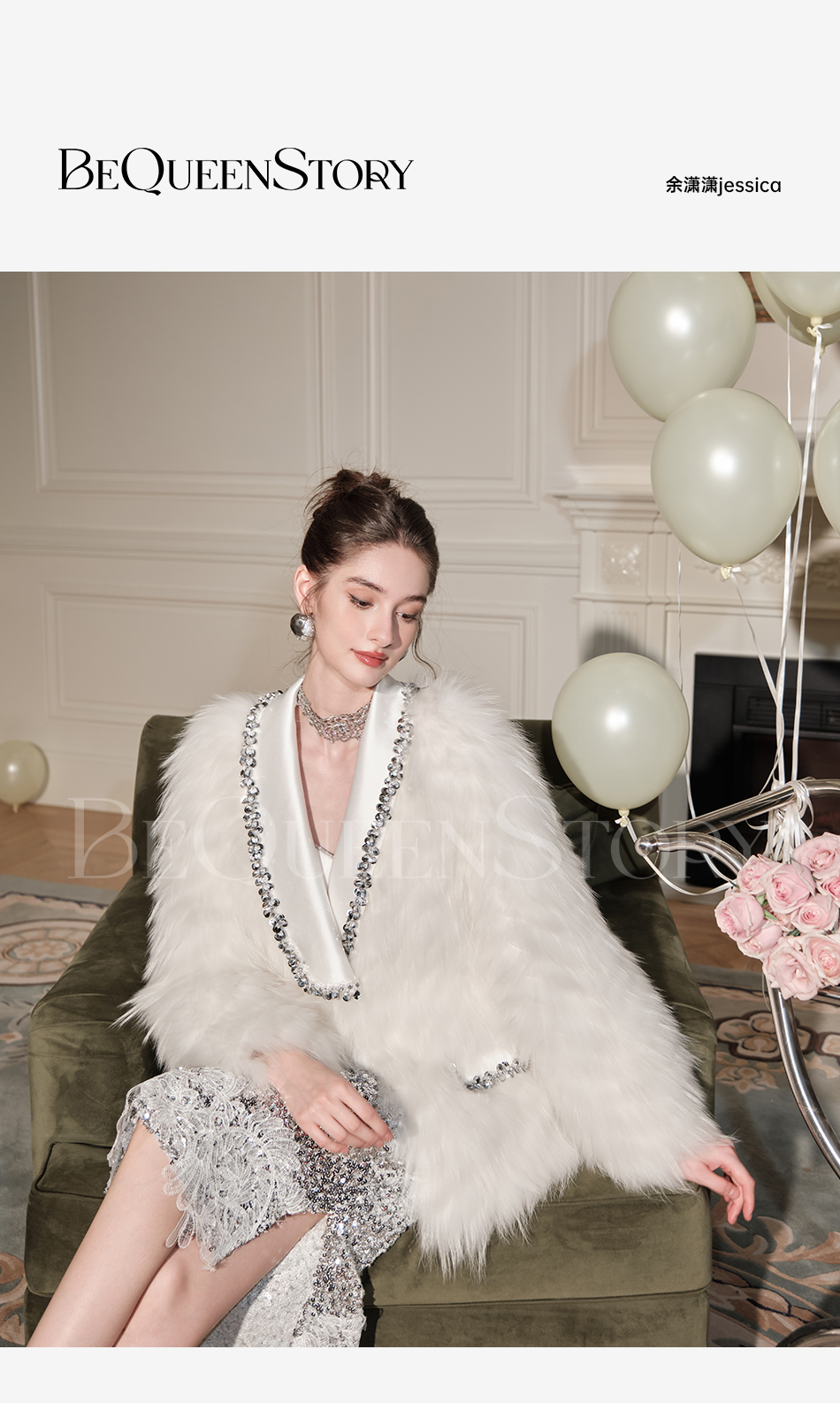 BeQueenStory【静奢晚宴】手工亮片织带拼接醋酸高级感翻领皮草外套