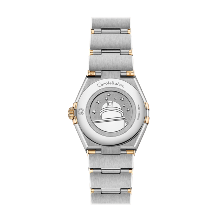 镜面材质 | 蓝宝石水晶玻璃 | 表盘 | 经典的半月形切面、“托爪”以及mono-rang表链。 黄色18K金与精钢打造,表圈铺镶钻石,冰霜银表盘晶莹洁白,饰有钻石小时刻度,覆以耐磨损蓝宝石玻璃表镜。指针、欧米茄品牌标识、星座徽标以及钻石托槽亦以黄色18K金打造而成。 密底,表背印有星座天文台徽章。 |