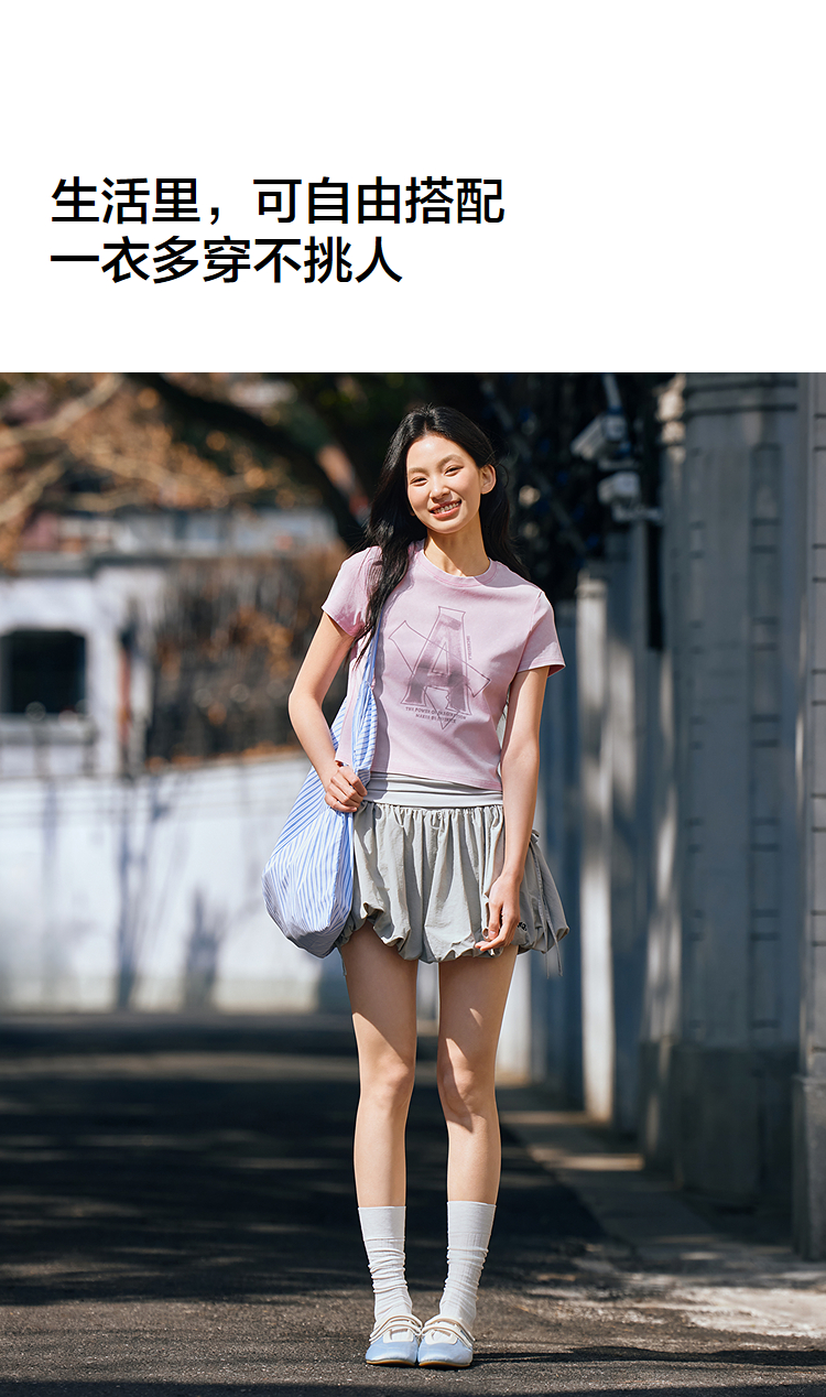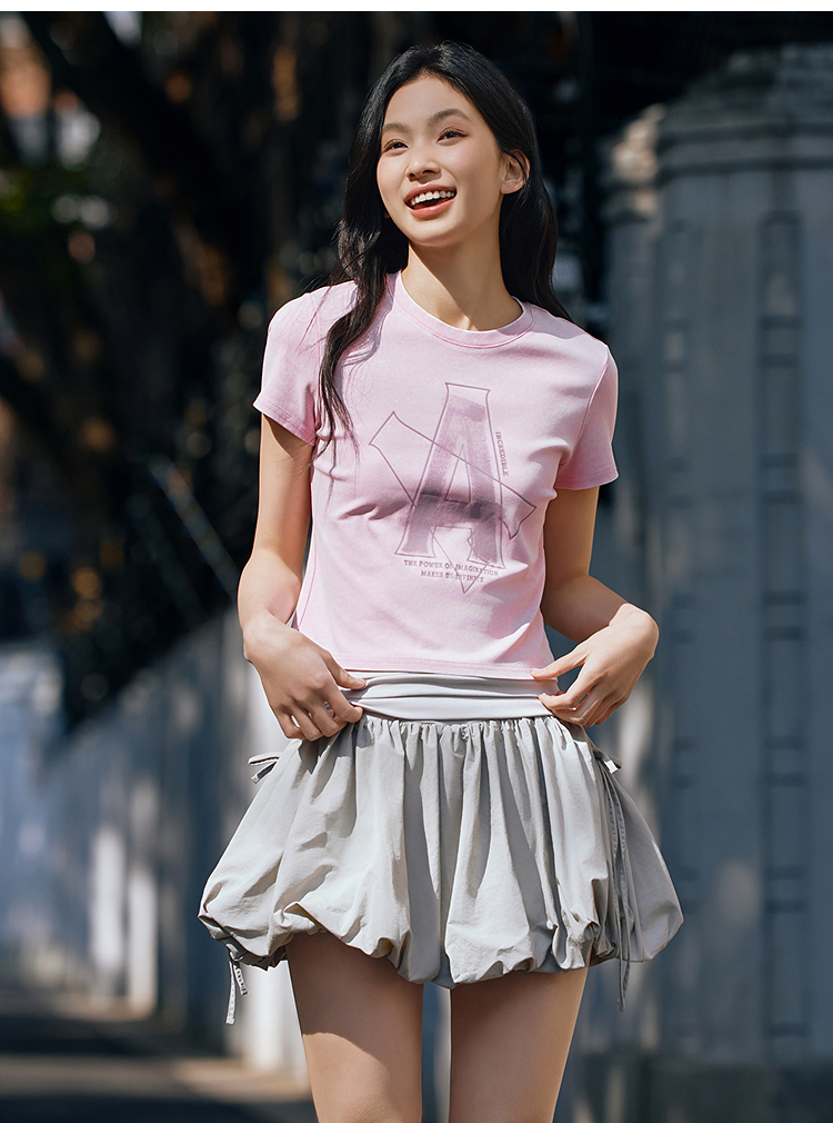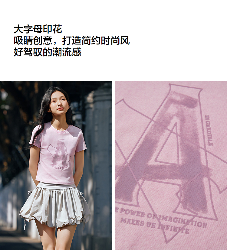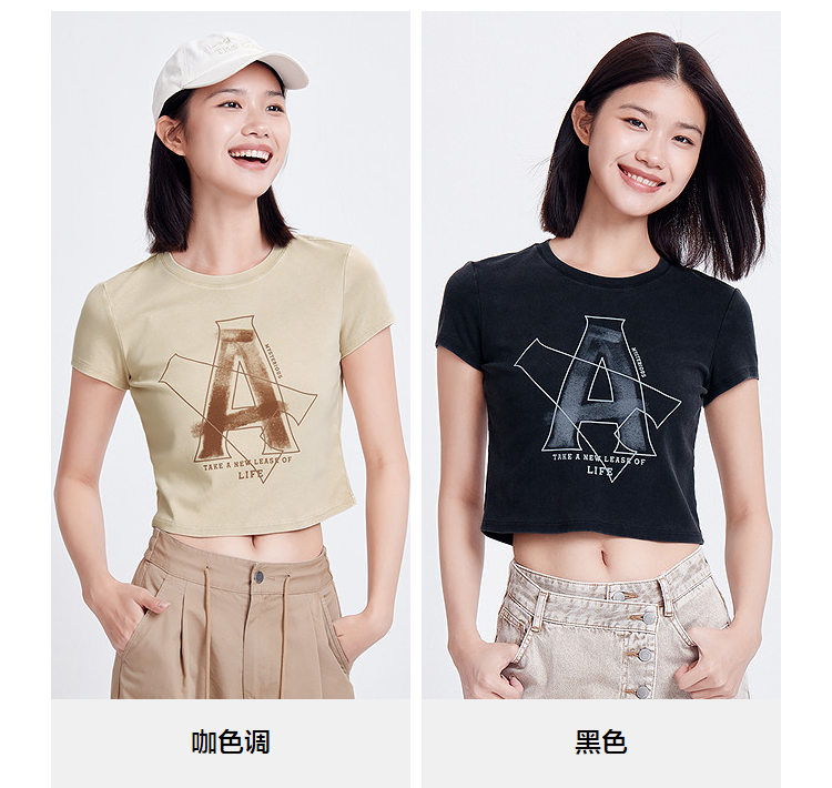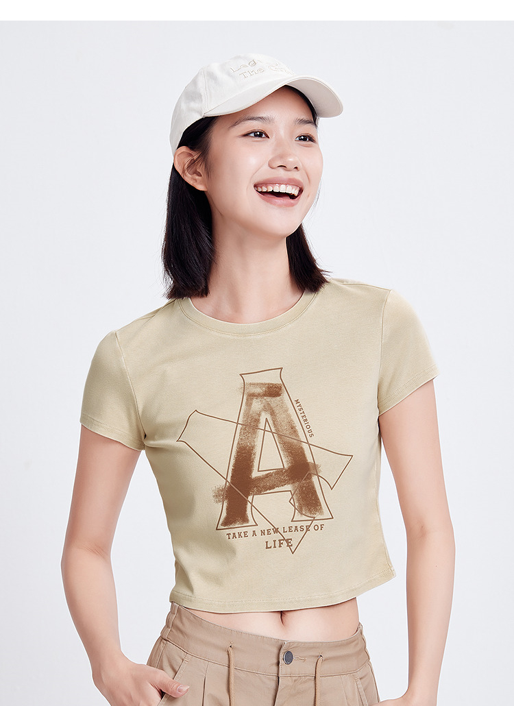 森马短袖T恤女短款字母修身小性感夏季复古做旧正肩上衣辣妹潮酷