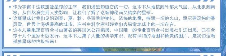《DK儿童地理百科全书》用生动形象的图片和清晰的文字,描述了地球是如何运行的,人们又是如何改造地球的,探索世界的每一个环节,带你详细地了解可怕的地震、价值连城的宝石,以及风暴对建筑物的破坏。《DK儿童地理百科全书》涵盖了自然地理的各个方面,从火山爆发到令人难以置信的水晶洞穴,从海洋的底部到*的山峰,从地球的形成、结构到狂暴的天气、无休无止的地质作用,从生动的地貌一直到地球上的国家和人民。