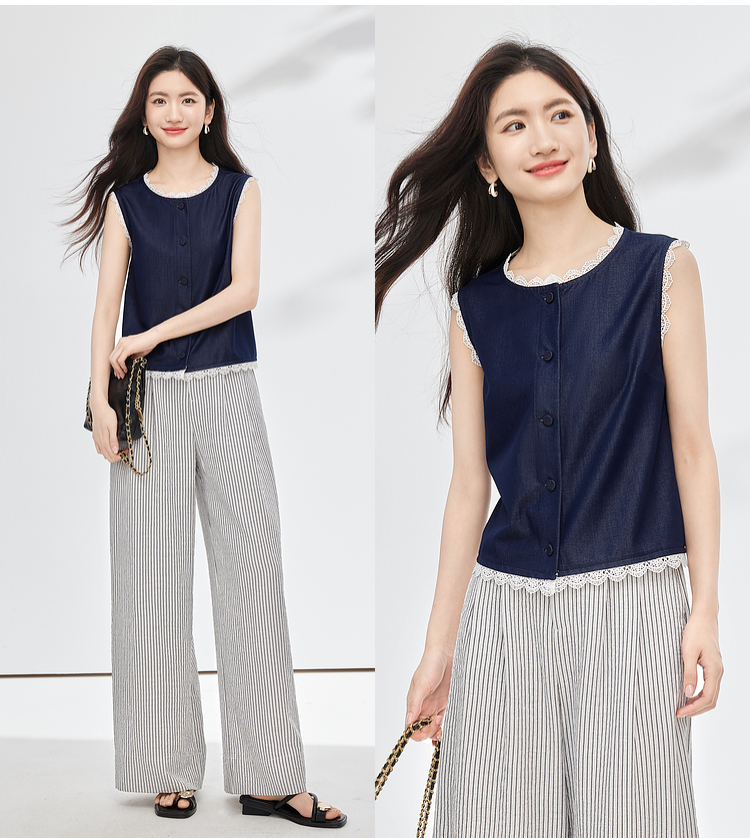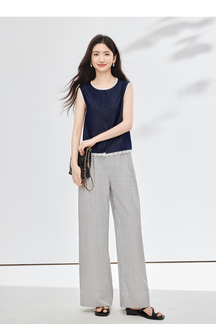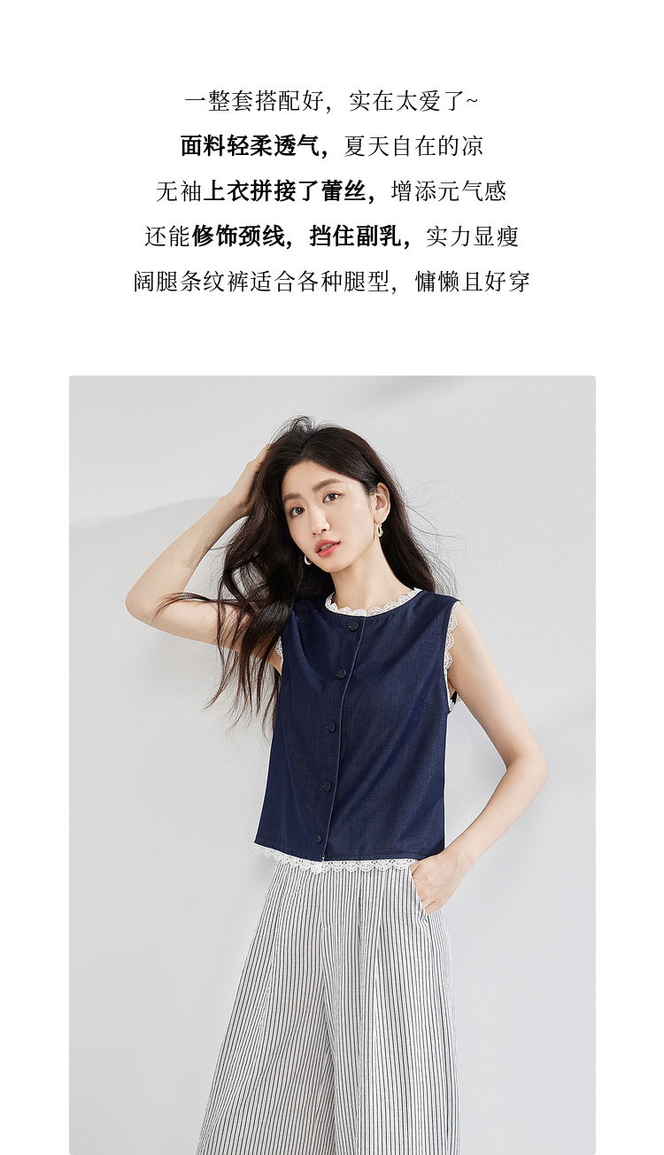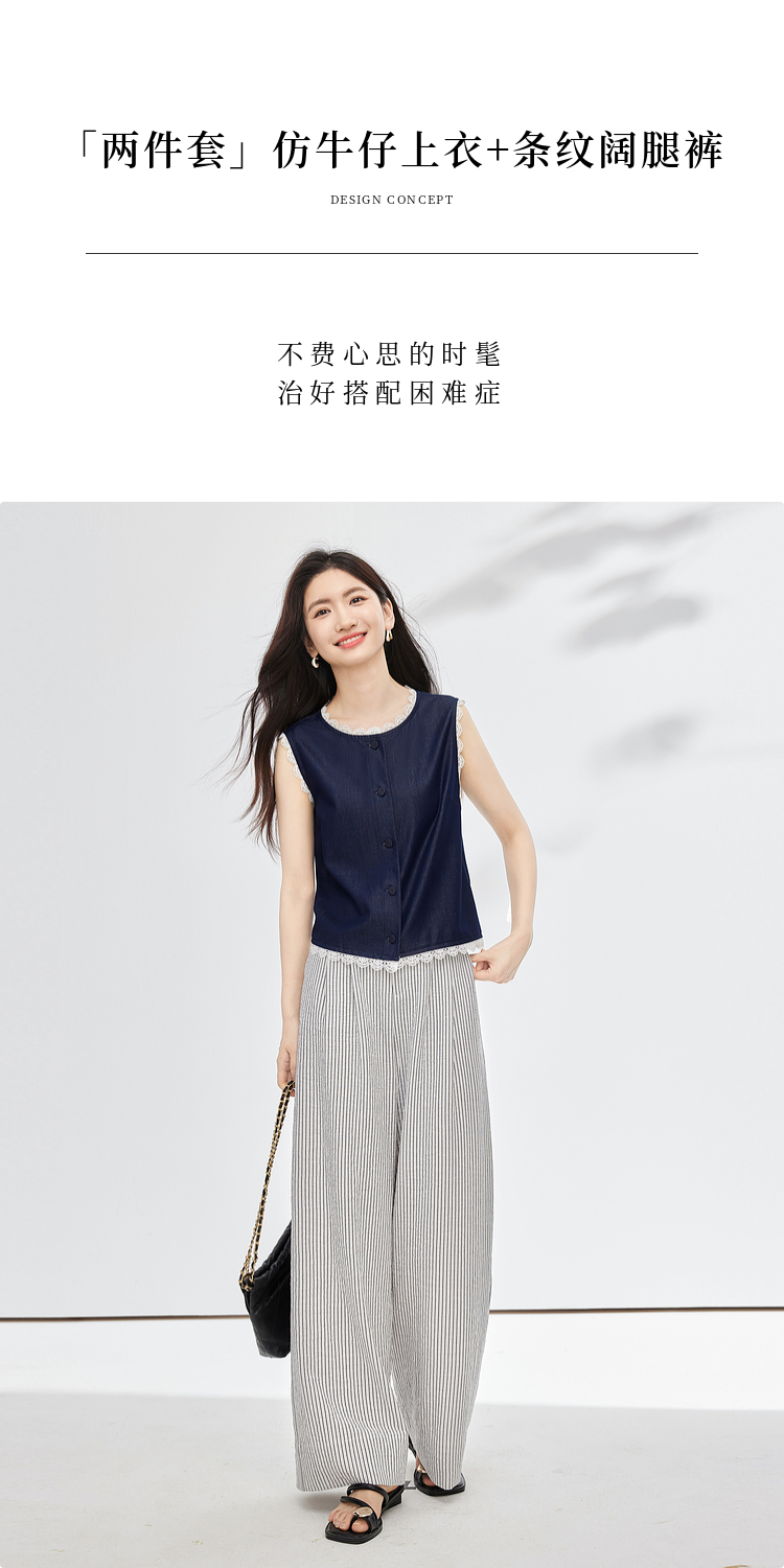 【专属特价】熙世界松弛感通勤休闲套装女夏季仿牛仔无袖上衣条纹阔腿裤两件套