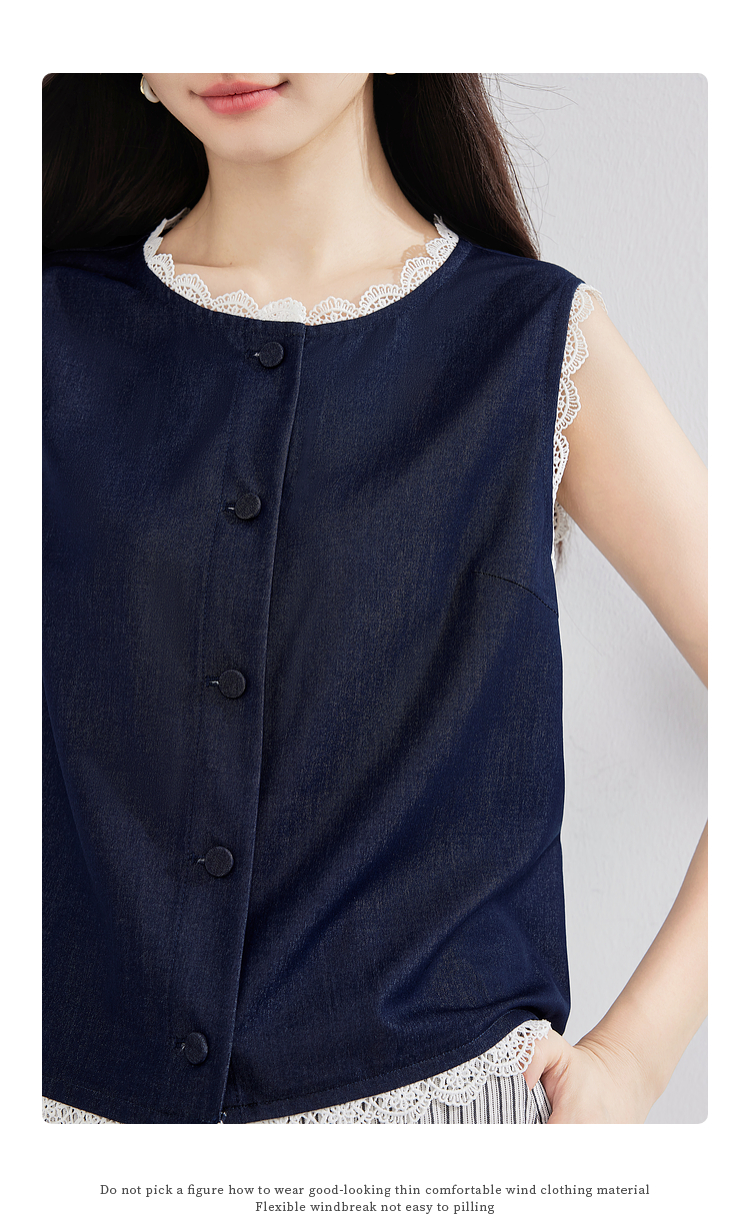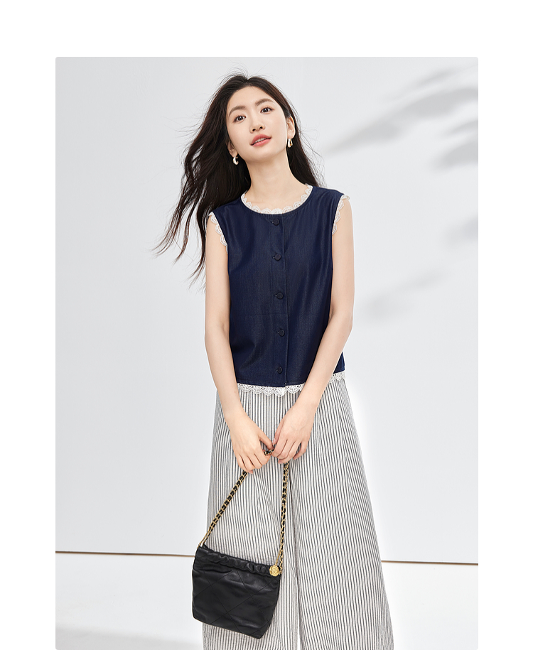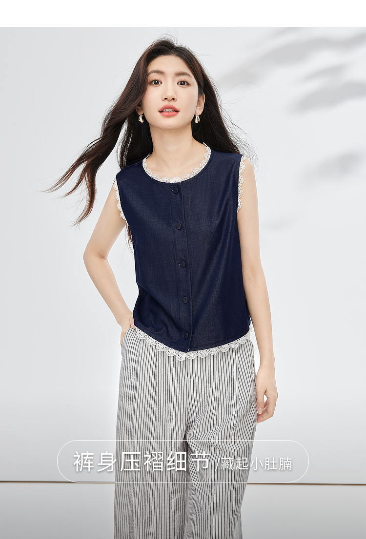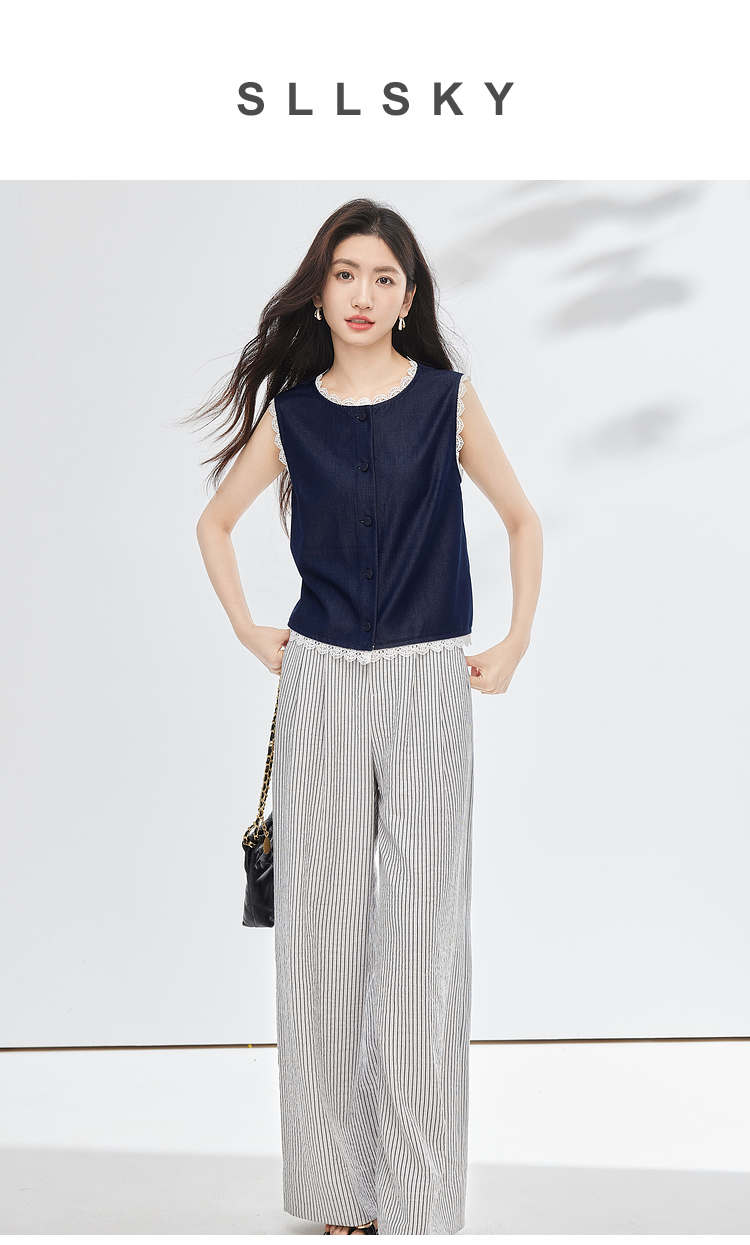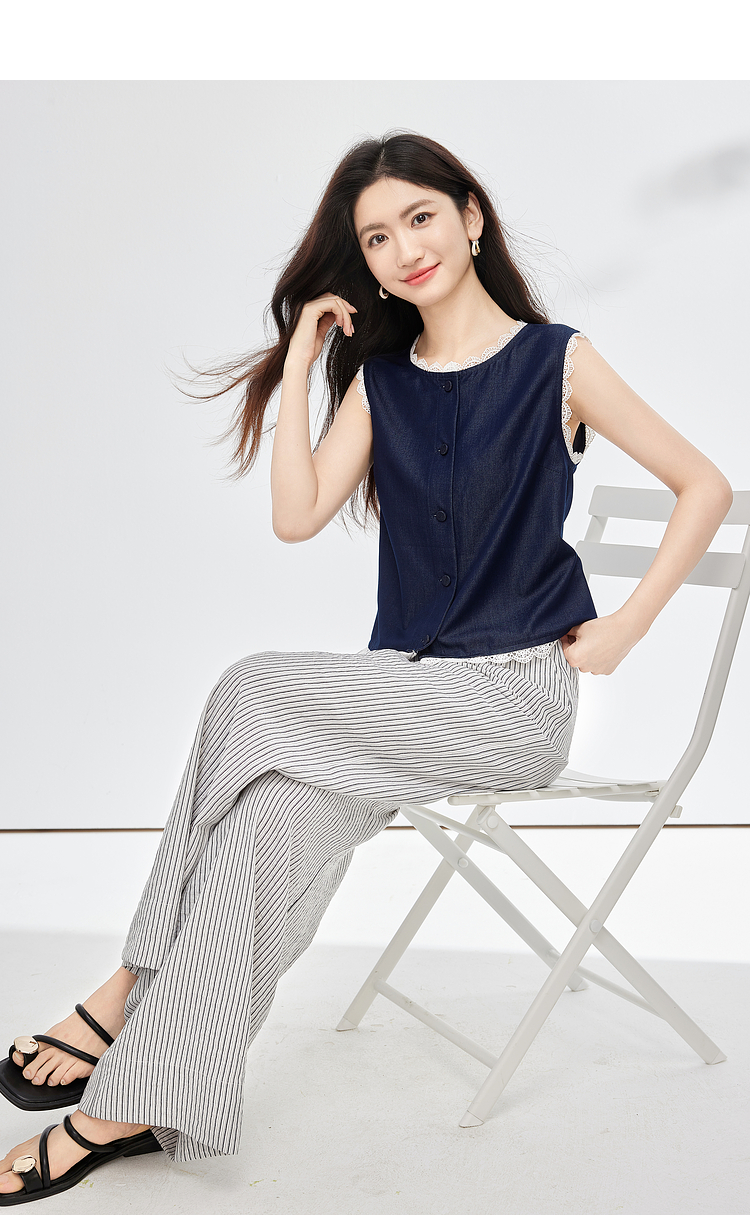 【专属特价】熙世界松弛感通勤休闲套装女夏季仿牛仔无袖上衣条纹阔腿裤两件套