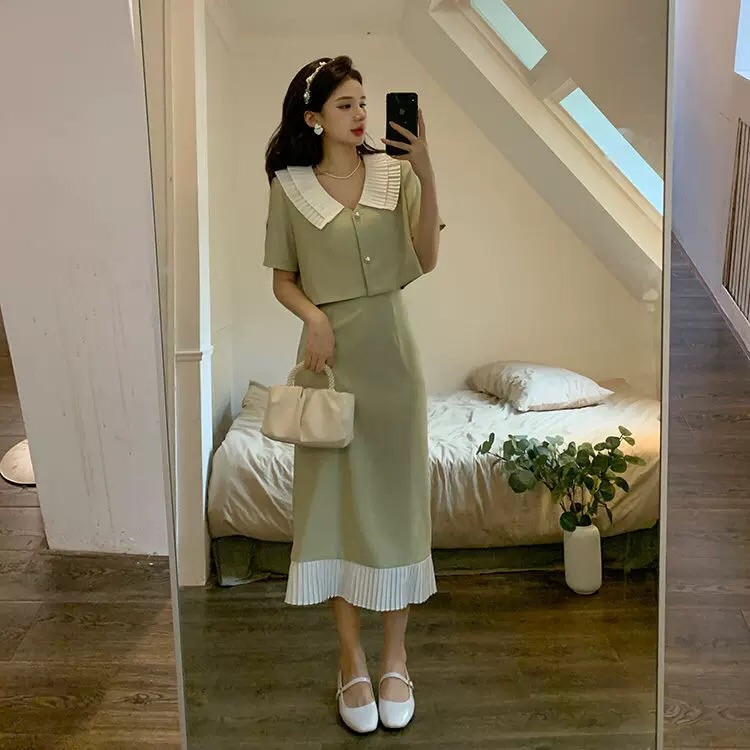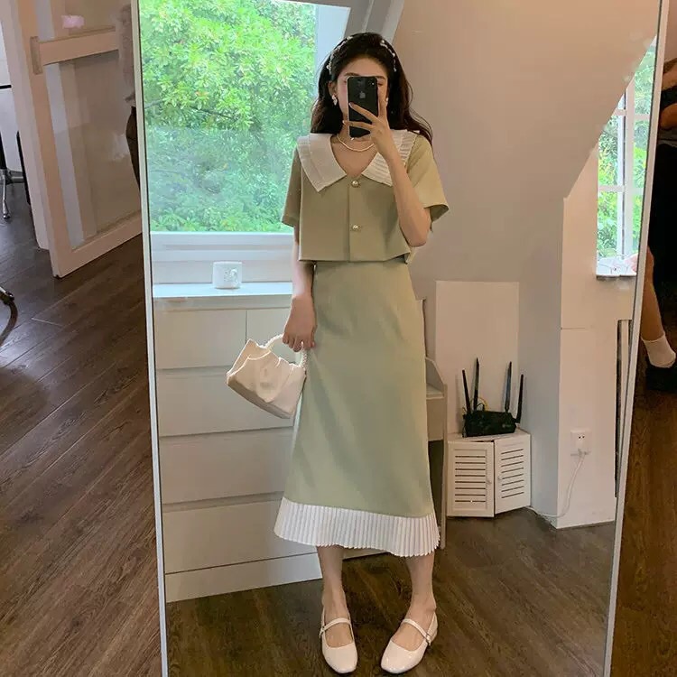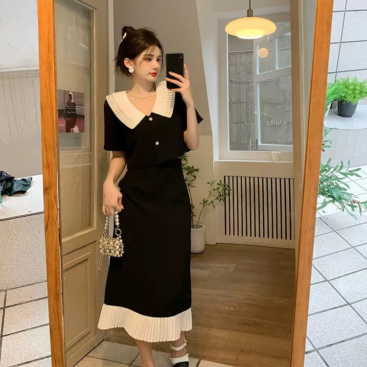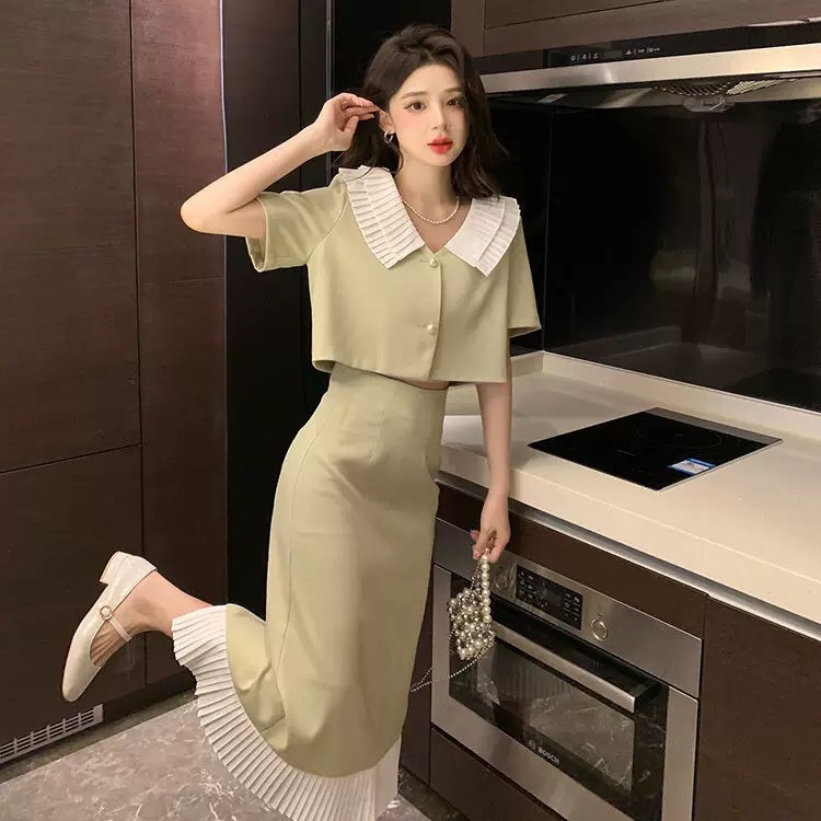 (清仓现货)【社群供V】2022夏季新品小众设计感气质淑女短袖外套+显瘦半身裙两件套涤纶2
