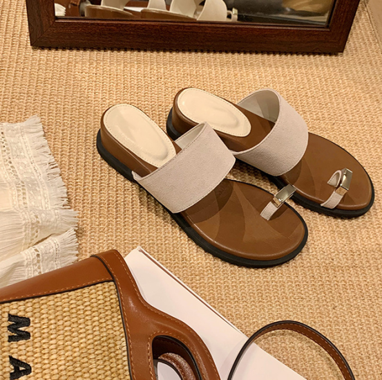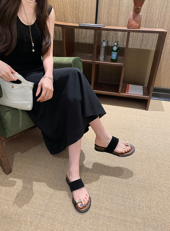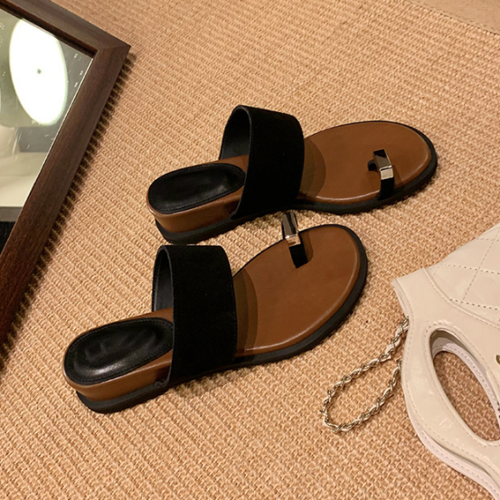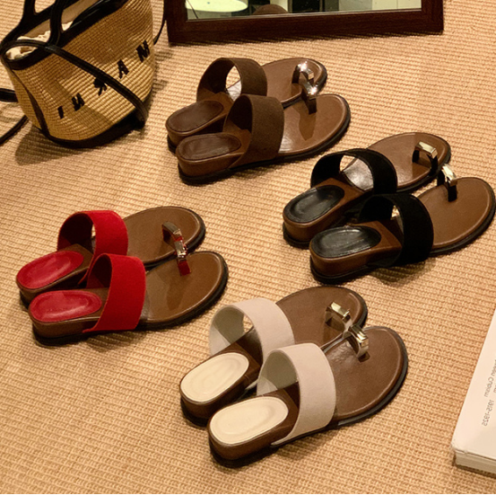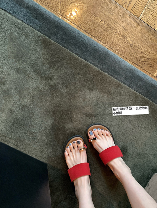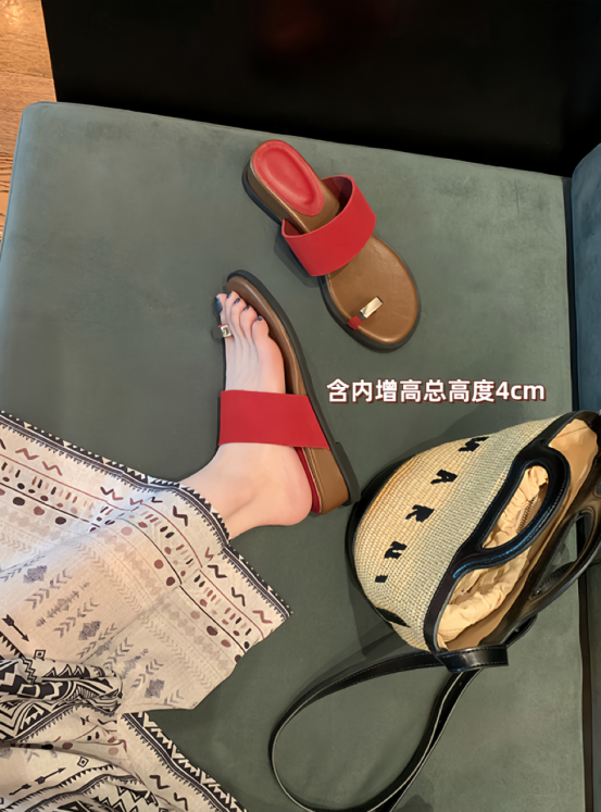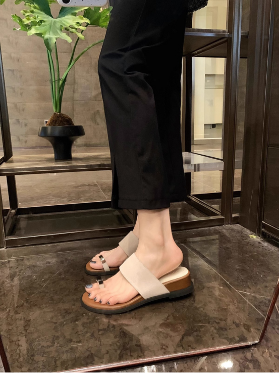 一眼沦陷😎好精致的小银扣夹趾凉拖鞋❗❗ 复古风满满 银扣装饰好有质感 这双设计感绝了 4cm增高就是可以非常自然地抬高身型 羊皮垫脚嫩滑贴肤且吸汗透qi 撞色设计更有看点💨💨💨 📌上脚坡感不明显,敲稳当实打实的显腿长 总跟高4cm左右 小个子搭衣服也炒鸡方便哦~