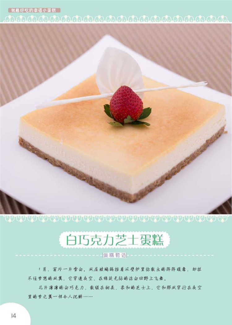 做好吃的幸福小蛋糕 目录 幸福小蛋糕制作常识 准备工具 6 重要食材的选择 8 次制作成功的小秘诀 9 常用蛋糕作 11 ● 法式海绵蛋糕底 ● 可可海绵蛋糕底 1月温柔暖心 ● 白巧克力芝士蛋糕 14 ● 咖啡芝士蛋糕 16 ● 可可芝士蛋糕 18 ● 可可小蛋糕 20 ● 蔓越莓牛油味小蛋糕 22 2月浓情时刻 ● 百利甜酒芝士蛋糕 34 ● 蜂蜜柚子芝士蛋糕 36 ● 枣泥戚风小蛋糕 38 ● 全蛋蜂蜜小蛋糕 40 3月淡淡春风 ● 焦糖巧克力芝士蛋糕 25 ● 摩卡方芝士蛋糕 27 ● 夹心小蛋糕 29 ● 胚芽海绵小蛋糕 31 4月花香满溢 ● 覆盆子冻芝士蛋糕 43 ● 玫瑰芝士蛋糕 45 ● 康乃馨小蛋糕 47 ● 花朵杯子小蛋糕 49 5月缤纷水果 ● 柠檬冻芝士蛋糕 52 ● 草莓冻芝士蛋糕 55 ● 芒果流心芝士蛋糕 57 ● 奶油樱桃小蛋糕 60 ● 覆盆子迷你小蛋糕 62 6月轻柔芝士 ● 抹茶轻芝士蛋糕 65 ● 樱桃芝士蛋糕 67 ● 花样小蛋糕 69 ● 迷你小蛋糕 71 7月仲夏之梦 ● 卡布奇诺风味芝士蛋糕 74 ● 番茄芝士蛋糕 76 ● 椰香紫薯小蛋糕 78 ● 果酱夹心小蛋糕 80 8月金色月夜 ● 原味烤芝士蛋糕 83 ● 榴莲冻芝士蛋糕 85 ● 奶油巧克力小蛋糕 88 ● 老式小蛋糕 90 9月秋意渐浓 ● 朗姆酒芝士蛋糕 93 ● 紫薯冻芝士蛋糕 95 ● 分蛋海绵小蛋糕 97 ● 蜜豆夹心小蛋糕 99 10月丰收盛宴 ● 香橙芝士蛋糕 102 ● 彩虹芝士蛋糕 104 ● 糯米小蛋糕 106 ● 法式海绵小蛋糕 108 11月初雪之恋 ● 豆腐芝士蛋糕 111 ● 栗子芝士蛋糕 113 ● 南瓜杯子小蛋糕 116 ● 桑葚小蛋糕 118 12月梦幻圣诞 ● 圣诞芝士蛋糕 121 ● 南瓜芝士蛋糕 123 ● 巧克力海绵小蛋糕 125 ● 香橙泥小蛋糕 127 |