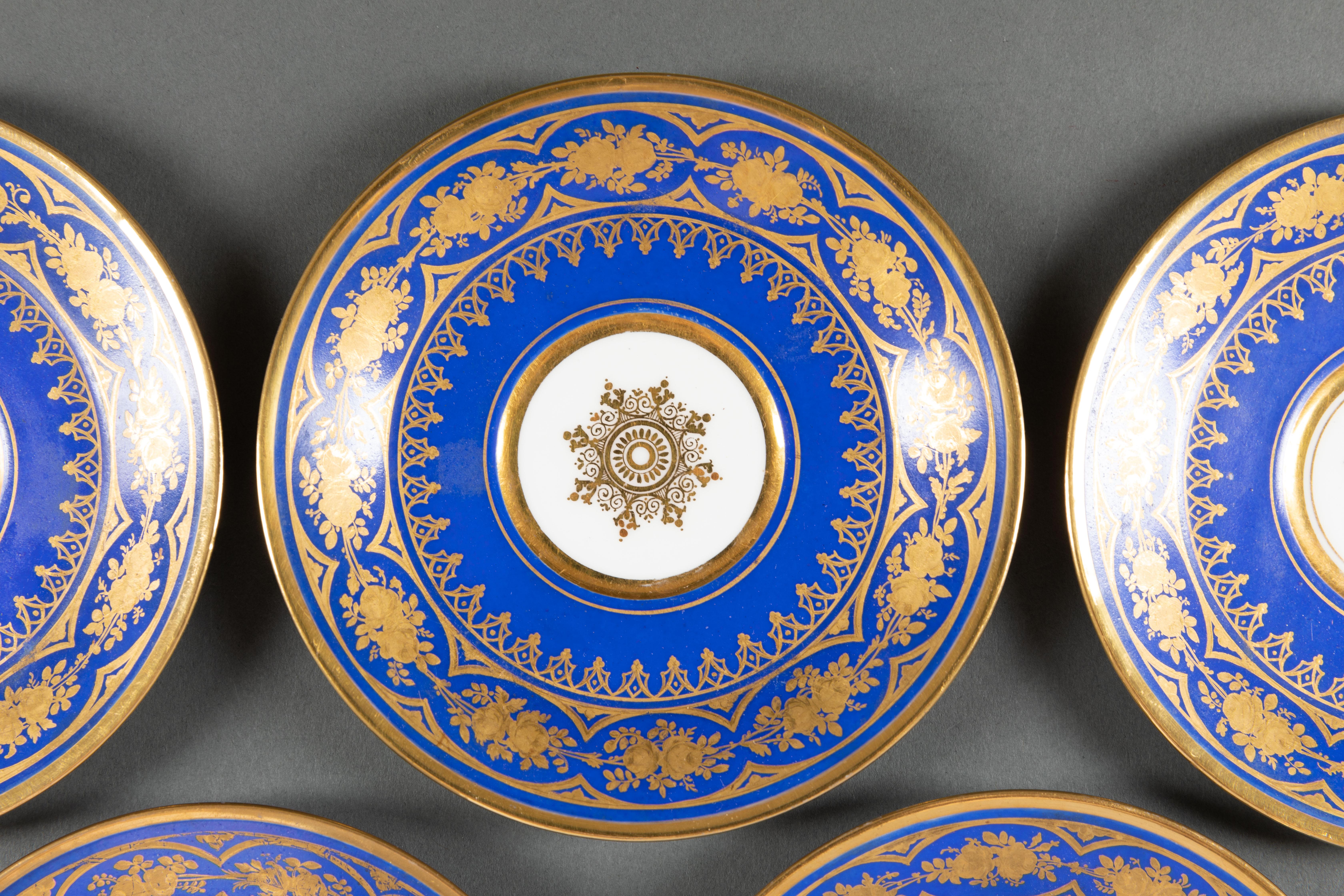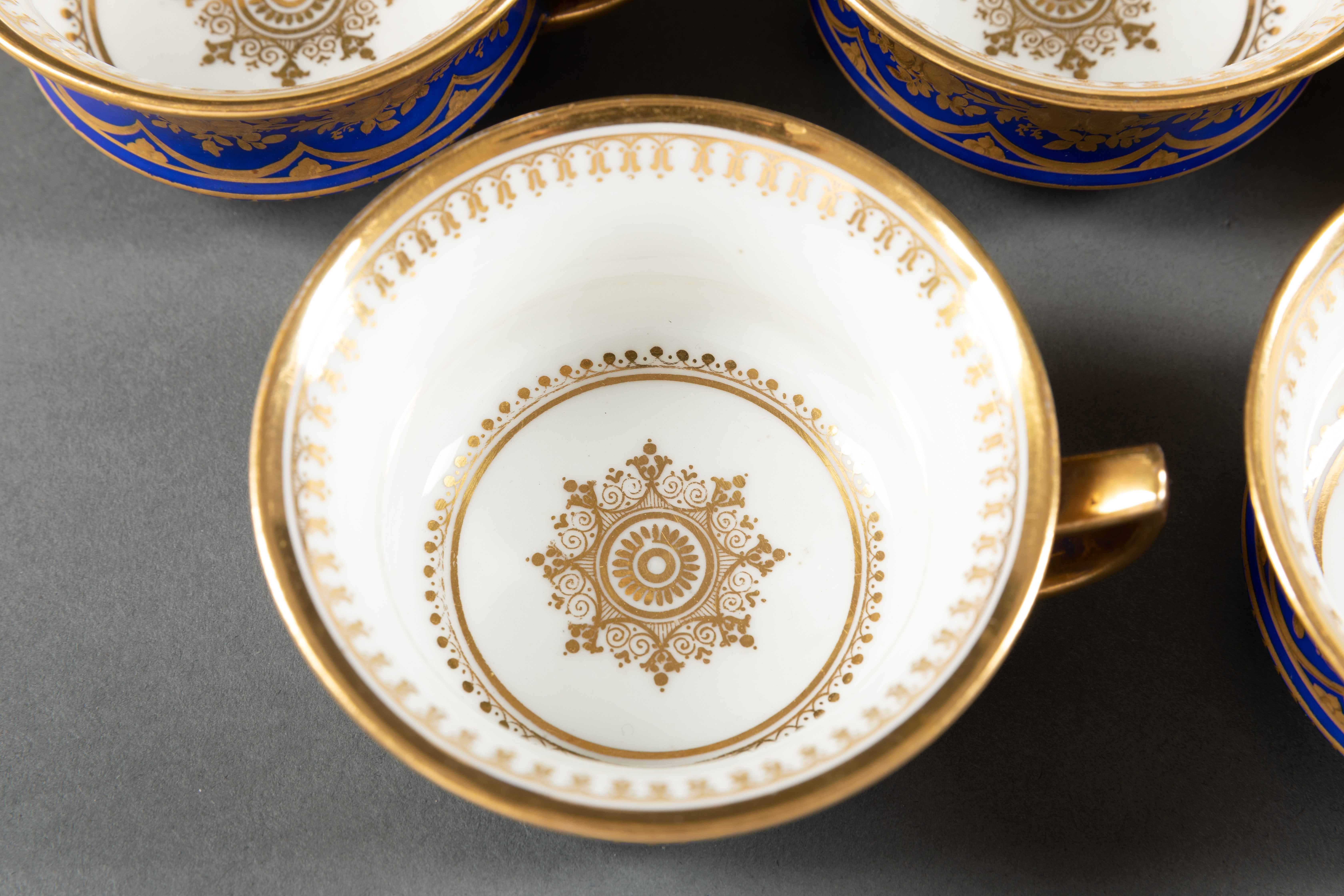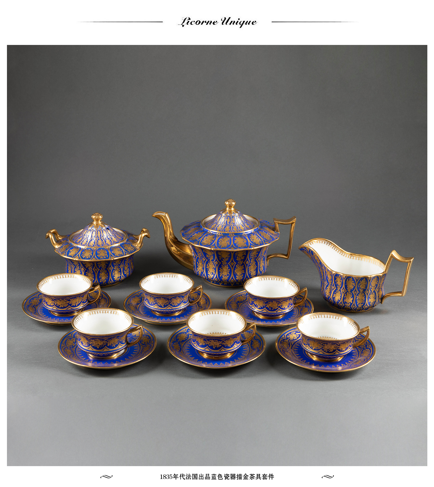 独角鹿西洋古董1835年代法国出品蓝色瓷器描金下午茶茶具套件