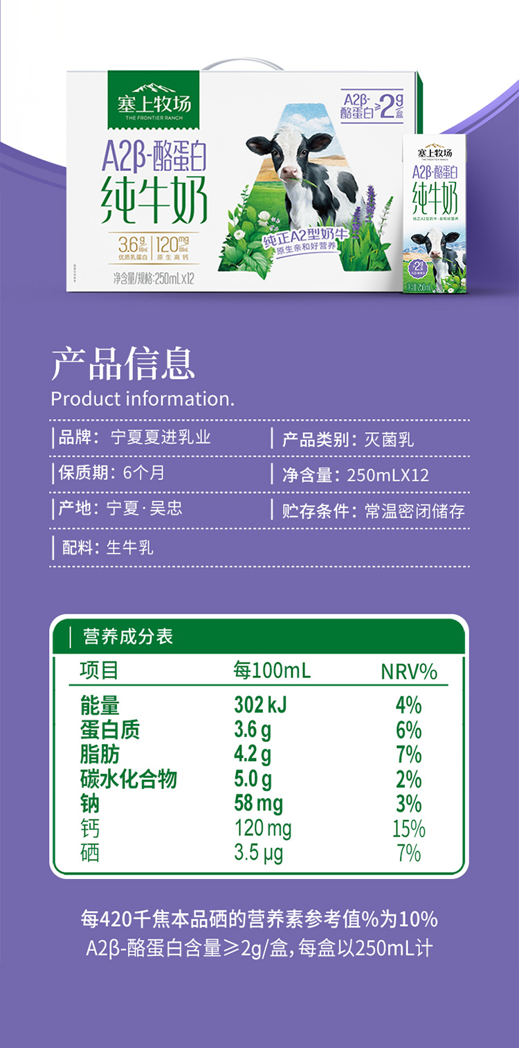 塞上牧场A2β-酪蛋白纯牛奶 250ml×12盒