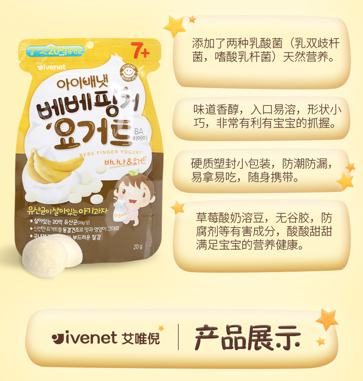 韩国原装进口艾唯倪贝贝ivenet酸奶溶豆 宝宝零食益生菌奶豆(香蕉味)20G