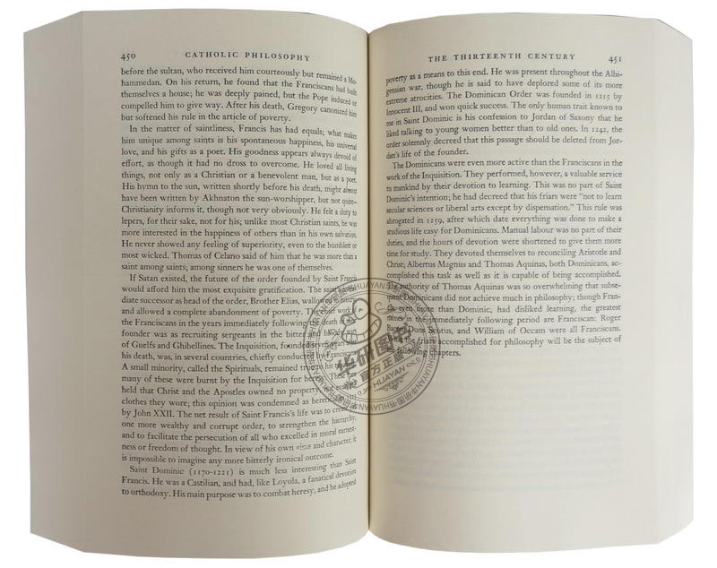 The History of Western Philosophy《西方哲学史》是一部很有特色的讨论西方哲学史的著作,全面考察了从古希腊罗马时期到20世纪中叶西方哲学思潮的发展历程。罗素将哲学看作某种介乎神学和科学之间的东西,基于对哲学的这种理解,他认为西方哲学在发展过程中始终受到来自科学和宗教两方面的影响,并据此把西方哲学发展史划分为古代哲学、天主教哲学和近代哲学三个时期,揭示了在哲学的发展历程中,科学与宗教、社会团结和个人自由是如何错综复杂地交织在一起与哲学交互作用的。