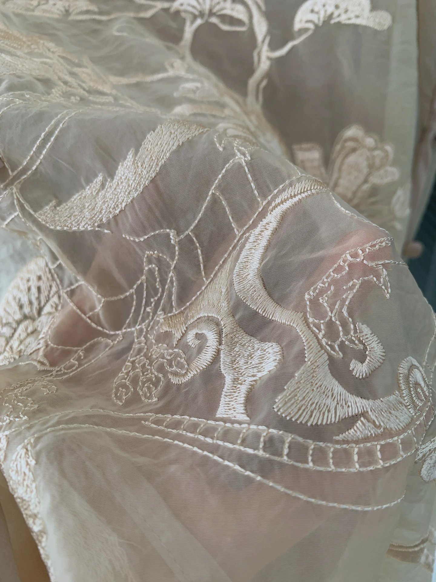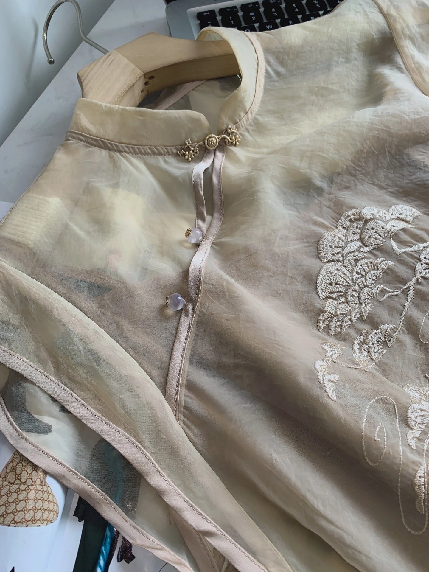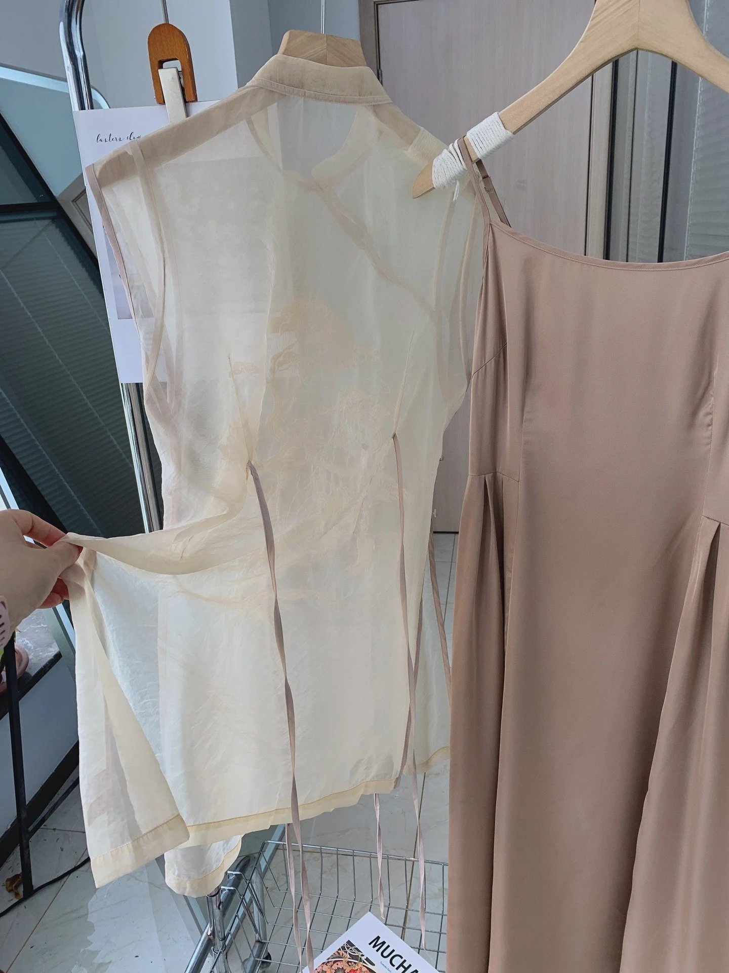 外层罩衫像软的欧根纱,有型但不扎!!