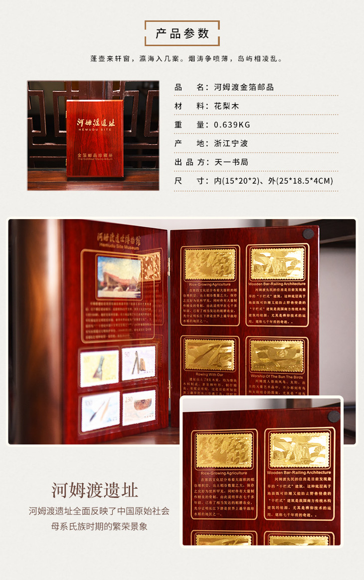 天一书局出品 河姆渡金箔邮品 地方特色花梨木复古礼品装