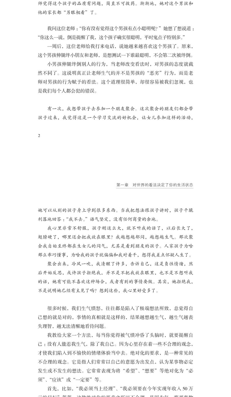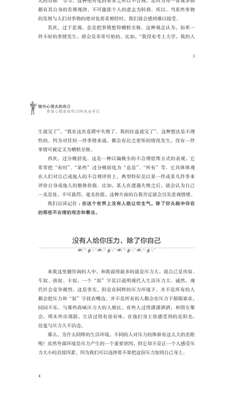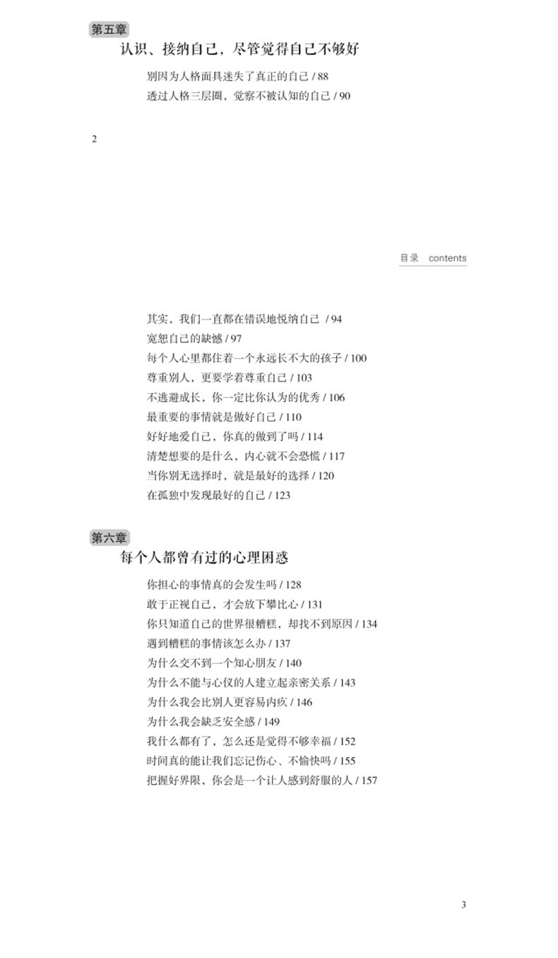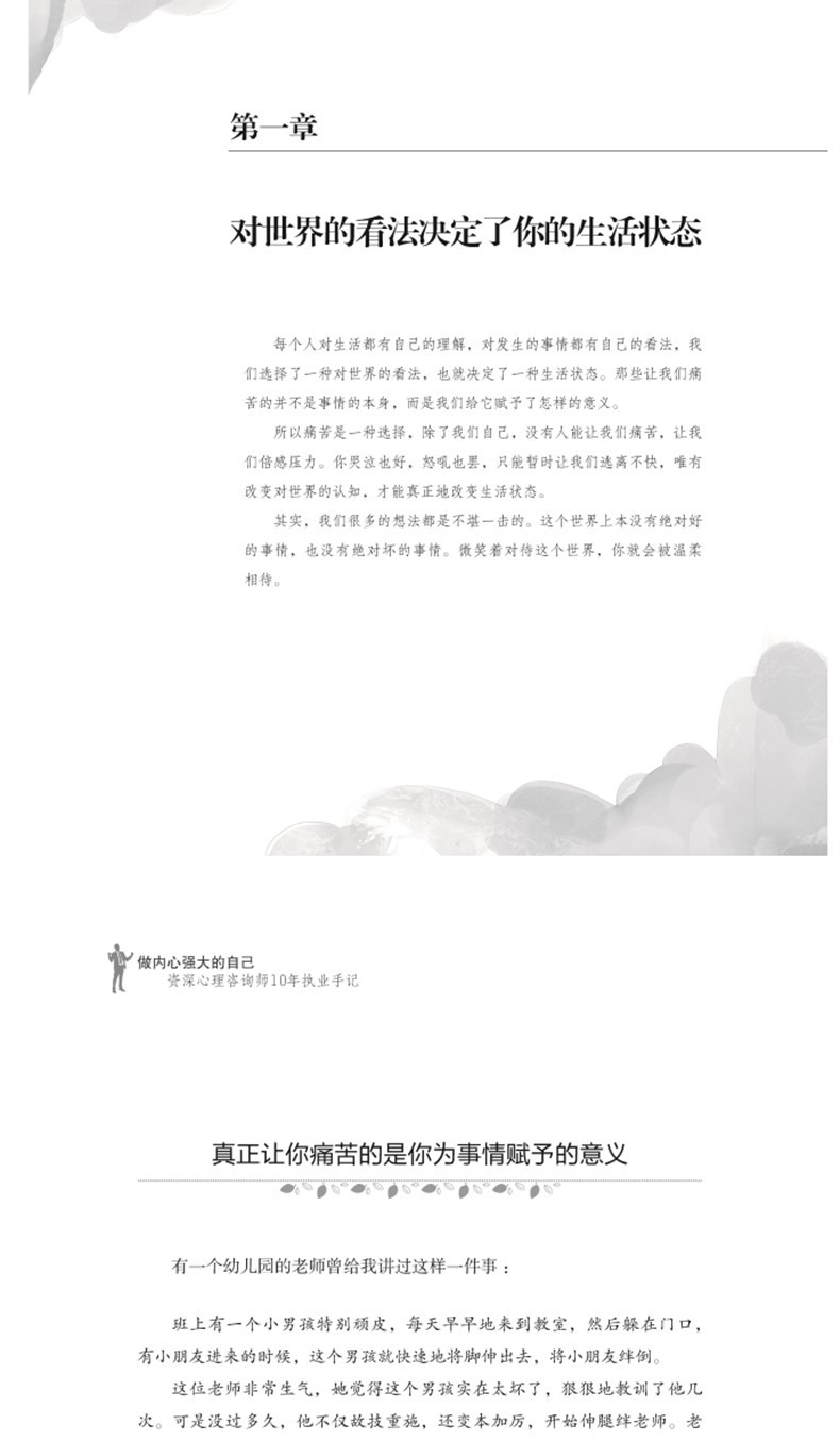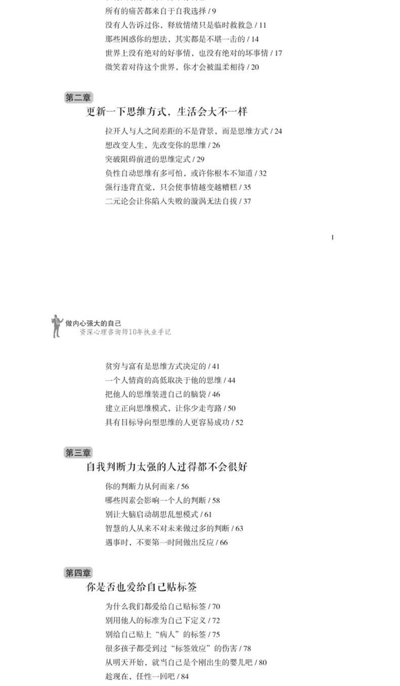 第一章#8195;对世界的看法决定了你的生活状态真正让你痛苦的是你为事情赋予的意义 / 2没有人给你压力,除了你自己 / 4所有的痛苦都来自于自我选择 / 9没有人告诉过你,释放情绪只是临时救救急 / 11那些困惑你的想法,其实都是不堪一击的 / 14世界上没有的好事情,也没有的坏事情 / 17微笑着对待这个世界,你才会被温柔相待 / 20第二章#8195;更新一下思维方式,生活会大不一样拉开人与人之间差距的不是背景,而是思维方式 / 24想改变人生,先改变你的思维 / 26突破阻碍前进的思维定式 / 29负性自动思维有多可怕,或许你根本不知道 / 32强行违背直觉,只会使事情越变越糟糕 / 35二元论会让你陷入失败的漩涡无法自拔 / 37贫穷与富有是思维方式决定的 / 41一个人情商的高低取决于他的思维 / 44把他人的思维装进自己的脑袋 / 46建立正向思维模式,让你少走弯路 / 50具有目标导向型思维的人更容易成功 / 52第三章#8195;自我判断力太强的人过得都不会很好你的判断力从何而来 / 56哪些因素会影响一个人的判断 / 58别让大脑启动胡思乱想模式 / 61智慧的人从来不对未来做过多的判断 / 63遇事时,不要第一时间做出反应 / 66第四章 你是否也爱给自己贴标签为什么我们都爱给自己贴标签 / 70别用他人的标准为自己下定义 / 72别给自己贴上“病人”的标签 / 75很多孩子都受到过“标签效应”的伤害 / 78从明天开始,就当自己是个刚出生的婴儿吧 / 80趁现在,任性一回吧 / 84第五章 认识、接纳自己,尽管觉得自己不够好别因为人格面具迷失了真正的自己 / 88透过人格三层圈,觉察不被认知的自己 / 90其实,我们一直都在错误地悦纳自己 / 94宽恕自己的缺憾 / 97每个人心里都住着一个永远长不大的孩子 / 100尊重别人,更要学着尊重自己 / 103不逃避成长,你一定比你认为的优秀 / 106最重要的事情就是做好自己 / 110好好地爱自己,你真的做到了吗 / 114清楚想要的是什么,内心就不会恐慌 / 117当你别无选择时,就是最好的选择 / 120在孤独中发现最好的自己 / 123第六章#8195;每个人都曾有过的心理困惑你担心的事情真的会发生吗 / 128敢于正视自己,才会放下攀比心 / 131你只知道自己的世界很糟糕,却找不到原因 / 134遇到糟糕的事情该怎么办 / 137为什么交不到一个知心朋友 / 140为什么不能与心仪的人建立起亲密关系 / 143为什么我会比别人更容易内疚 / 146为什么我会缺乏安全感 / 149我什么都有了,怎么还是觉得不够幸福 / 152时间真的能让我们忘记伤心、不愉快吗 / 155把握好界限,你会是一个让人感到舒服的人 / 157第七章#8195;内心充盈,胜过繁华万千对坏情绪要及时止损 / 162不苛求的公平 / 165用忙碌打败无聊 / 167当你不够了解自己时,最喜欢逃避问题 / 170别去找借口,和自己偷偷地说句实话 / 173懒惰让你的问题重复出现 / 176解决问题只需要这两步 / 179管理好时间,让你的生命充盈起来 / 182人要知足,也要进取 / 185随遇而安不是不努力,而是心安理得地面对结果 / 188我们需要一点阿Q精神 / 190心中有所期待,日子就会过得很美 / 193内心安宁,你的世界才足够美好 / 196