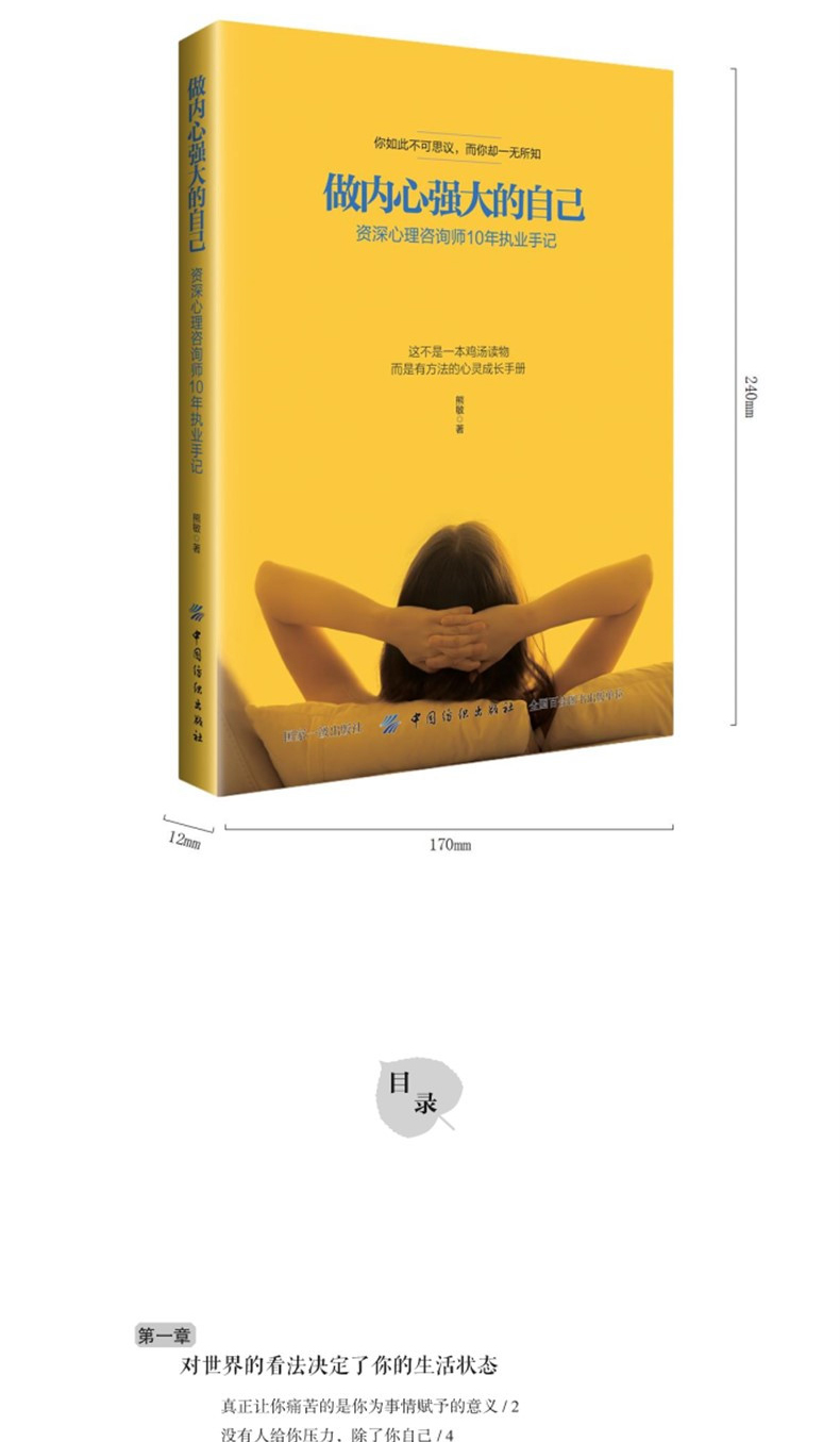 《做内心强大的自己:资深心理咨询师10年执业手记》共七章内容,从看问题的角度、思维方式、自我判断力、活在别人贴的标签里、认识接纳自己、都市人常见的心理困惑、让心灵成长的方法七个方面来阐述。通过作者的亲身经历和真实的咨询案例,深入浅出地为大家解读心灵密码,让大家在享受美好都市生活的同时,也给心灵做一次SPA。这不是一本鸡汤读物,而是有方法的心灵成长手册。希望通过阅读本书,让更多人重拾简单的小幸福,每天都能身心愉悦地好好享受生活。