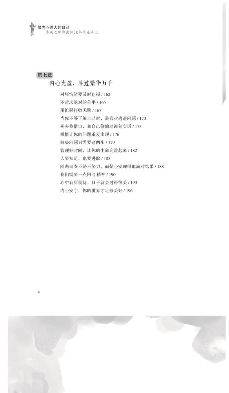 瞬息万变的世界,让我们的日子过得紧张忙碌,拼命地往前赶,生怕一不小心就被遗忘在了某个角落里,努力工作,可劲地给自己充电。收入越来越多,职位越来越高,可以换个大房子了,可以开上心仪已久、价格不菲的车了,一切看上去都是那么美好而幸福,却突然感觉心里空落落的。前不久,我的一个朋友约我喝下午茶,说想和我聊聊人生。我的这个朋友一直是我励志的榜样,在一家知名外企任财务总监,的职场精英、白富美。那天,她一脸疲惫地坐在我对面,跟我絮叨生活、工作的不容易,满腹牢骚,像极了祥林嫂,似乎在她眼中就没有一件顺心,让她高兴的事情,尽管她已经坐在了令很多人都仰望的位置,拿着别人想都不敢想的收入。她问我自己是不是病了?为什么会这样?其实,朋友的这种情况并不是个例。来我这里咨询的人大都是事业有成的人。他们的问题在于只注重外在的成功,比如,追求高收入,获得高职位,赢得好名誉,却忽视了心灵的成长,结果导致外强中干。当他们所追求的外在目标都得到满足时,紧张的神经一放松下来,就会突然间感觉心里空落落的。我们很多时候过得都是不走心的生活,心灵是干涸的,人生怎么会快乐呢?而且心灵未成长,也会阻碍我们外在的成长。因为一个人要想走得更远,站得更高,必须要有强大的内心做支撑。让心灵充盈起来,我们的生活才会大不一样,不会为外物所累,不会被金钱所扰,享有一份积极向上又娴雅的情趣生活,这是我写这本书的中心思想。本书从看问题的角度、思维方式、自我判断力、活在别人贴的标签里、认识接纳自己、都市人常见心理困惑、让心灵成长的方法七个方面来阐述,通过我的亲身经历和真实的咨询案例,深入浅出地为大家解读心灵密码,让大家在享受美好都市生活的同时,也给心灵做一次SPA。这不是一本鸡汤读物,而是有方法的心灵成长手册。希望通过阅读本书,让更多人重拾简单的小幸福,每天都能身心愉悦地好好享受生活