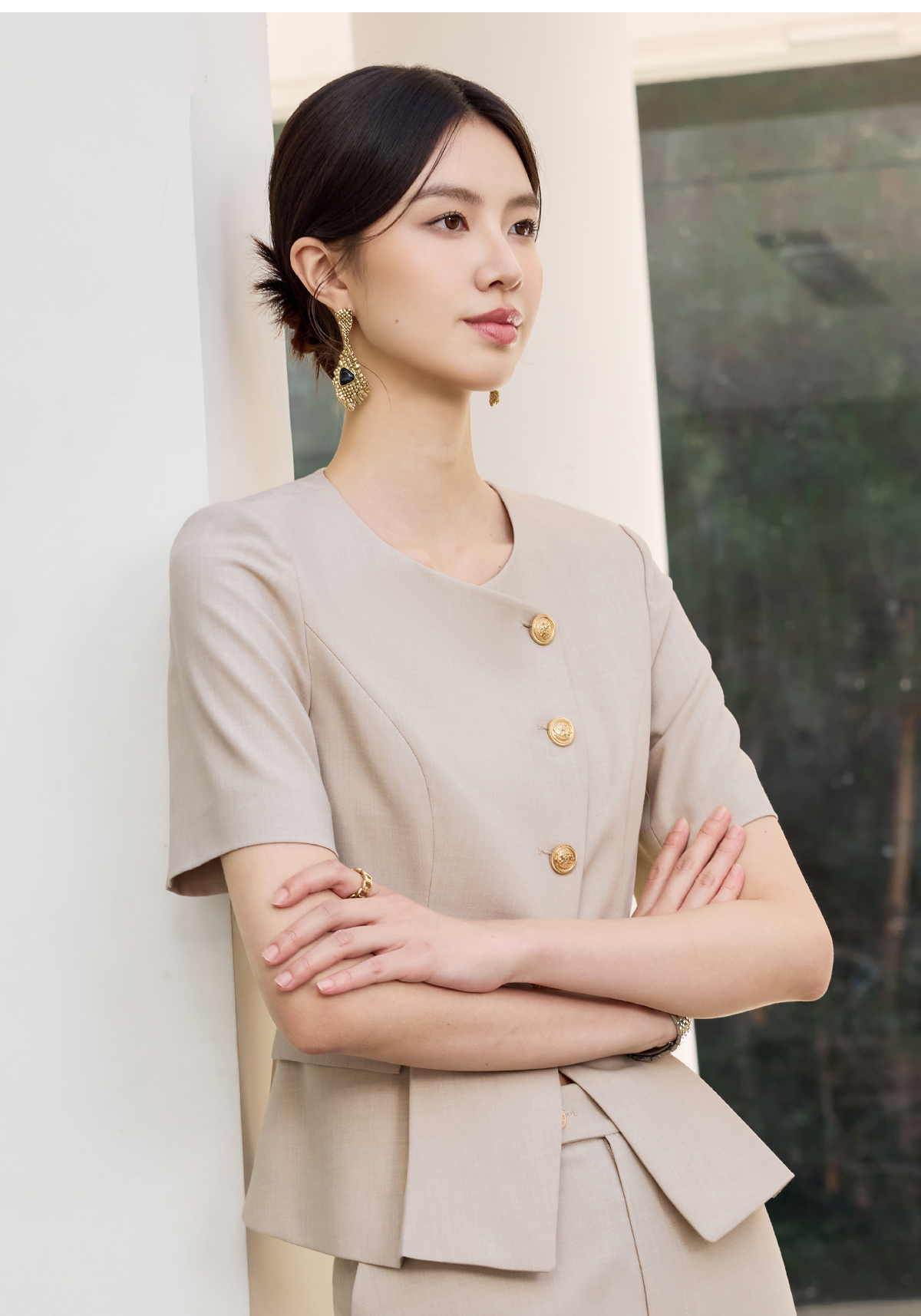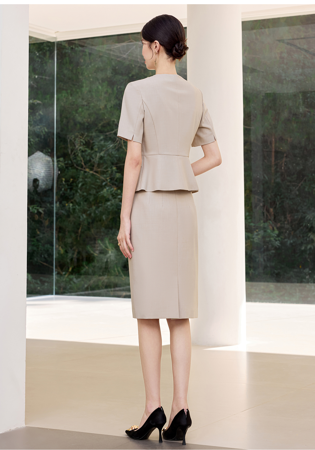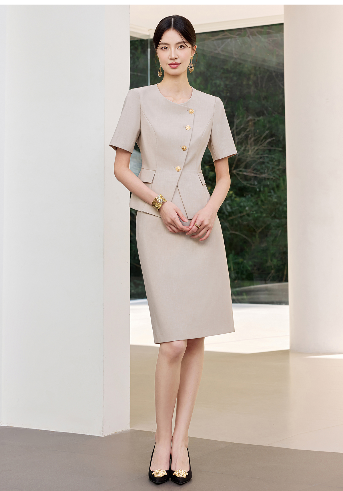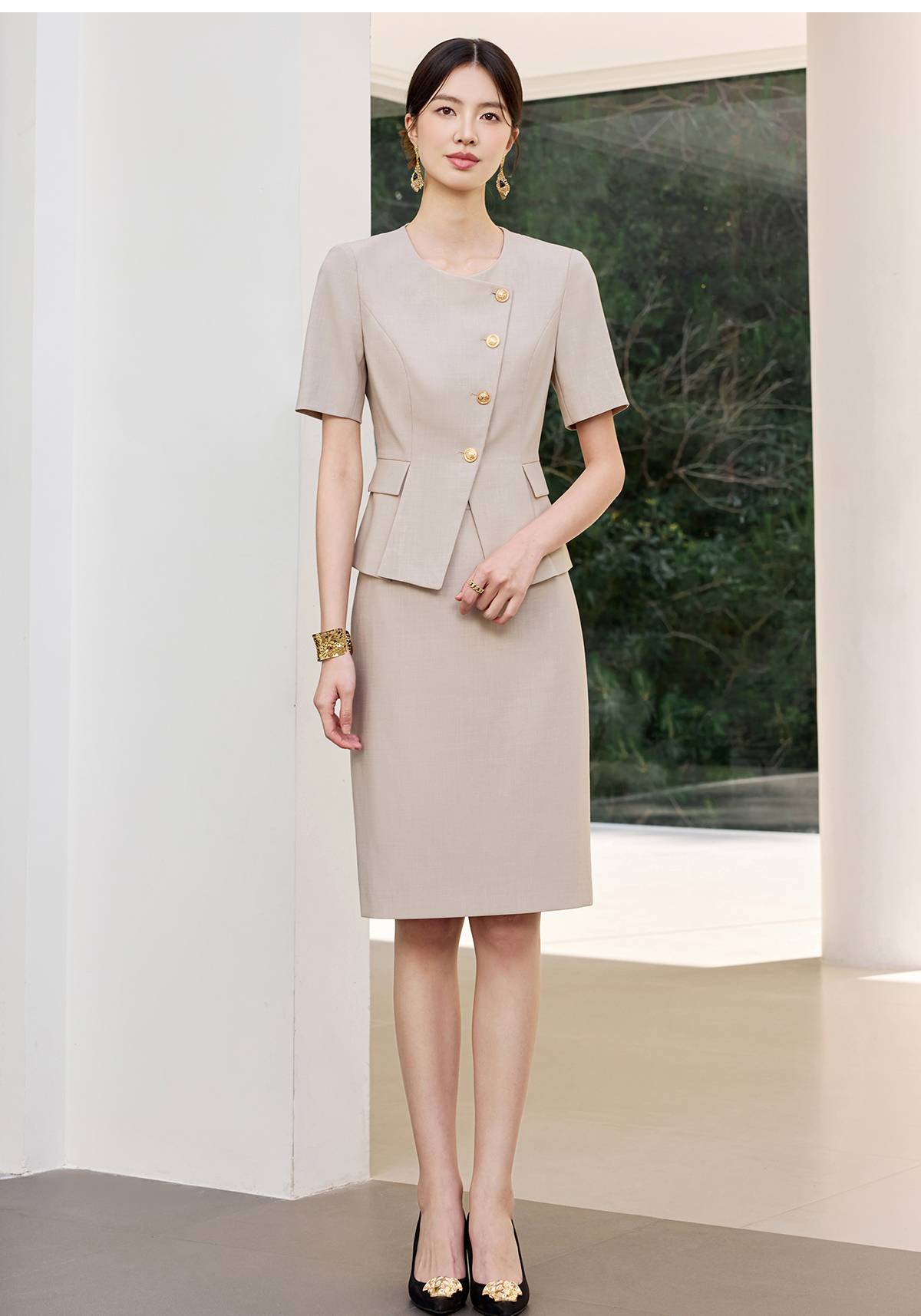 IWY/气质燕麦色短袖西装套裙女正式场合接待工作服干练职业裙装25CS801