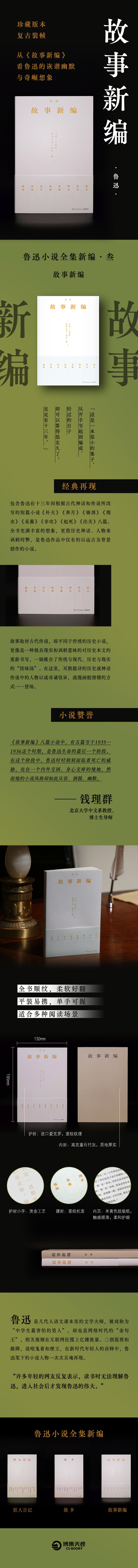 本书收录鲁迅在十三年间陆续创作的八篇独特的短篇小说。故事取材古代传说,却不同于传统的历史小说,更像是一种极具现实和讽刺意味的对历史本文的重新书写,一锅糅合了传统与现代、历史与现实的“怪味汤”。在这里,耳熟能详的历史或神话传说中的人物以或奇谲怪异,或漫画般滑稽的方式一一登场。小说情节荒诞,手法卓绝,呈现出不曾有过的风格,至今读来,先锋依旧。