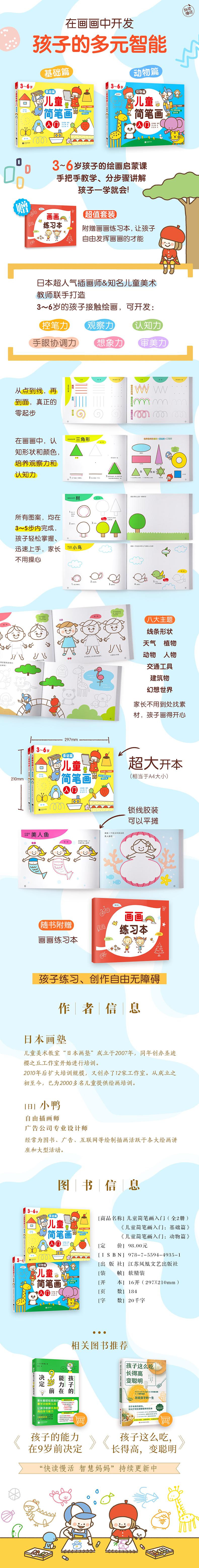 《儿童简笔画入门(附练习本3-6岁共2册)》包含《基础篇》和《动物篇》2册。本套书是日本超人气插画师与知名儿童美术教室联手打造的针对3~6岁儿童的绘画入门教程,步骤详细,内容丰富有趣,由浅入深,开发孩子的多元智能,陪伴孩子聪明快乐地成长!