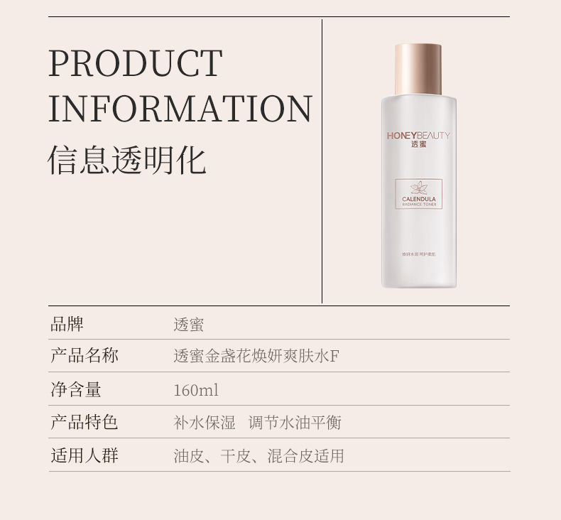 【蜜家特惠】透蜜 金盏花焕妍爽肤水160ml 清爽补水收敛毛孔平衡水油