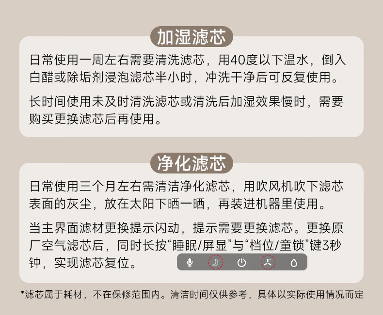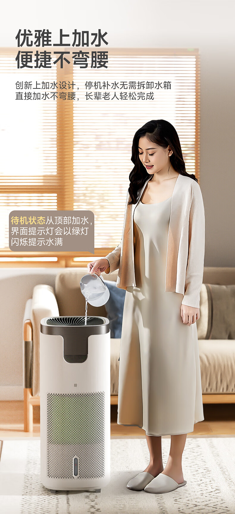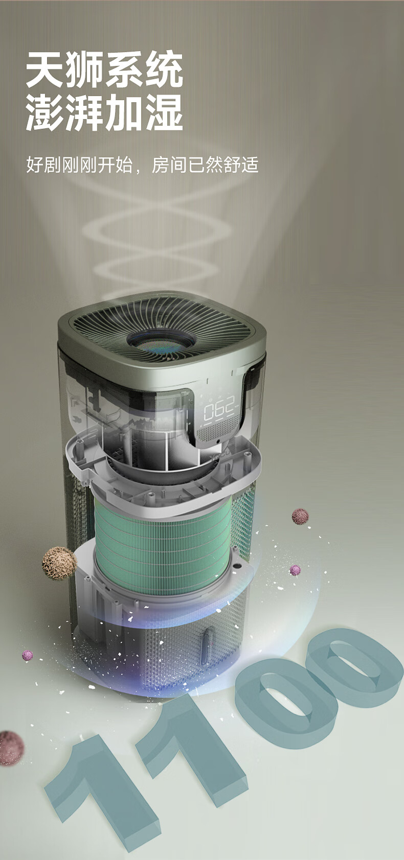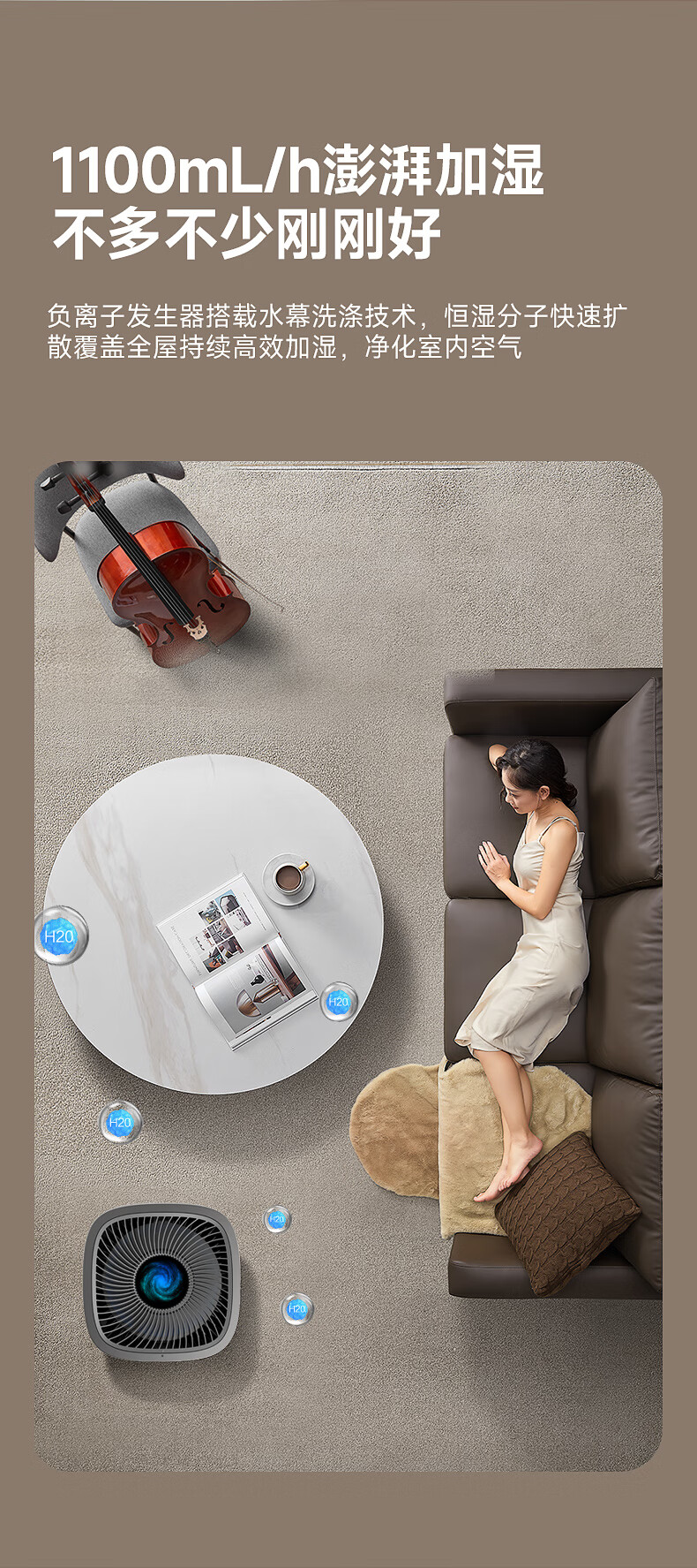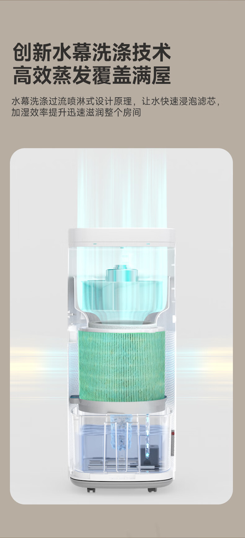 1:喷淋式加湿避免滤芯长期浸泡,1100ml/h超高加湿量,8.8L水箱。高效加湿长续航