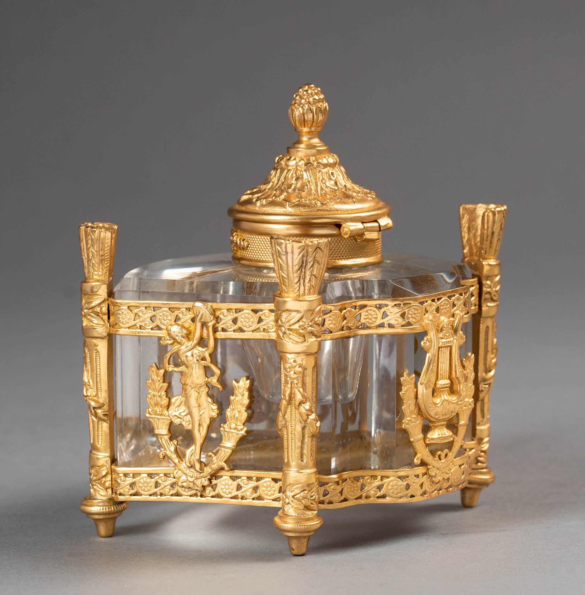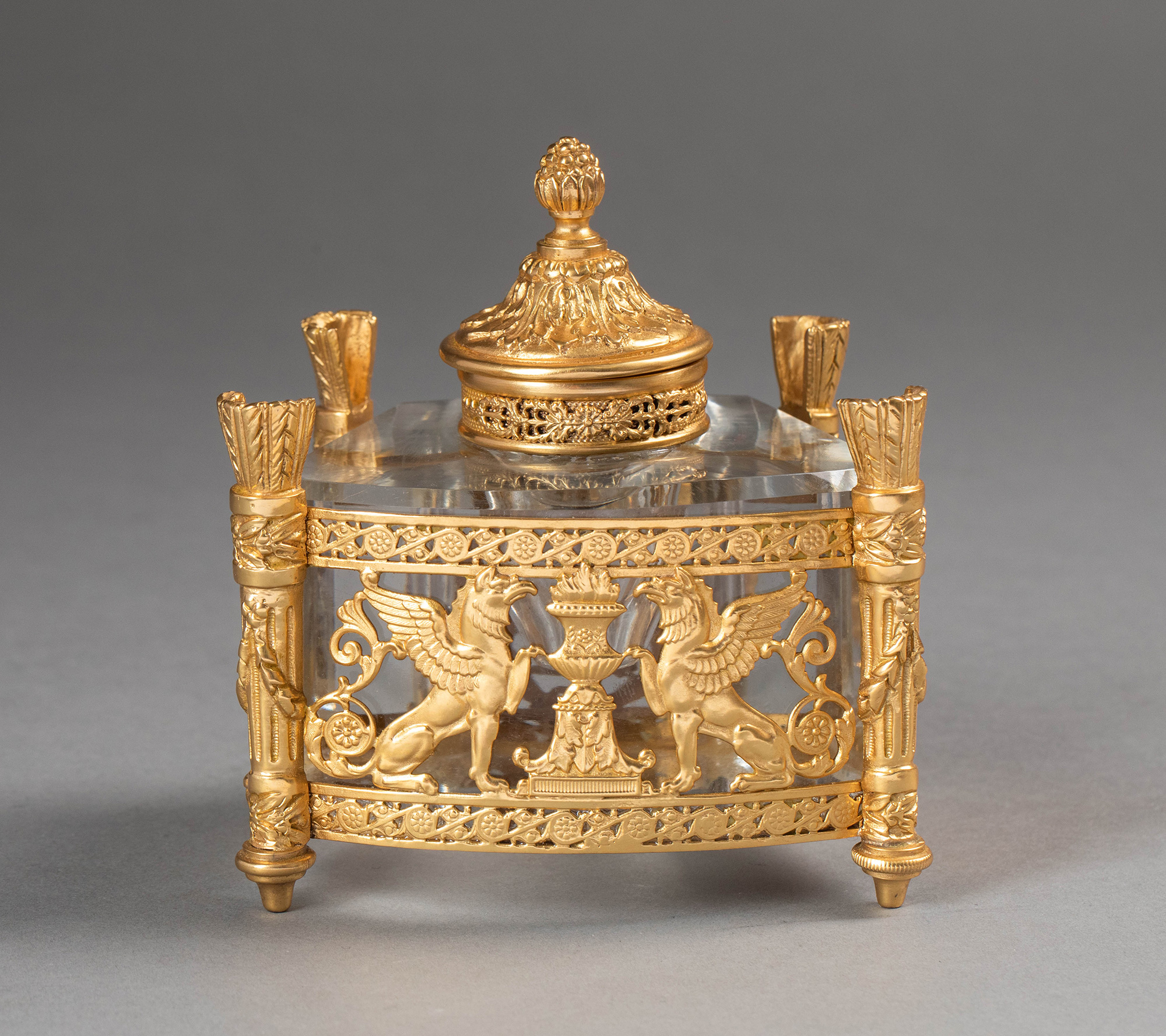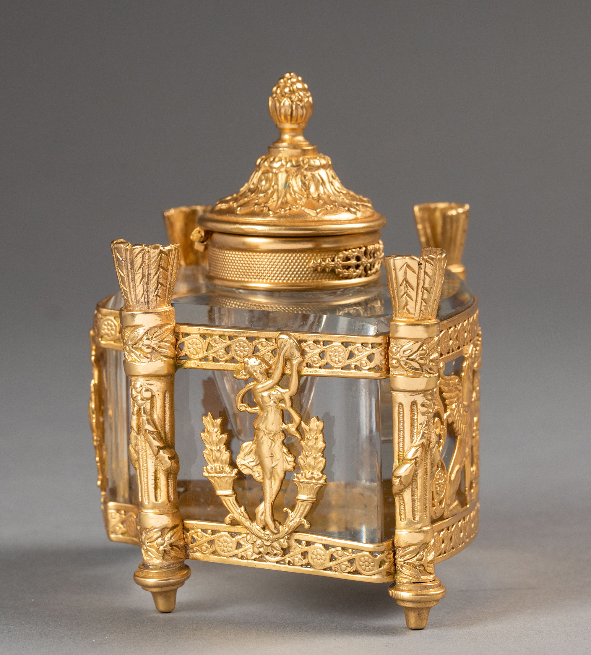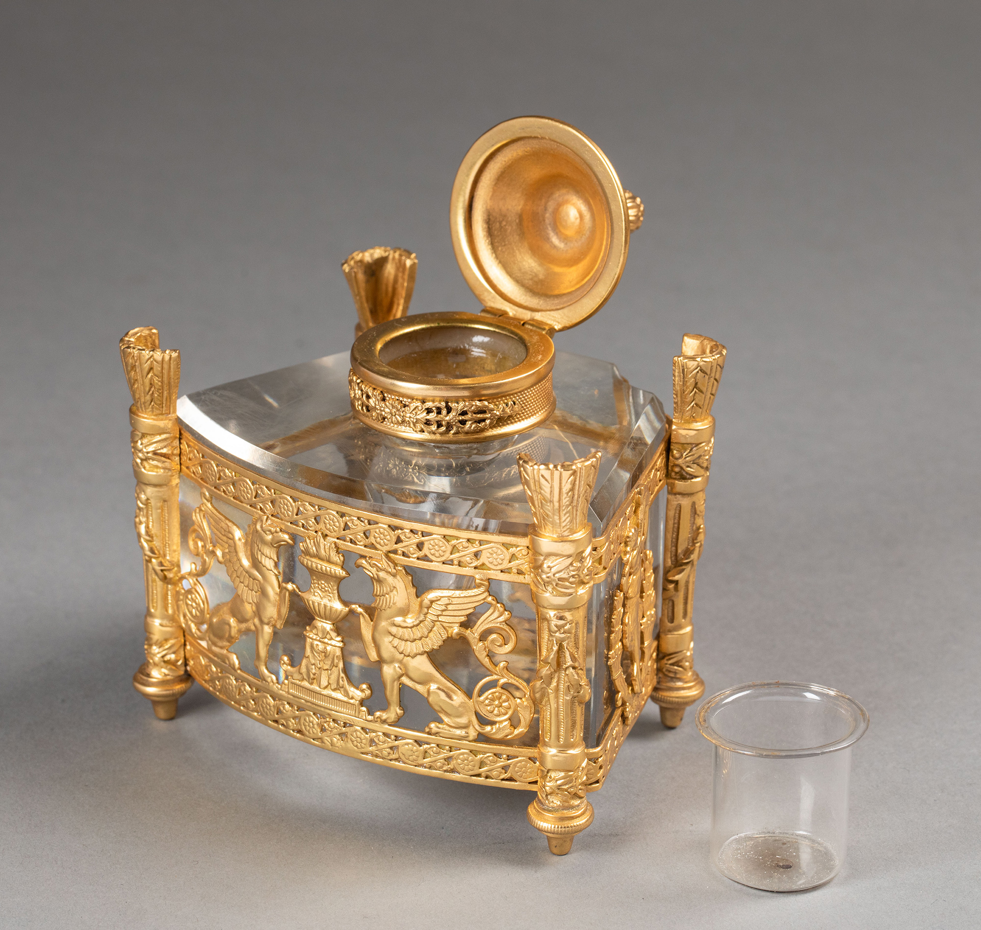 19世纪法国出品火炬立柱造型双翼鹰头狮身神兽主题铜鎏金精雕嵌水晶墨水瓶