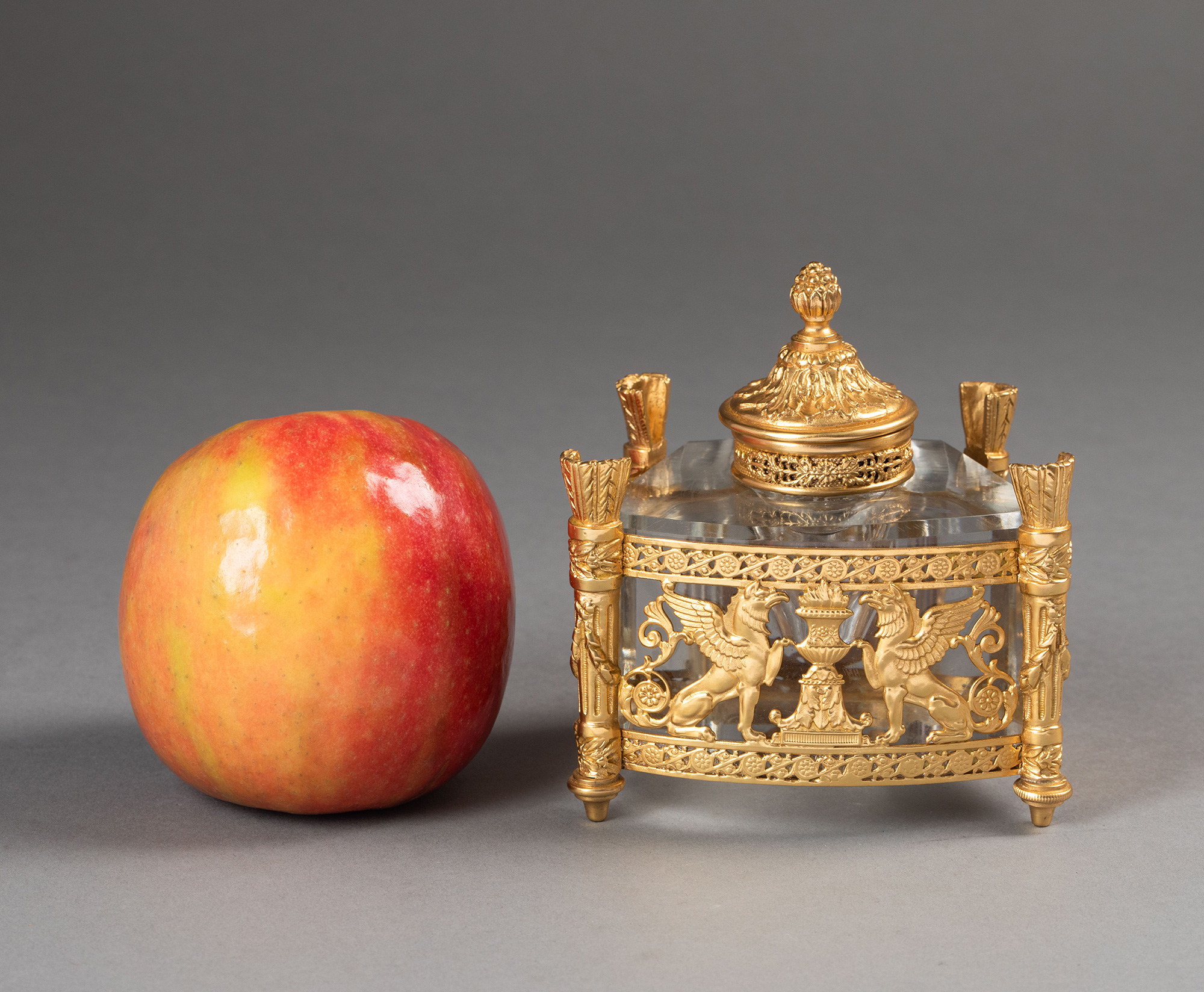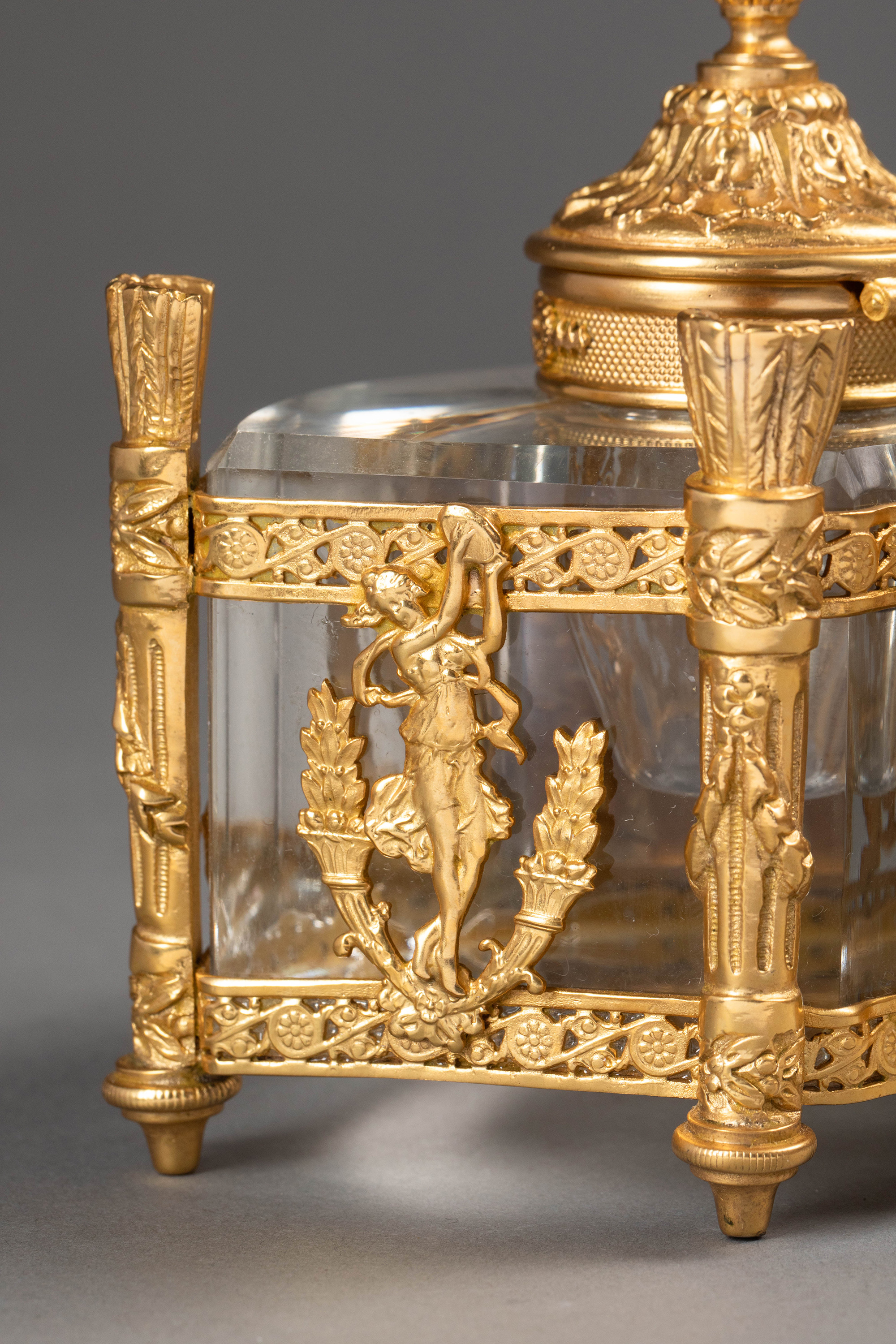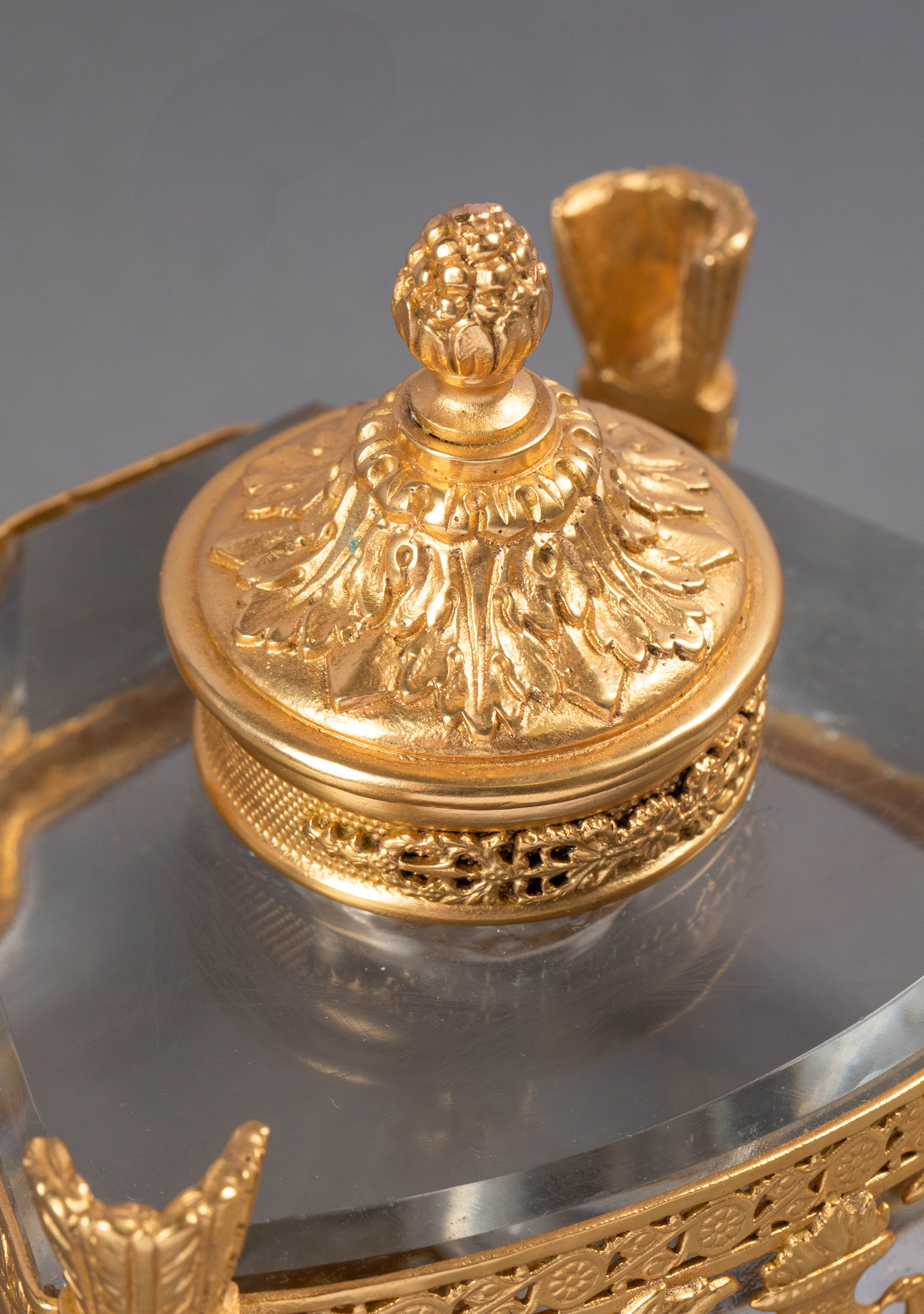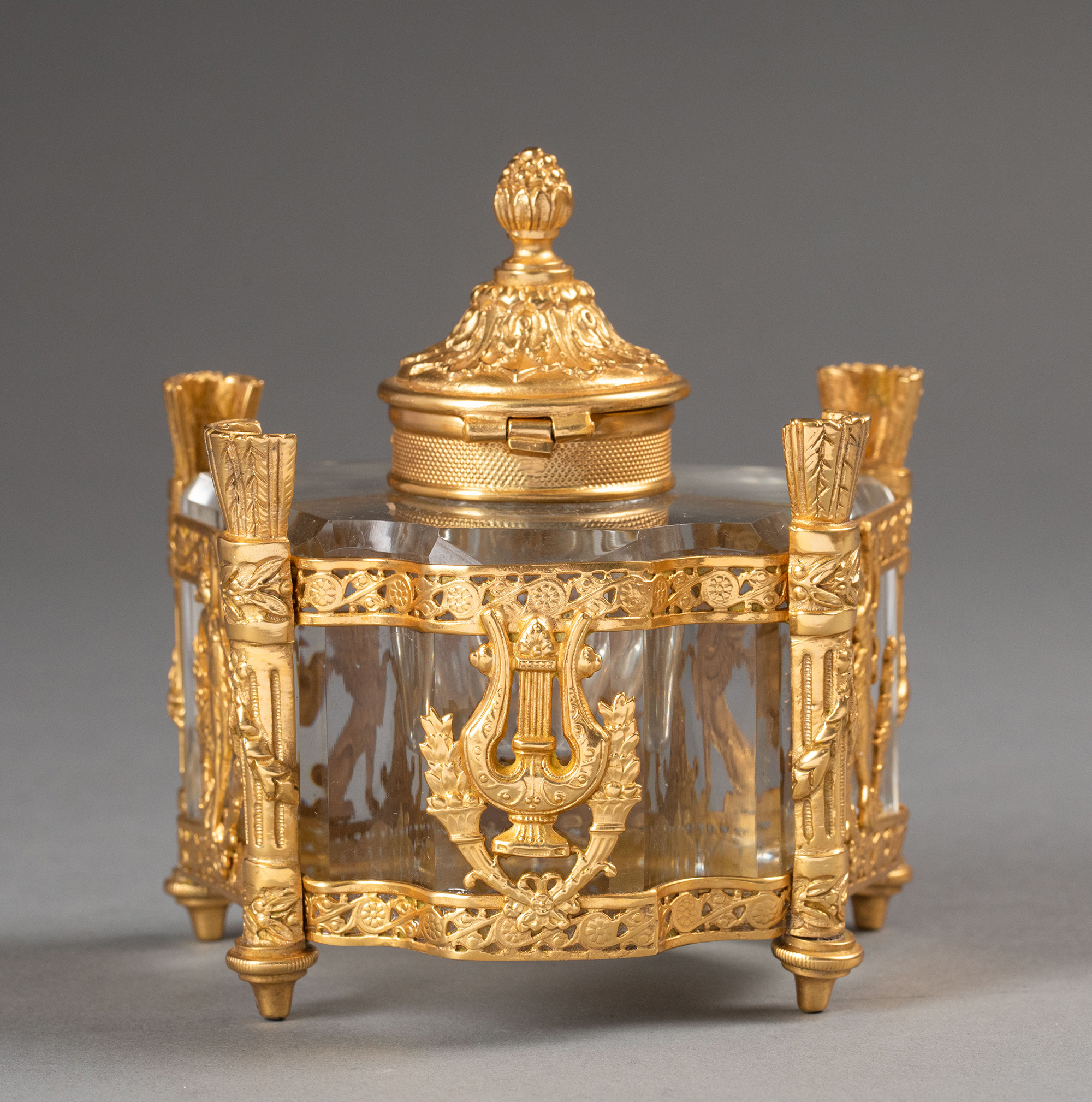 19世纪法国出品火炬立柱造型双翼鹰头狮身神兽主题铜鎏金精雕嵌水晶墨水瓶