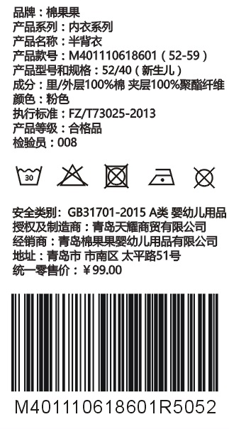 棉果果秋冬季男童女童内衣铺棉半背衣M401110818602