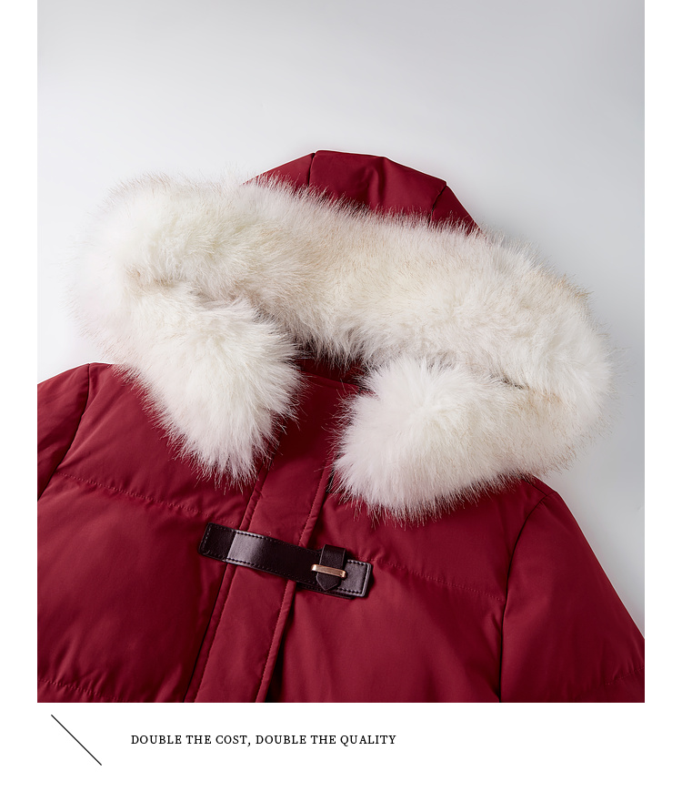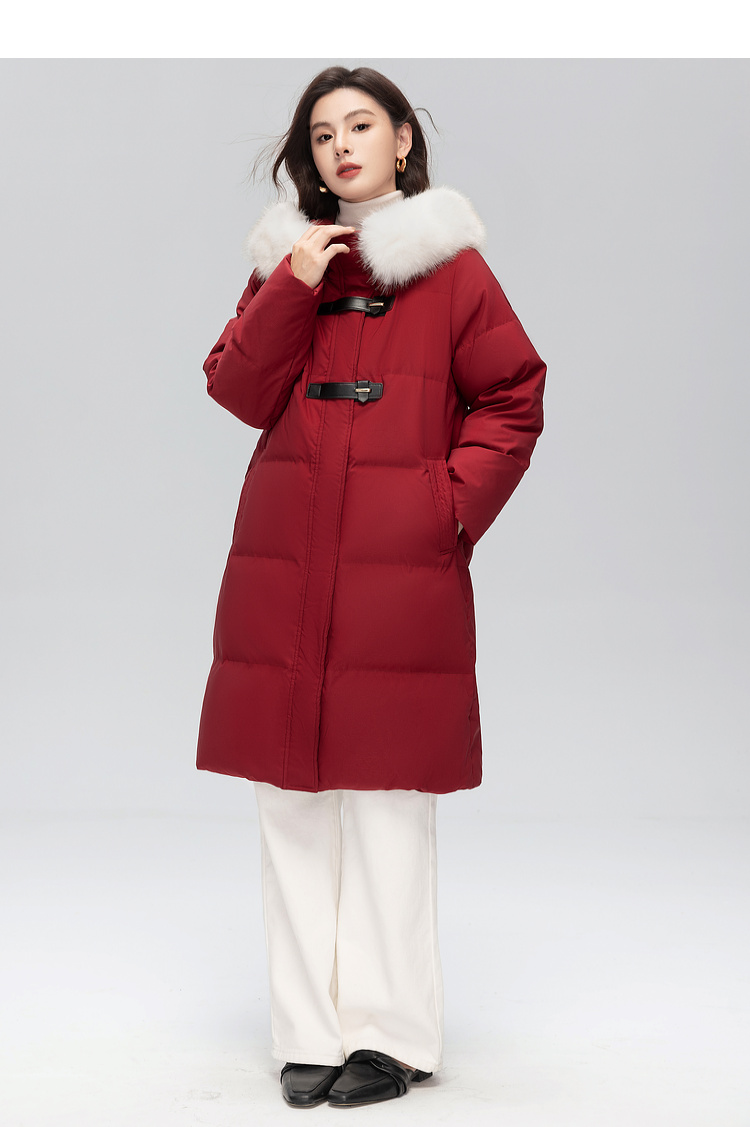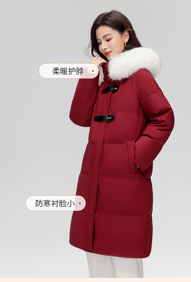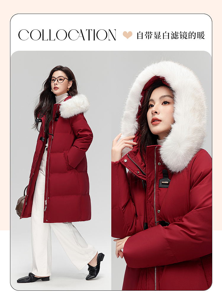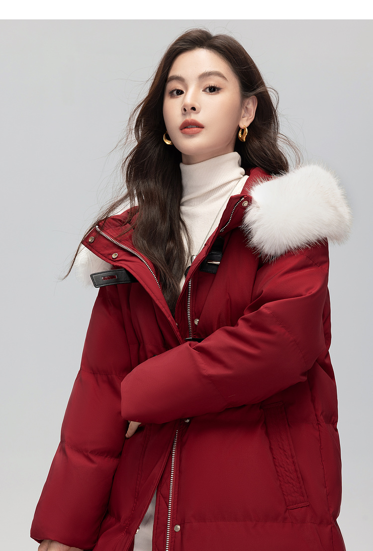 【年货节】熙世界可拆卸毛领90白鸭绒红色羽绒服女中长款时尚保暖外套冬季