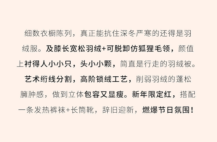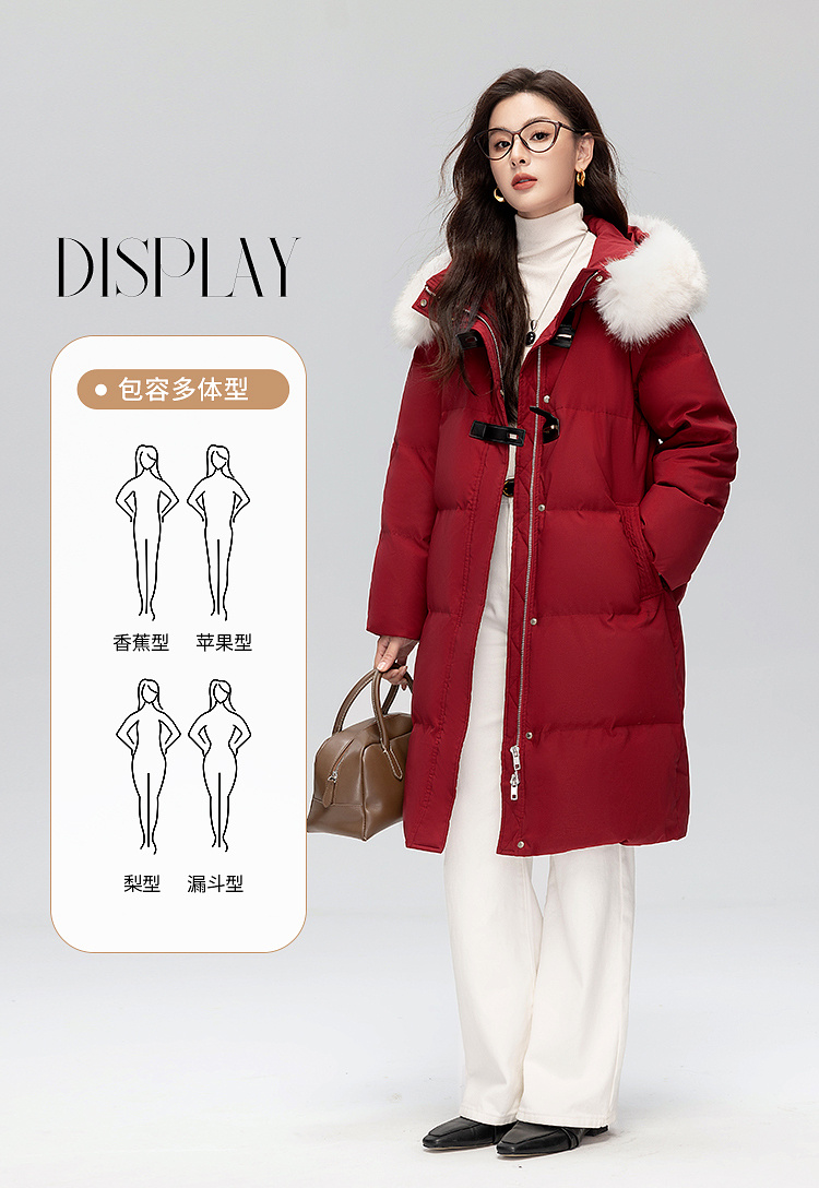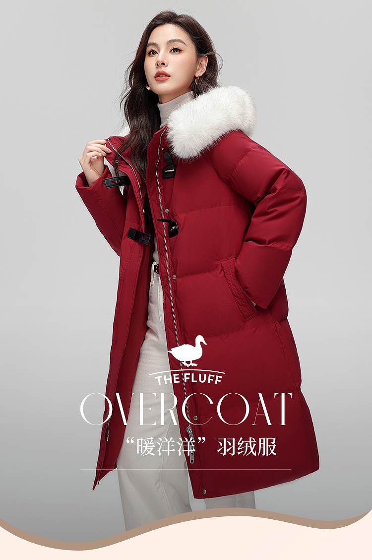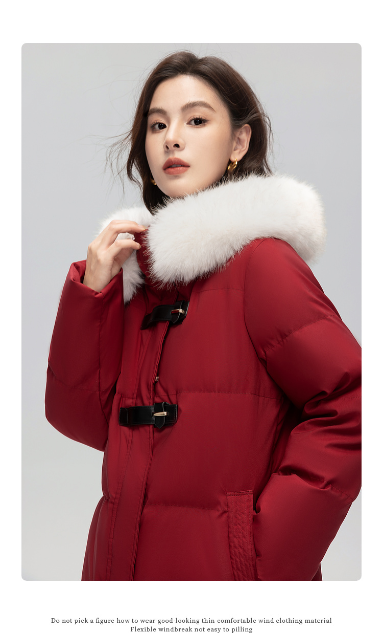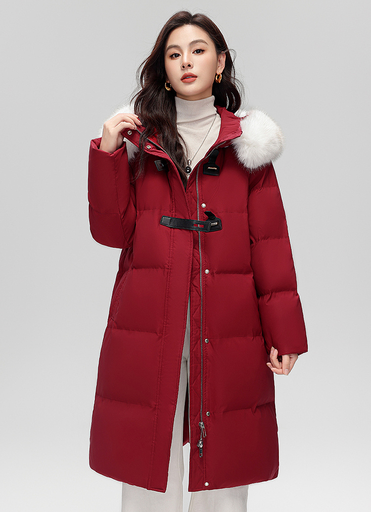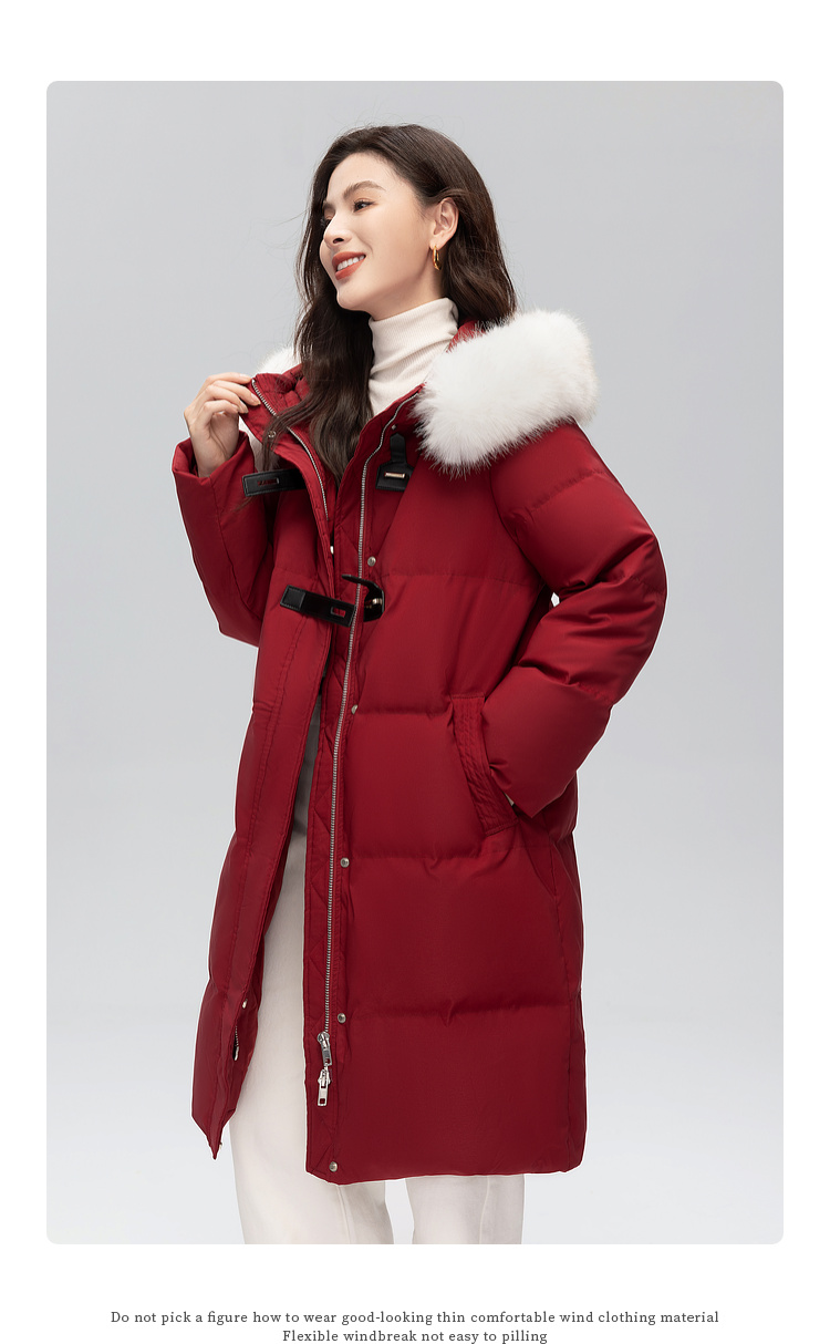 【年货节】熙世界可拆卸毛领90白鸭绒红色羽绒服女中长款时尚保暖外套冬季