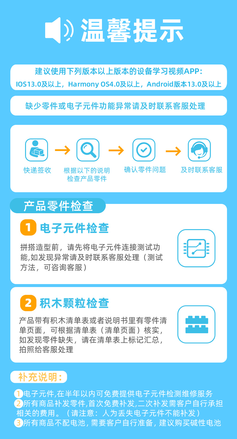 购买后半年内,积木可首次免费补件,不超过积木总量5%;后续补件需额外付费。