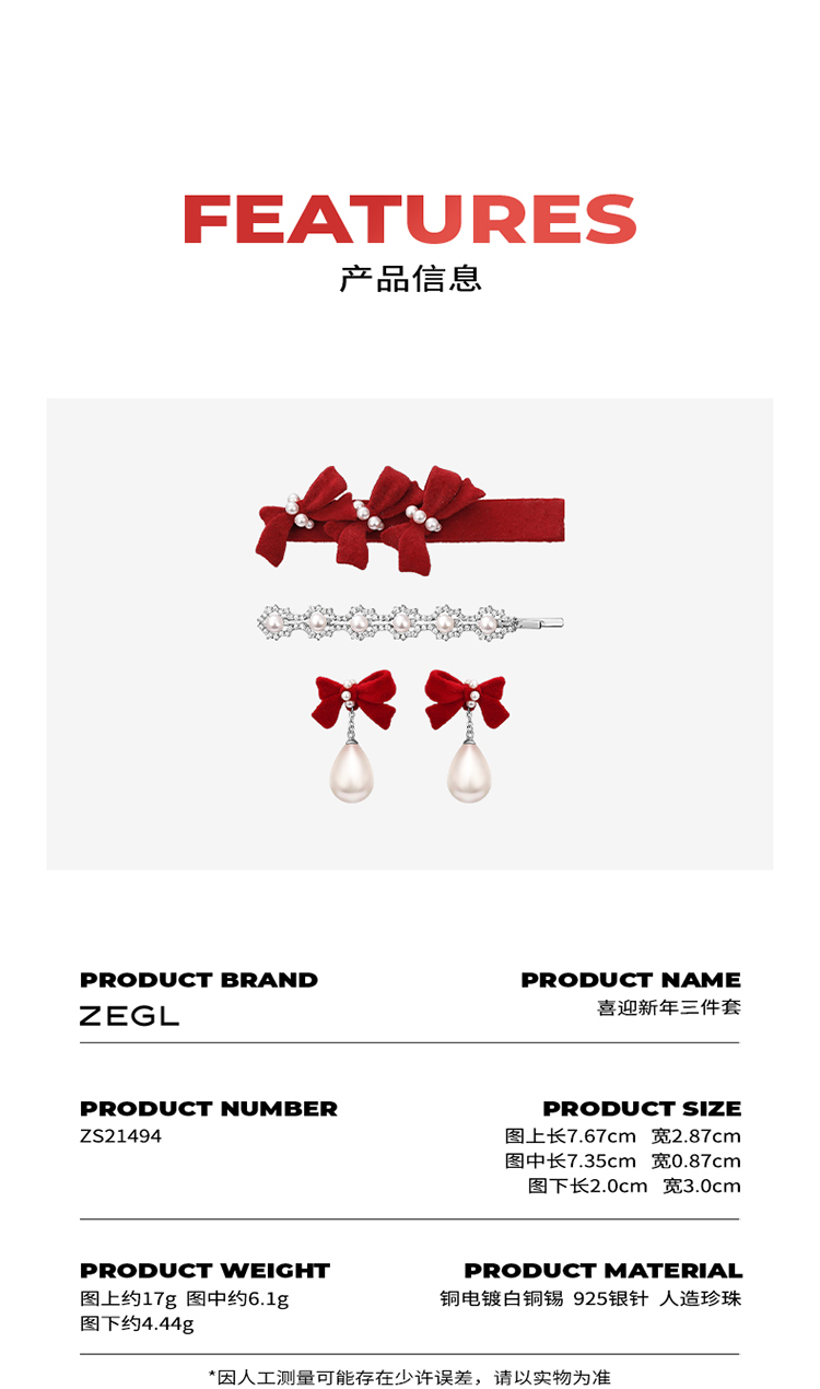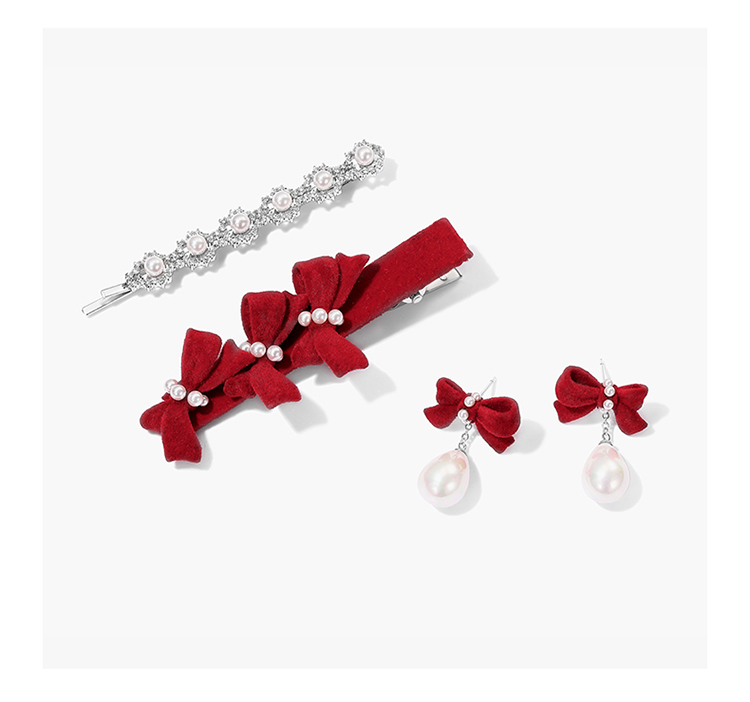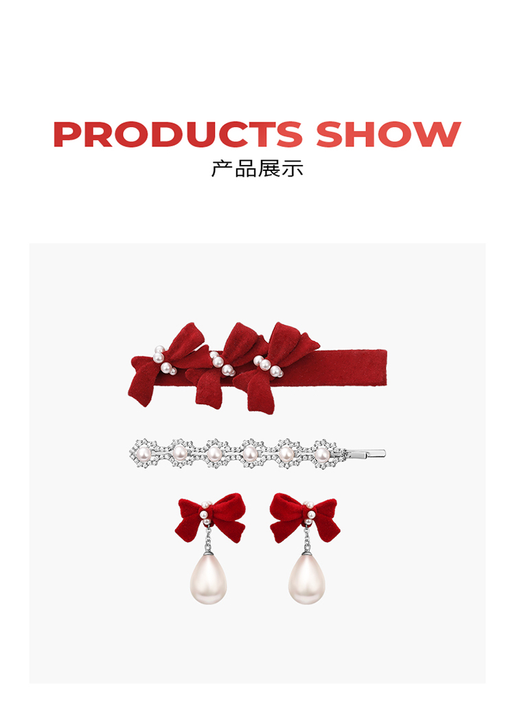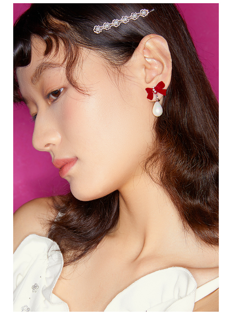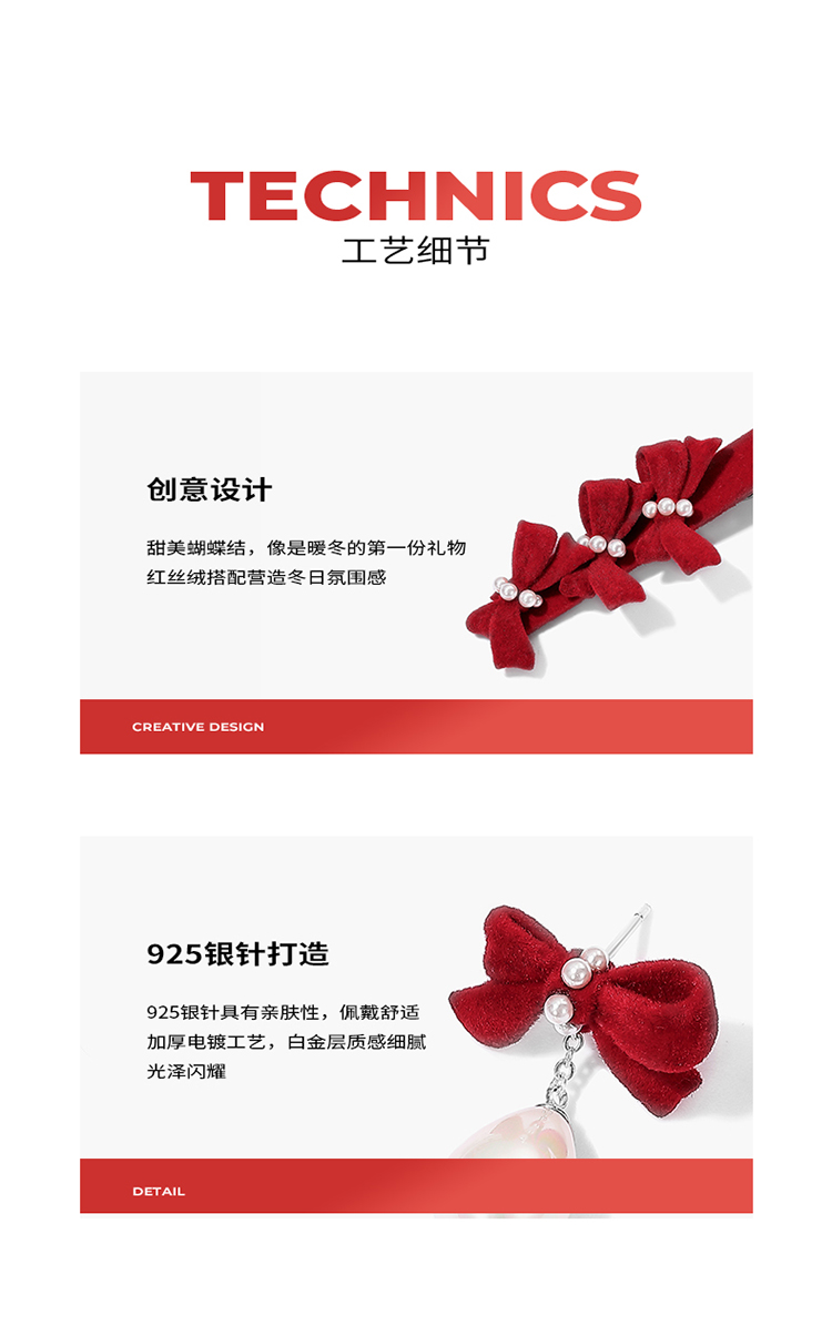 ZEGL设计师新年系列红色蝴蝶结发夹女发饰耳环925银针红丝绒耳饰
