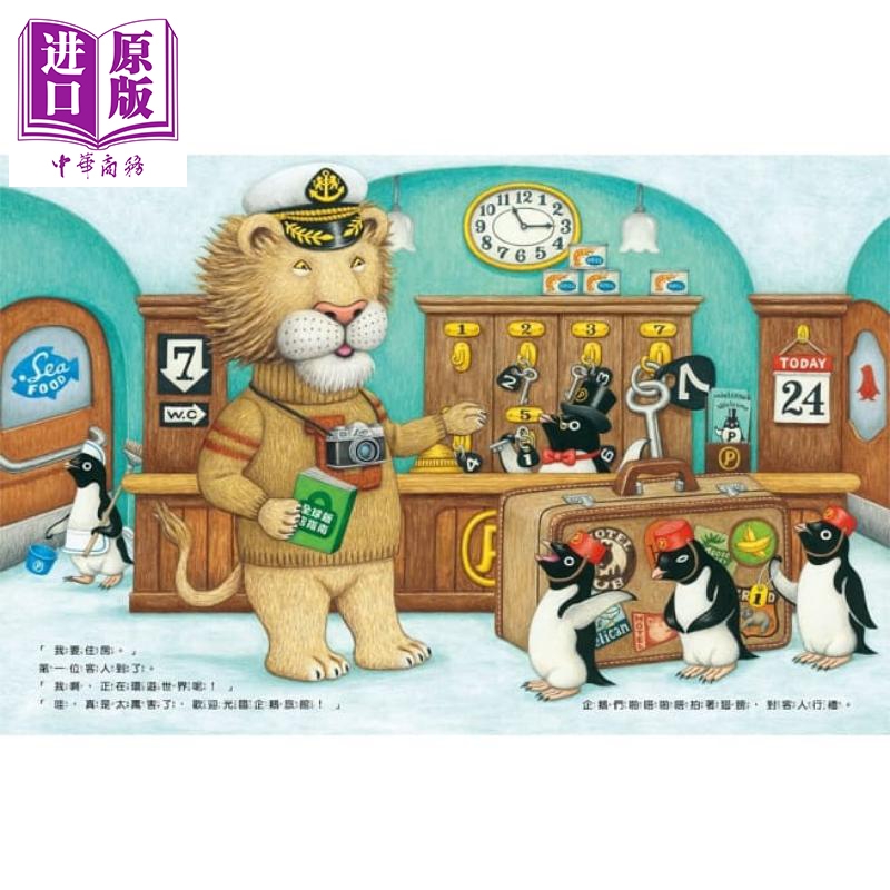 「我要住房!」第一位客人上门了,这位狮子观光客计画环游世界呢!只见他拿着《旅馆指南》,脖子上挂着相机,他从柜台服务员手中接过1号房的钥匙,三只小企鹅便摇摇晃晃的将大行李搬进客房。