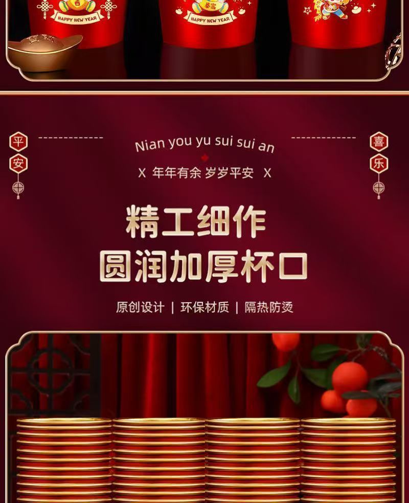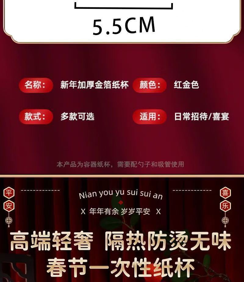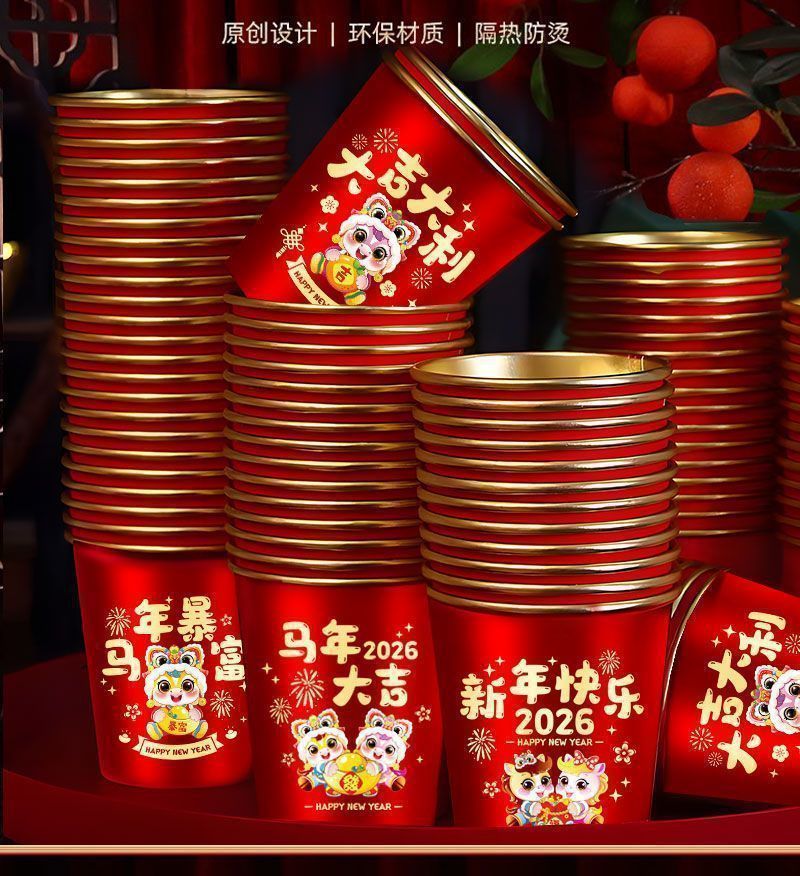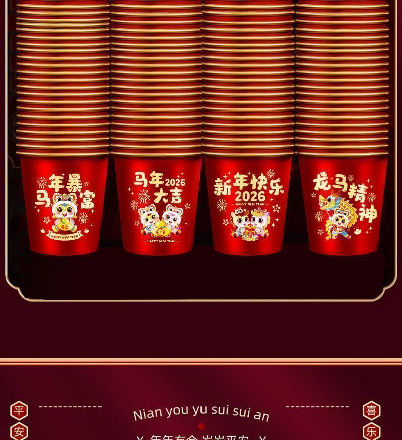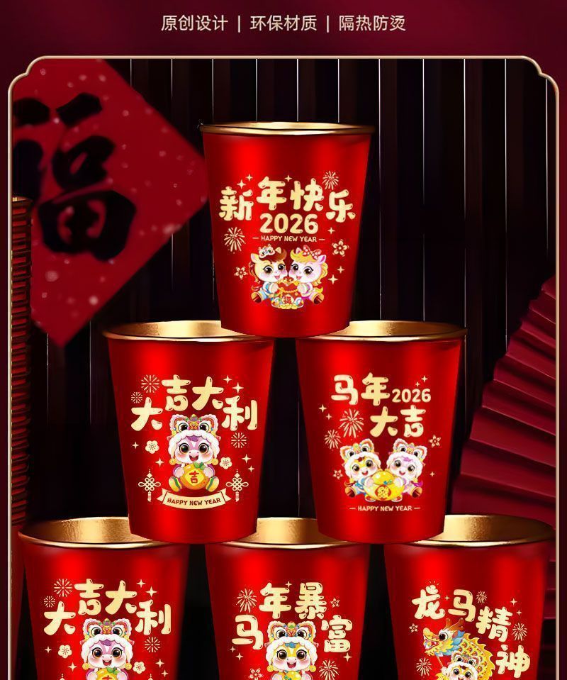 超值200个【喜迎马年❗新年纸杯】2026春节纸杯加厚一次性新年贺岁过年金箔水杯家用耐高温春节。rg
