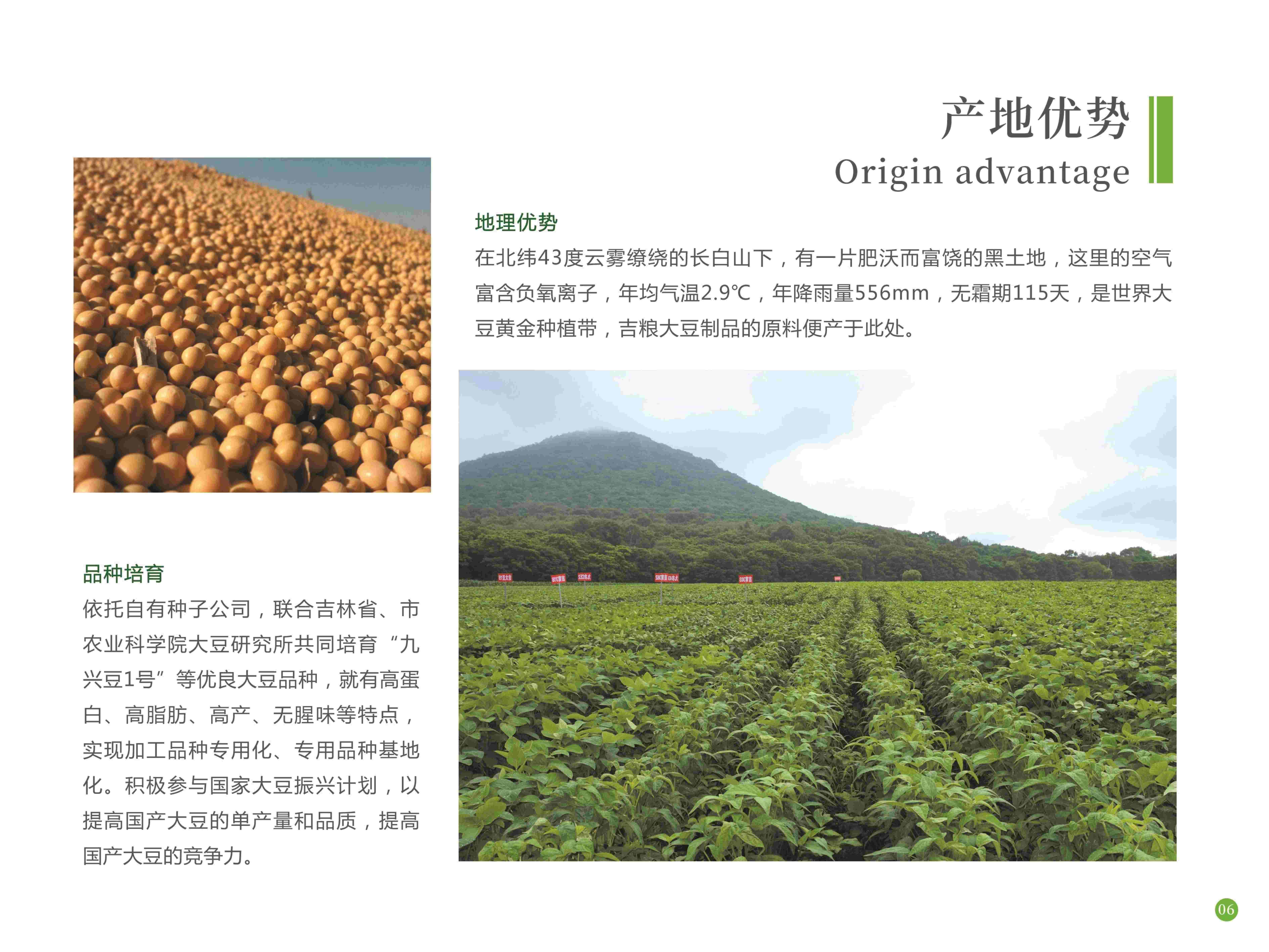 位于长白山脚下、松花江畔的有机认证大豆种植基地,世界上最好的大豆产区之一,“捏把黑土冒油花,插双筷子也发芽”,风景秀丽、天然矿泉水灌溉。吉林省桦甸市,四季分明,春季干燥多风,夏季炎热多雨,秋季秋高气爽,冬季严寒漫长,为有机种植奠定了自然基础