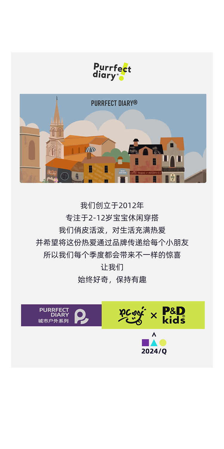 - Purrfect-Diary专注于贴近自然随性的穿着概念,轻奢平价的童装文化传播,在产品设计上更加注重婴童穿着的舒适性、安全性、更出众的国际化品牌,将欧美的育婴文化在中国进行深入的传播与推广。