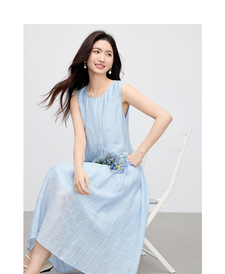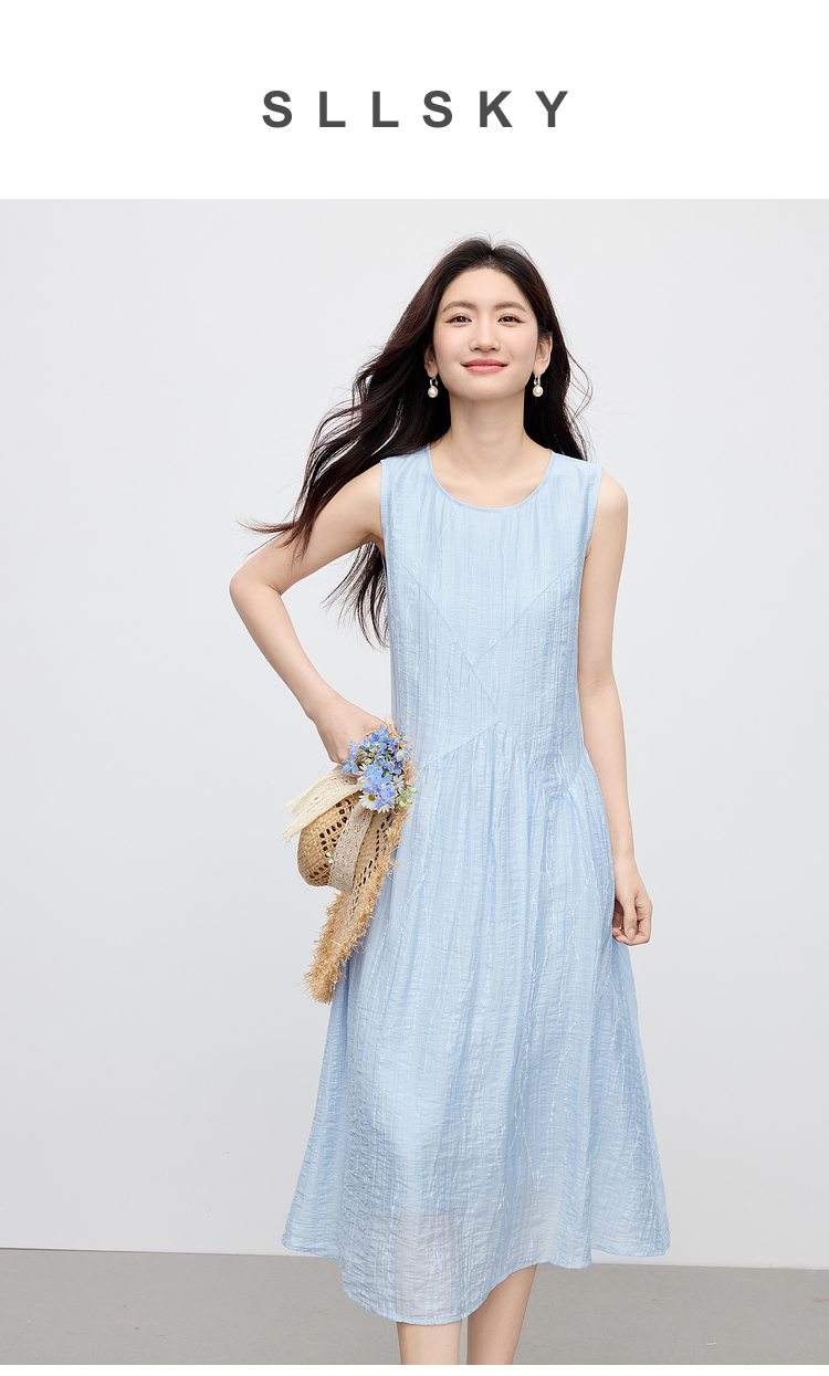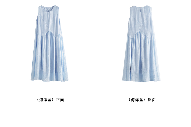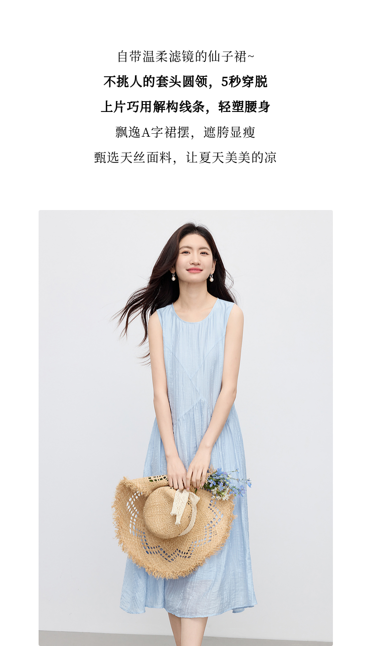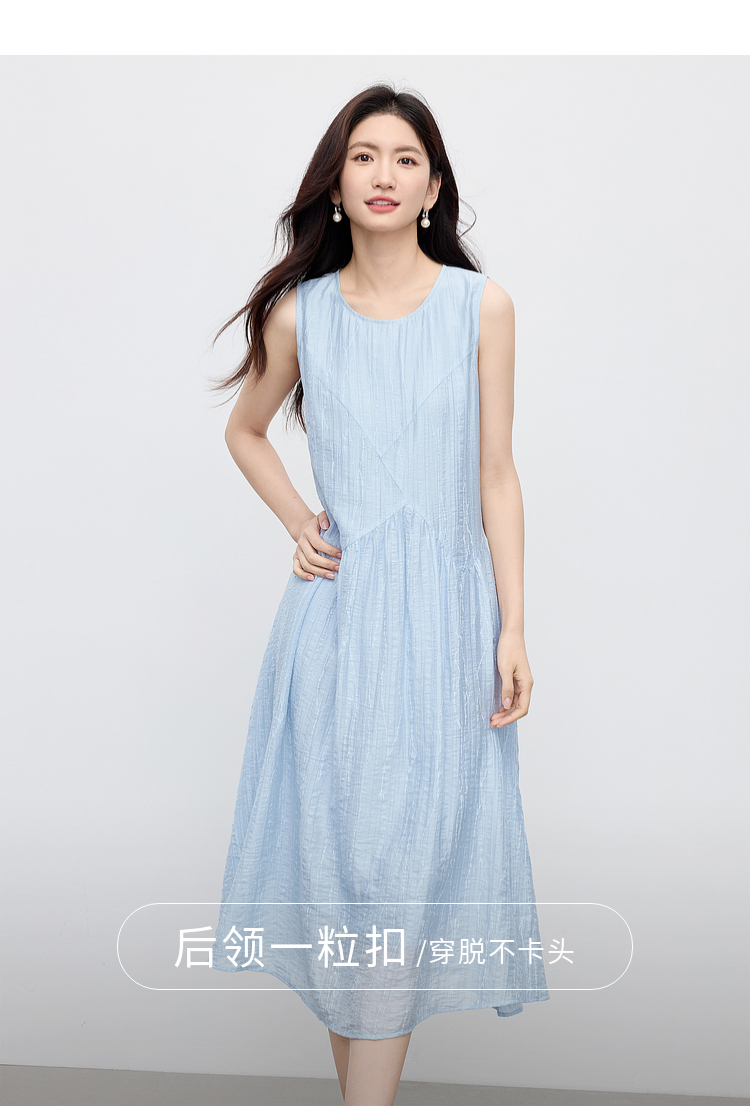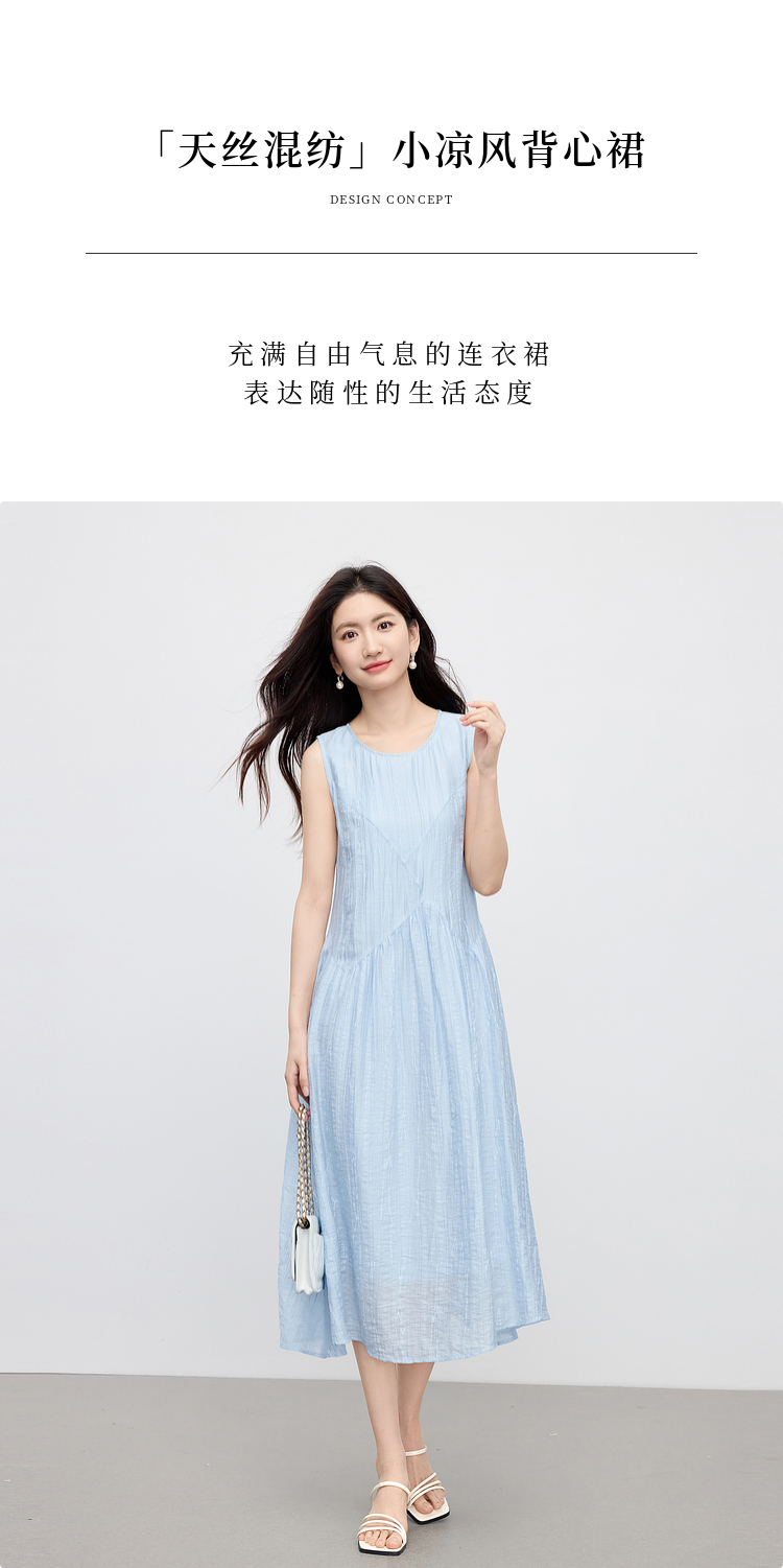 【周末秒杀】熙世界莱赛尔蓝色背心连衣裙女夏季新款气质圆领法式度假无袖裙子