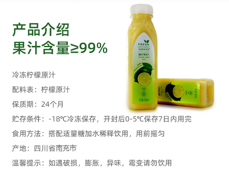 【快报推荐】100%冷冻柠檬汁320ml香水柠檬汁 扬雅冷冻柠檬汁 柠檬原汁