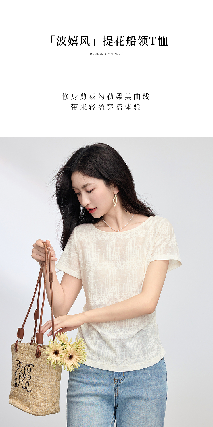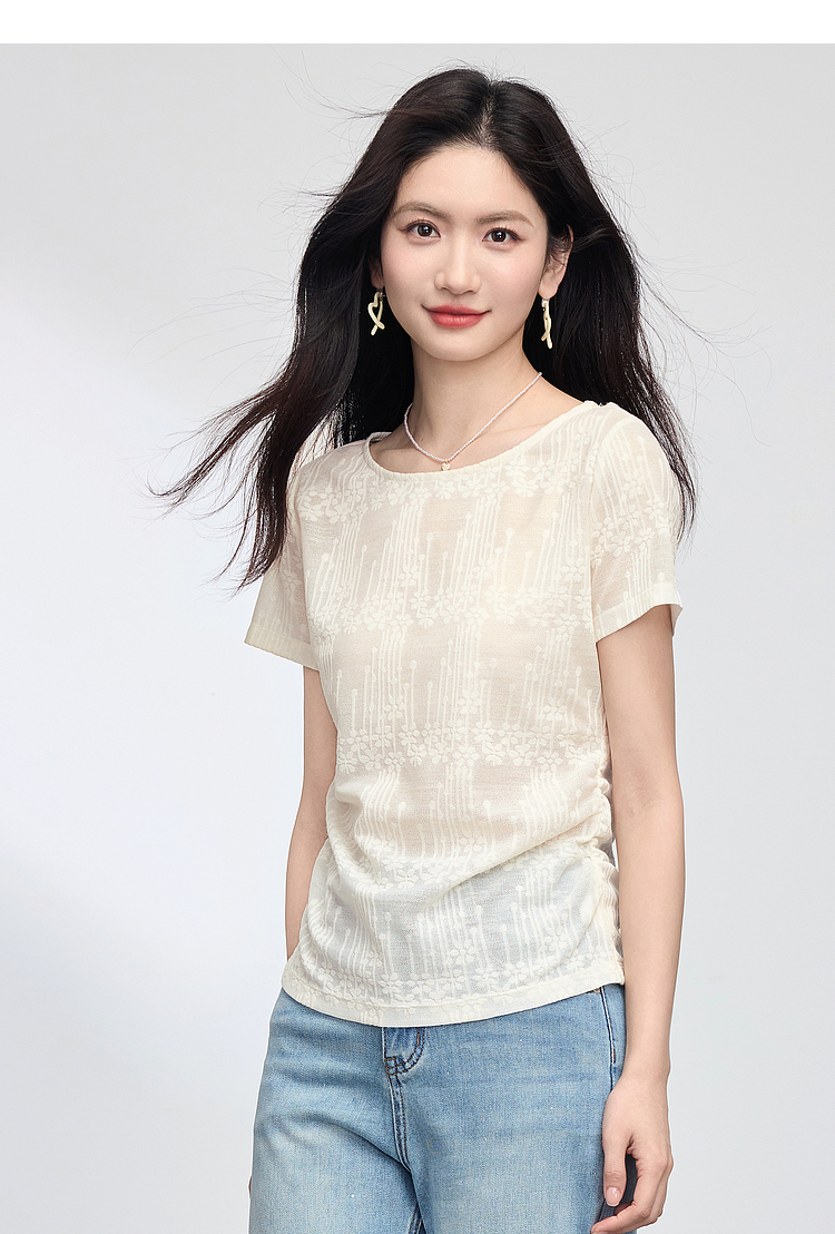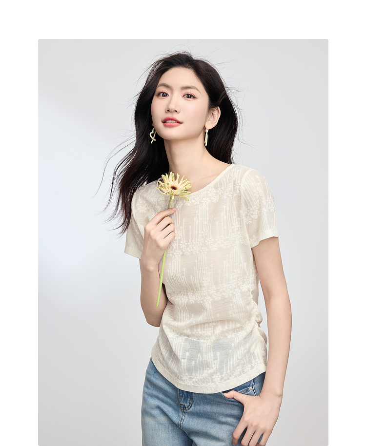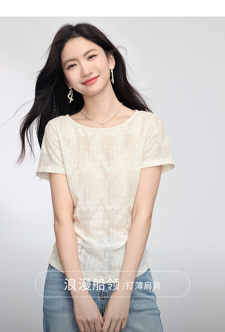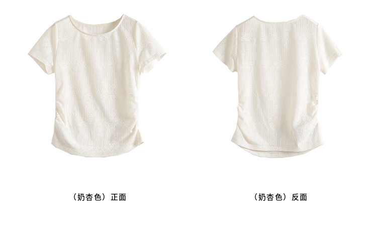 【周四狂欢价】熙世界波嬉风抽褶收腰T恤女短袖夏季新款设计感船领提花显瘦上衣